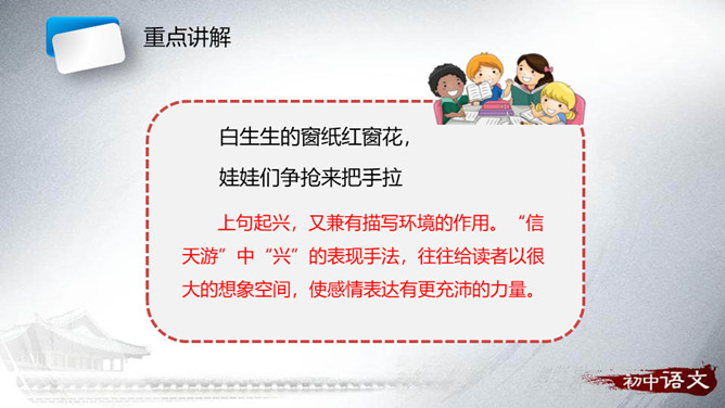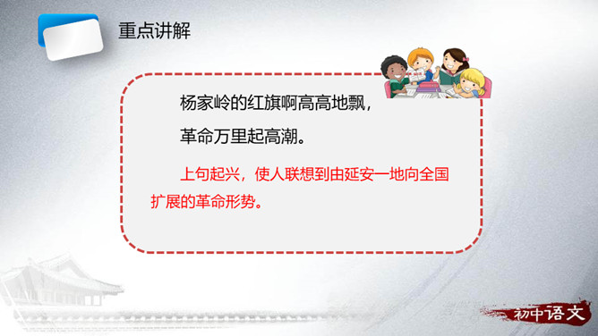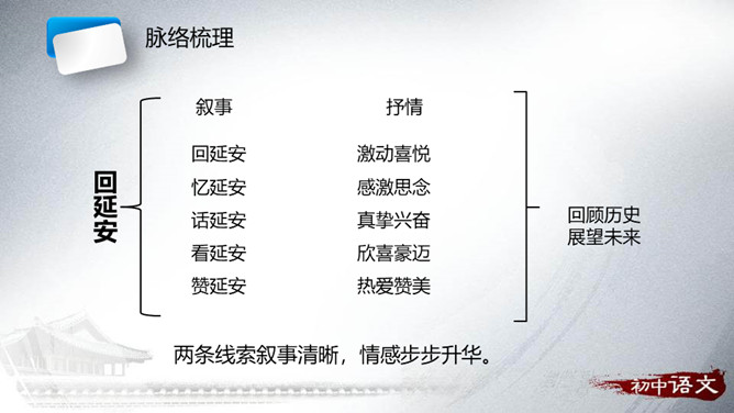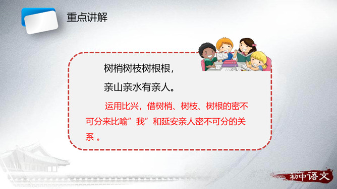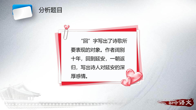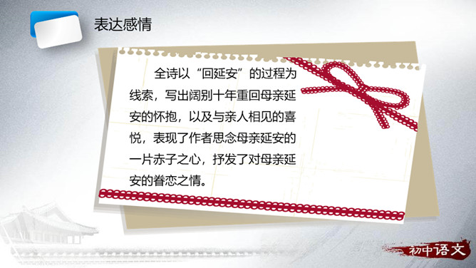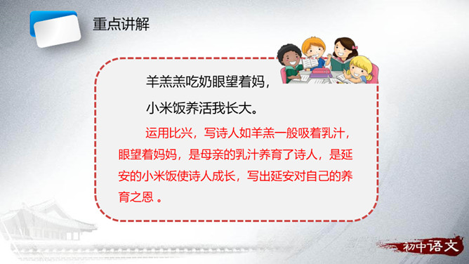 “回”字写出了诗歌所要表现的对象。作者阔别十年,回到延安,一朝返归,写出诗人对延安的深厚感情。运用比兴,借树梢、树枝、树根的密不可分来比喻”我”和延安亲人密不可分的关系 。运用比兴,写诗人如羊羔一般吸着乳汁,眼望着妈妈,是母亲的乳汁养育了诗人,是延安的小米饭使诗人成长,写出延安对自己的养育之恩 。上句起兴,使人联想到由延安一地向全国扩展的革命形势。全诗以“回延安”的过程为线索,写出阔别十年重回母亲延安的怀抱,以及与亲人相见的喜悦,表现了作者思念母亲延安的一片赤子之心,抒发了对母亲延安的眷恋之情。所属专题:回延安ppt。