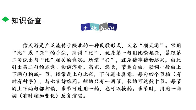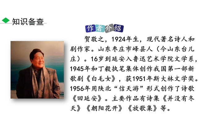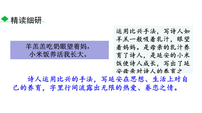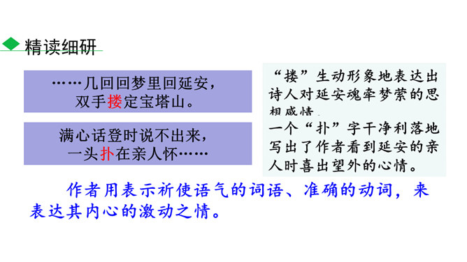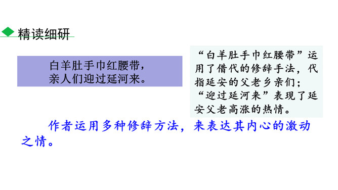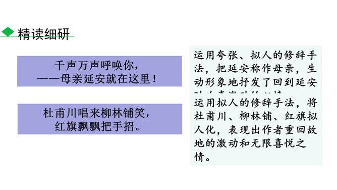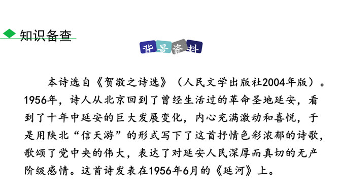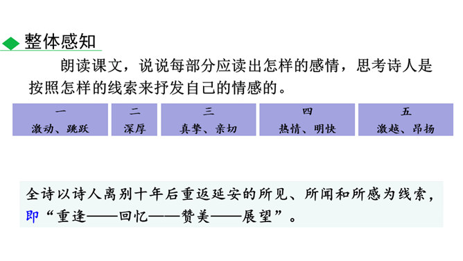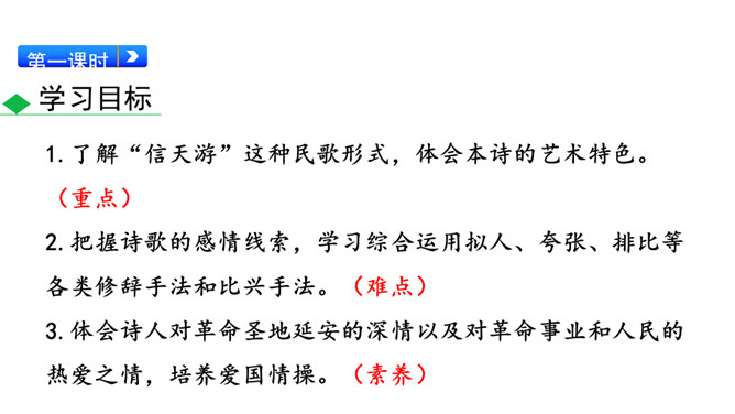 了解“信天游”这种民歌形式,体会本诗的艺术特色。把握诗歌的感情线索,学习综合运用拟人、夸张、排比等各类修辞手法和比兴手法。体会诗人对革命圣地延安的深情以及对革命事业和人民的热爱之情,培养爱国情操。感悟一:延安是历史的教科书,也是中华民族取之不尽的精神宝藏,值得我们去钻研。让我们发扬“延安精神”,刻苦学习,为祖国建设献策献力。感悟二:想象是灵感的源泉,想象使我们超越现实,走向更加美好的明天,创造无限的可能;想象使我们实中见虚,使我们从现在看到未来。有了丰富的想象,我们的文章才能更有诗意和激情。所属专题:回延安ppt。