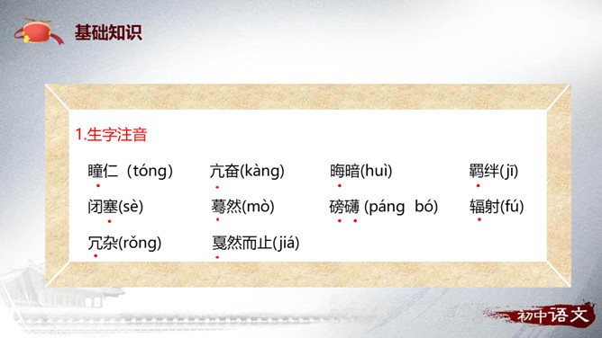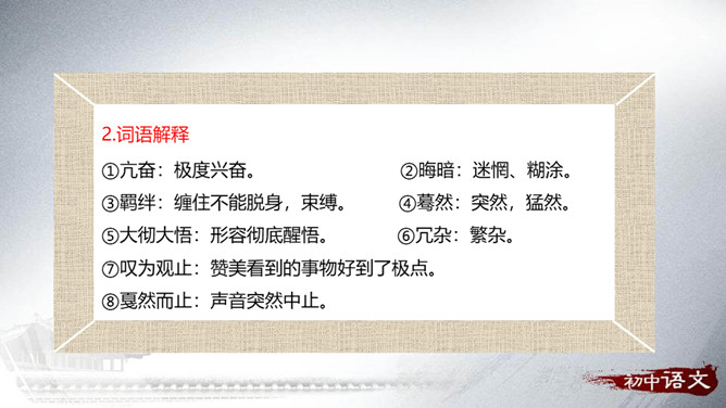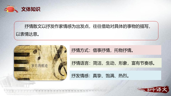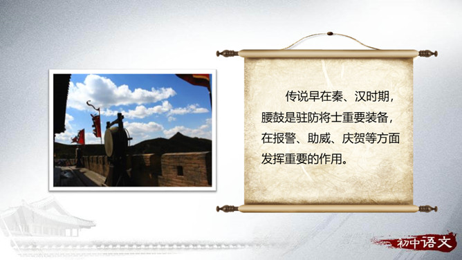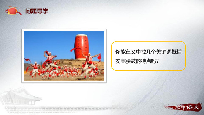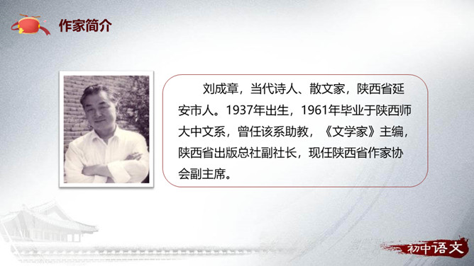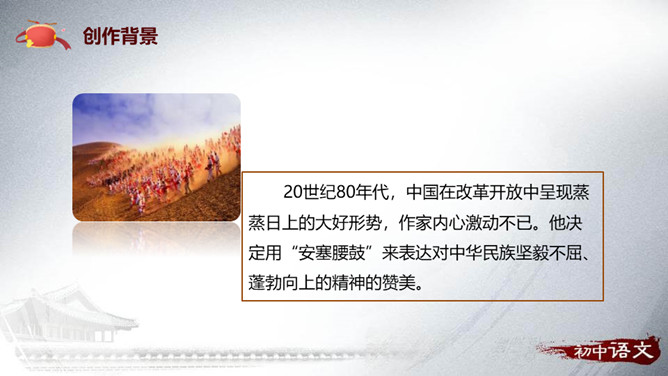 安塞区位于陕西省延安市的北部,属典型的黄土高原地貌,历史上是军事重镇。传说早在秦、汉时期,腰鼓是驻防将士重要装备,在报警、助威、庆贺等方面发挥重要的作用。刘成章,当代诗人、散文家,陕西省延安市人。1937年出生,1961年毕业于陕西师大中文系,曾任该系助教,《文学家》主编,陕西省出版总社副社长,现任陕西省作家协会副主席。抒情散文以抒发作家情感为出发点,往往借助对具体的事物的描写,以表情达意。抒情方式:借事抒情,托物抒情。抒情语言:简洁,生动,形象,富有节奏感。抒发情感:真挚、饱满、热烈。所属专题:安塞腰鼓ppt。