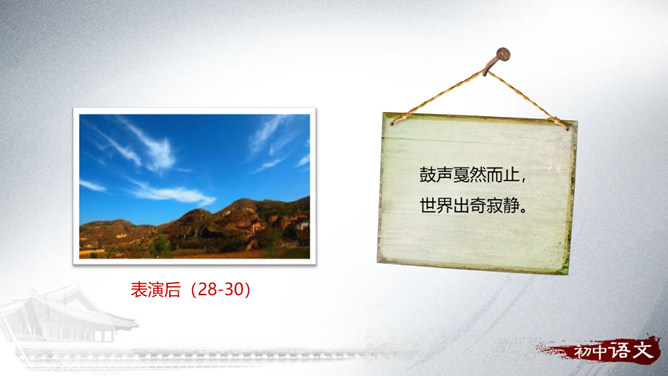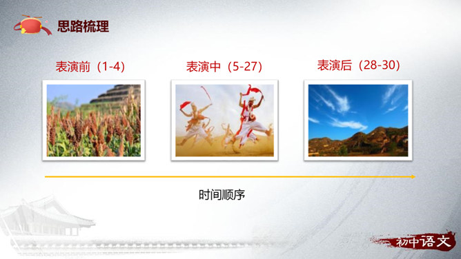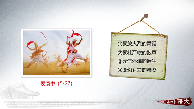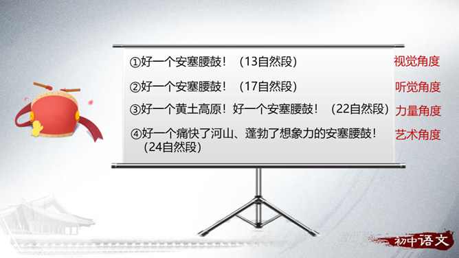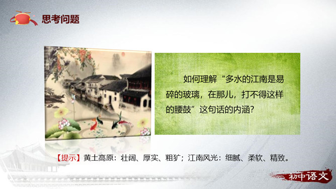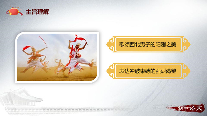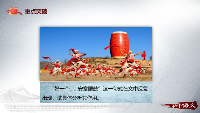 1.梳理文章的思路。2.理解重点句子的表达作用。3.理解文章的中心思想。“好一个……安塞腰鼓”这一句式在文中反复出现,试具体分析其作用。歌颂西北男子的阳刚之美。表达冲破束缚的强烈渴望。如何理解“多水的江南是易碎的玻璃,在那儿,打不得这样的腰鼓”这句话的内涵?黄土高原:壮阔、厚实、粗犷;江南风光:细腻、柔软、精致。所属专题:安塞腰鼓ppt。