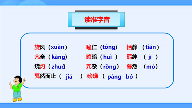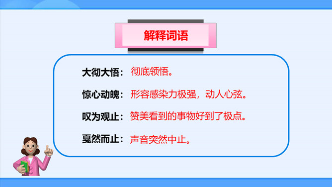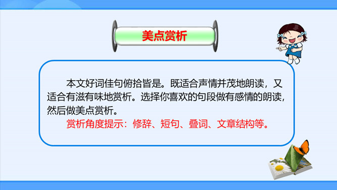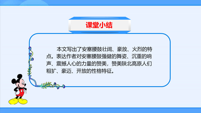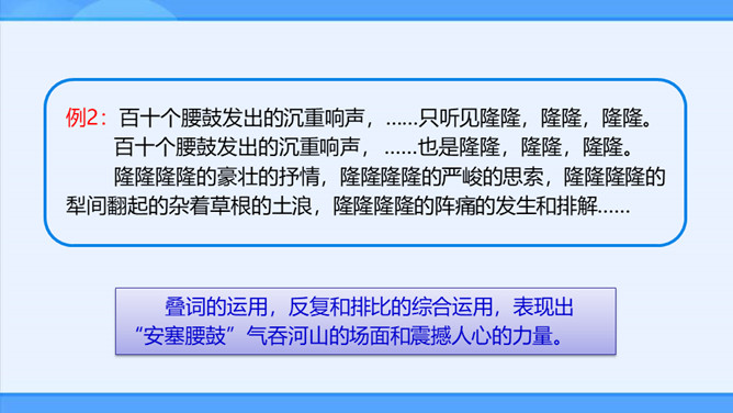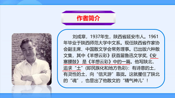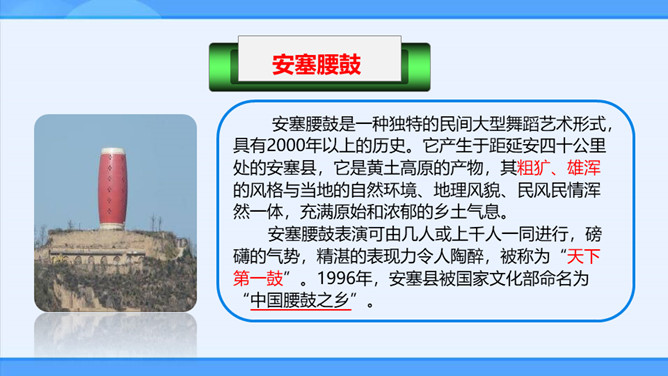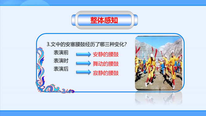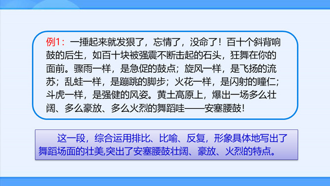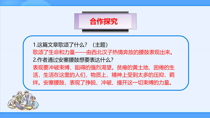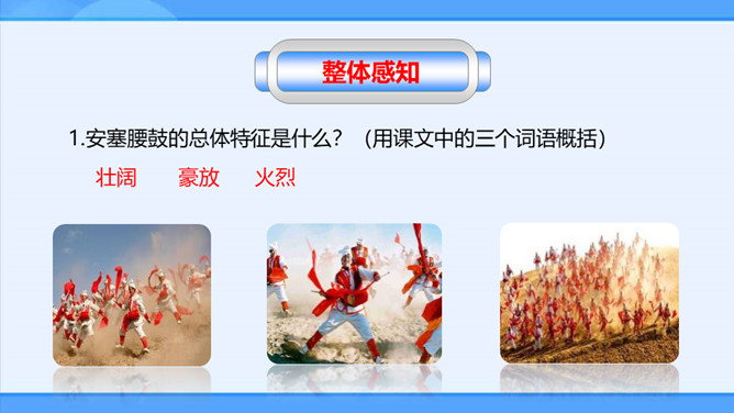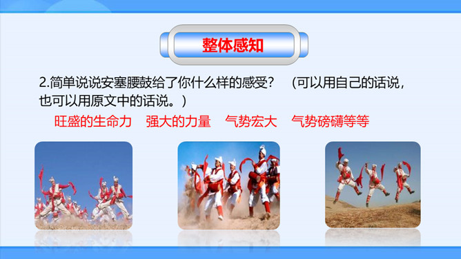 1.这篇文章歌颂了什么?(主题)歌颂了生命和力量——由西北汉子热情奔放的腰鼓表现出来。2.作者通过安塞腰鼓想要表达什么?表现要冲破束缚、阻碍的强烈渴望。贫瘠的黄土地、困倦的生活,生活在这里的人们,物质上、精神上受到太多的压抑、羁绊。安塞腰鼓,表现了挣脱、冲破、撞开这一切束缚的力量。本文好词佳句俯拾皆是。既适合声情并茂地朗读,又适合有滋有味地赏析。选择你喜欢的句段做有感情的朗读,然后做美点赏析。赏析角度提示:修辞、短句、叠词、文章结构等。