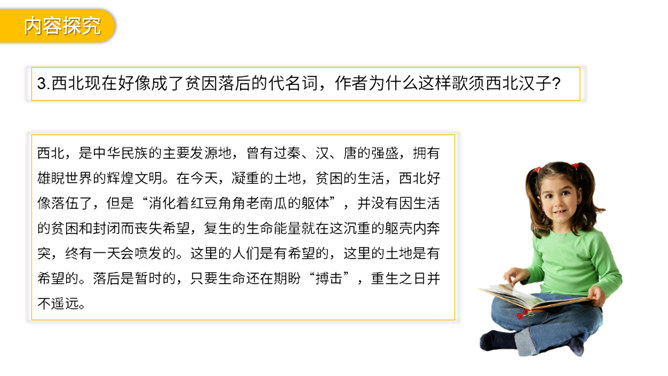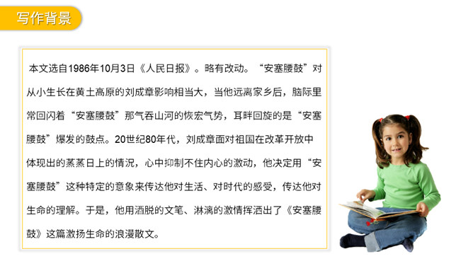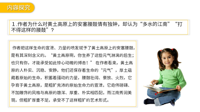 作者为什么对黄土高原上的安塞腰鼓情有独钟,却认为“多水的江南”“打不得这样的腰鼓”?作者把这样生命的宣泄、力量的喷发赋予了黄土高原上的安塞腰鼓,是有其深刻含义的。“黄土高原啊,你生养了这些元气淋漓的后生;也只有你,才能承受如此惊心动魄的搏击!” 在作者看来,黄土高原的人朴实、沉稳、安静,他们还保存着生命的“元气”,厚土蕴藏着原始的生命,积蓄着骚动的力量,腰鼓壮阔、豪放、火烈,它孕育于黄土高原,是粗犷充沛的原始生命力的宣泄,它奇伟磅礴、不加雕饰的风格与高原的雄浑、厚重、朴实相匹配。