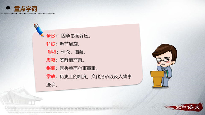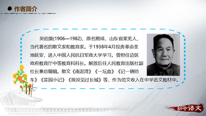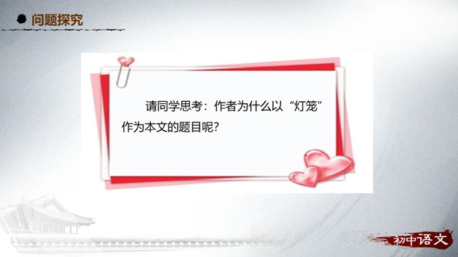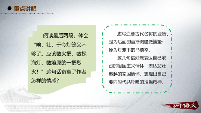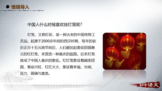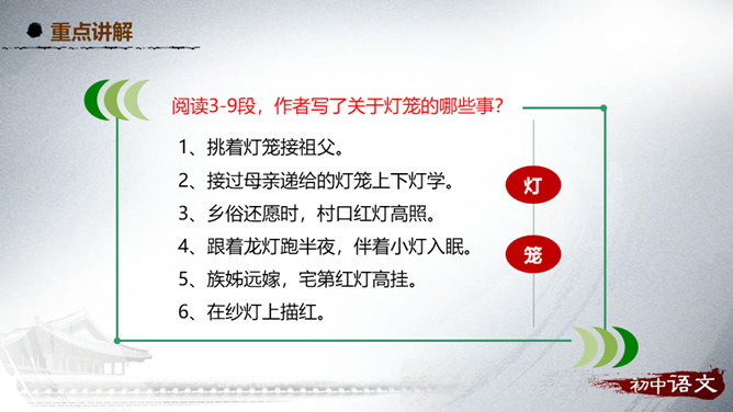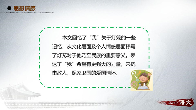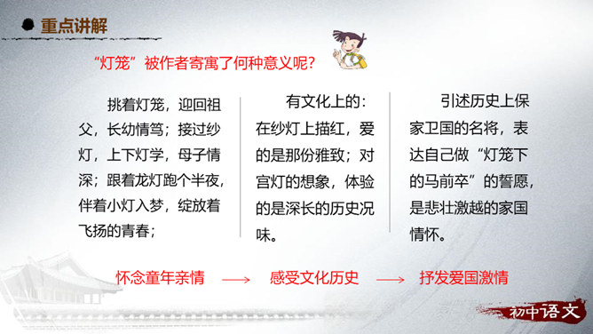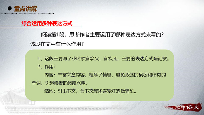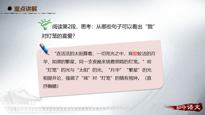 阅读第1段,思考作者主要运用了哪种表达方式来写的?该段在文中有什么作用?1、这段主要写了小时候喜欢火,喜欢光。主要的表达方式是记叙。2、作用:内容:丰富文章内容,增添了情趣,避免叙述的呆板和结构的单调,引起读者的阅读兴趣。结构:引出下文,为下文叙述喜爱灯笼做铺垫。阅读第2段,思考:从哪些句子可以看出“我”对灯笼的喜爱?连活活的太阳算着,一切亮光之中,我爱皎洁的月华,如沸的繁星,同一支夜晚来挑着照路的灯笼。”将“灯笼”的光与“太阳”的光、“月华”“繁星”的光相提并论,强调了“我”对“灯笼”的情有独钟。所属专题:灯笼ppt。