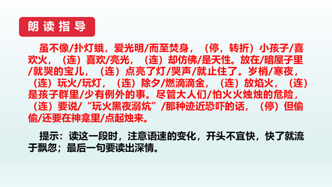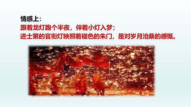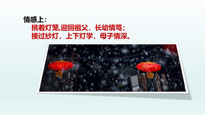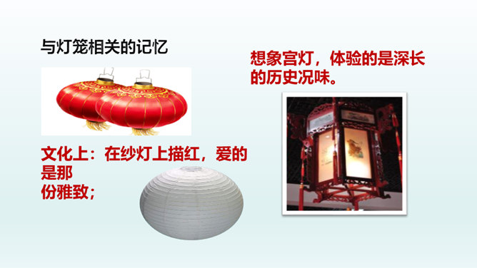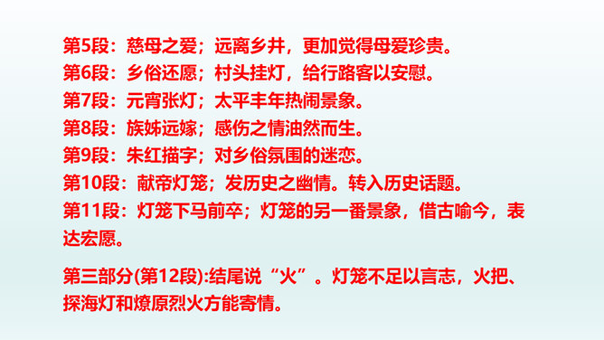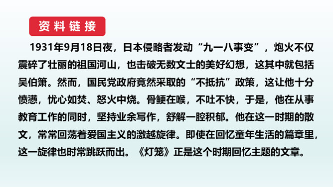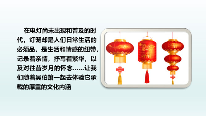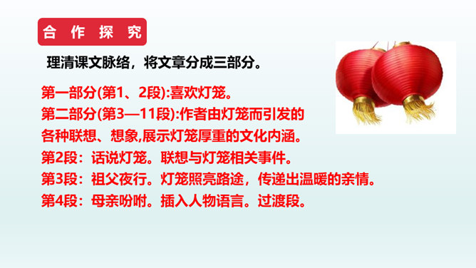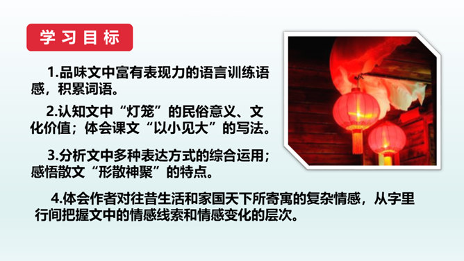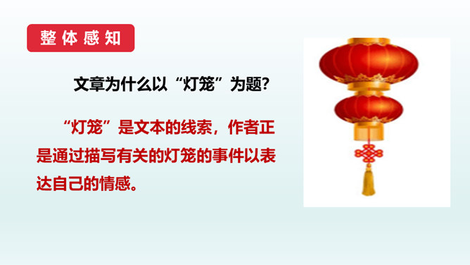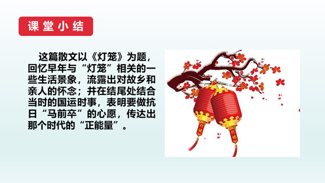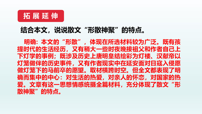 结合本文,说说散文“形散神聚”的特点。明确: 本文的“形散”,体现在所选材料较为广泛。既有孩提时代的生活经历,又有稍大一些时夜晚接祖父和作者自己上下灯学的事例;既涉及历史上唐明皇结绘彩为灯楼、汉献帝以灯笼做伴的历史事件,又有作者现实中在延安面对日寇入侵愿做灯笼下的马前卒的愿望。取材横跨时空。但全文都表现了明确而集中的中心:对生活的热爱,对亲人的怀恋,对国家的热爱。文章有这一思想情感统摄全篇材料,充分体现了散文“形散神聚”的特点。所属专题:灯笼ppt。