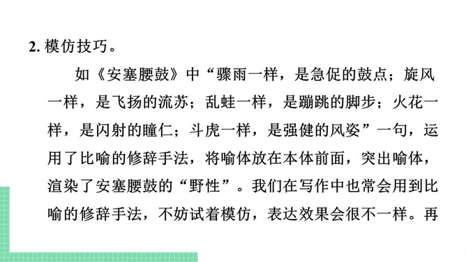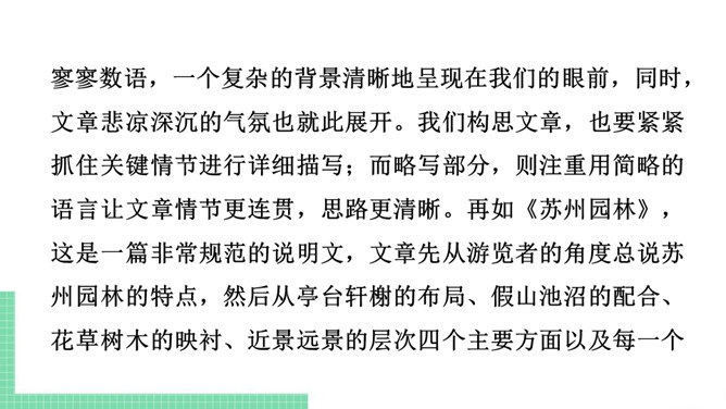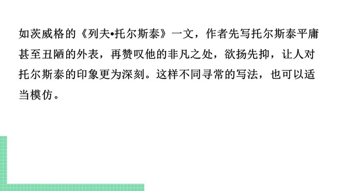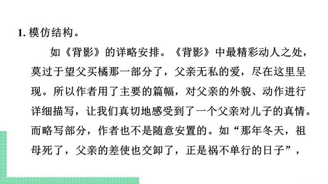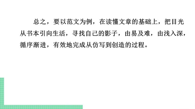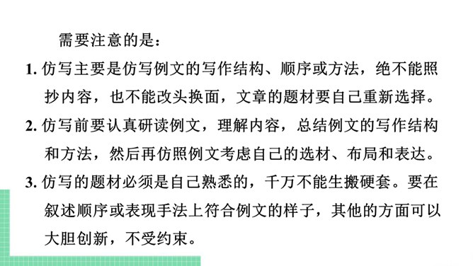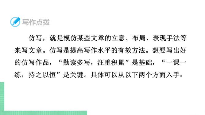 仿写,就是模仿某些文章的立意、布局、表现手法等来写文章。仿写是提高写作水平的有效方法。想要写出好的仿写作品,“勤读多写,注重积累”是基础,“一课一练,持之以恒”是关键。具体可以从以下两个方面入手:需要注意的是:1. 仿写主要是仿写例文的写作结构、顺序或方法,绝不能照抄内容,也不能改头换面,文章的题材要自己重新选择。2. 仿写前要认真研读例文,理解内容,总结例文的写作结构和方法,然后再仿照例文考虑自己的选材、布局和表达。3. 仿写的题材必须是自己熟悉的,千万不能生搬硬套。所属专题:学习仿写ppt。