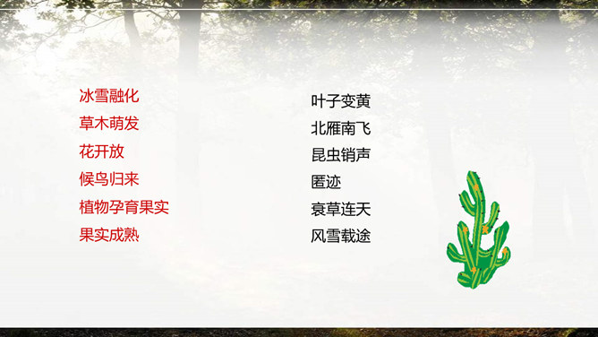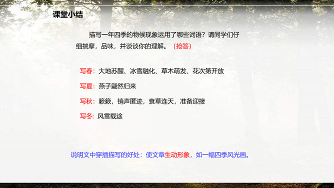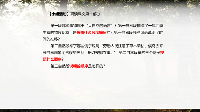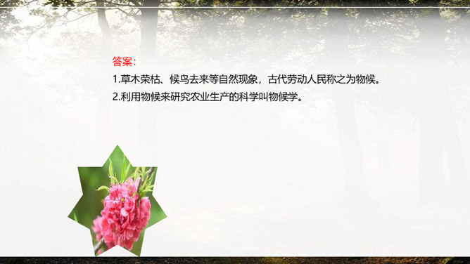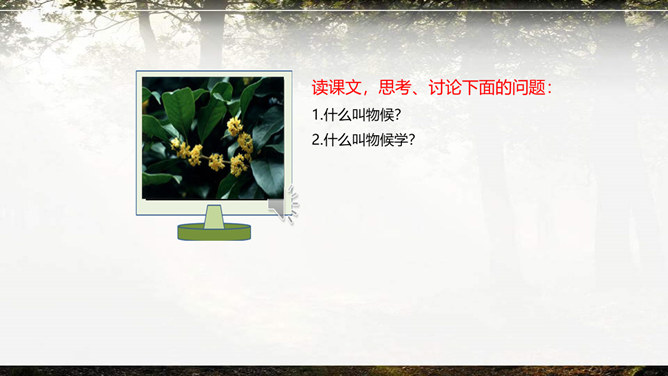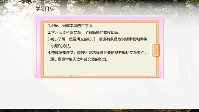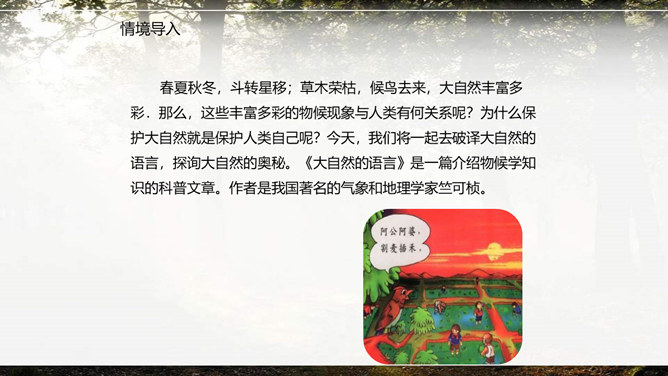 春夏秋冬,斗转星移;草木荣枯,候鸟去来,大自然丰富多彩.那么,这些丰富多彩的物候现象与人类有何关系呢?为什么保护大自然就是保护人类自己呢?今天,我们将一起去破译大自然的语言,探询大自然的奥秘。这是一篇介绍物候学知识的科普文章。作者是我国著名的气象和地理学家竺可桢。1.识记、理解本课的生字词。2.学习阅读科普文章,了解简单的物候知识。3.初步了解一些说明文的知识,掌握有条理地说明事物和举例说明的方法。4.整体感知课文,能按照要求筛选相关信息并概括文章要点,逐步提高学生阅读科普文章的能力。所属专题:大自然的语言ppt。