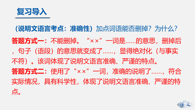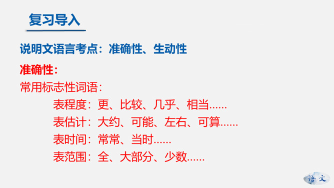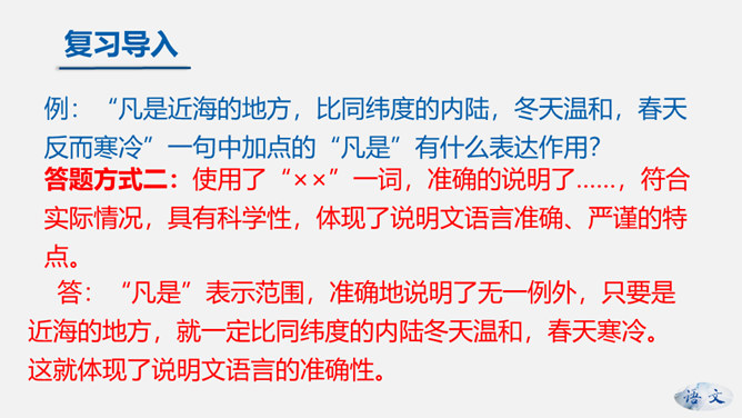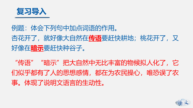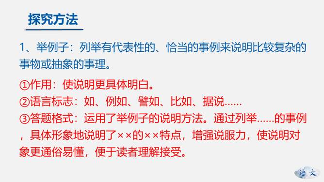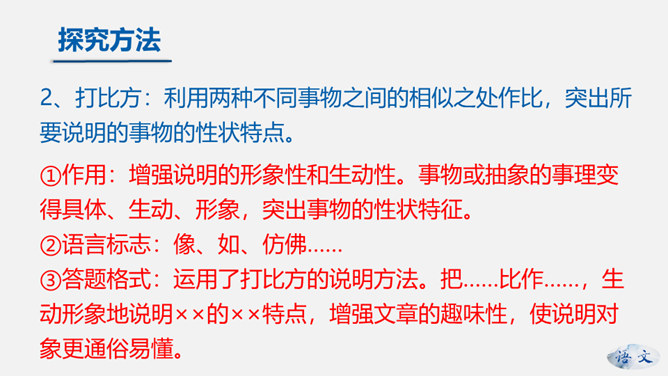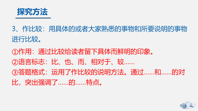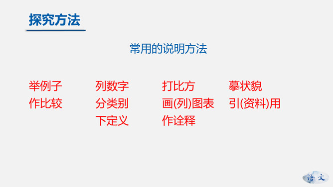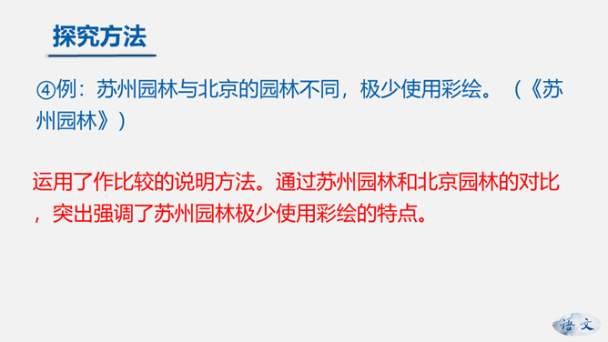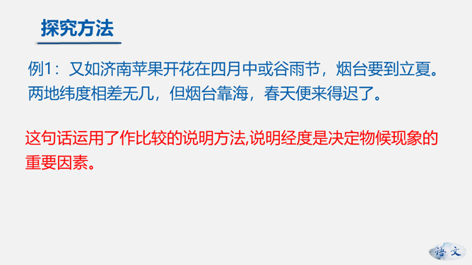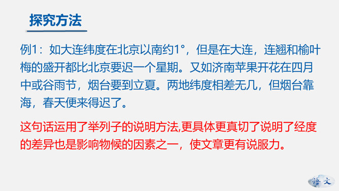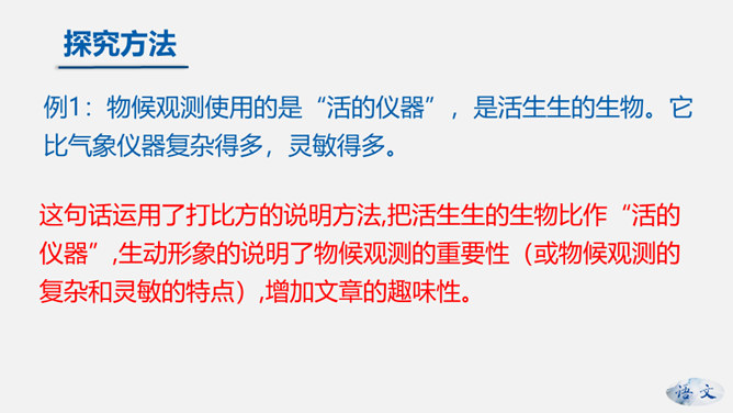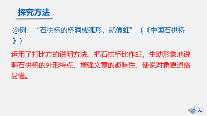 运用了举列子的说明方法,更具体更真切了说明了经度的差异也是影响物候的因素之一,使文章更有说服力。运用了打比方的说明方法。把石拱桥比作虹,生动形象地说明石拱桥的外形特点,增强文章的趣味性,使说对象更通俗易懂。这句话运用了打比方的说明方法,把活生生的生物比作“活的仪器”,生动形象的说明了物候观测的重要性(或物候观测的复杂和灵敏的特点),增加文章的趣味性。运用了作比较的说明方法。通过苏州园林和北京园林的对比,突出强调了苏州园林极少使用彩绘的特点。所属专题:大自然的语言ppt。