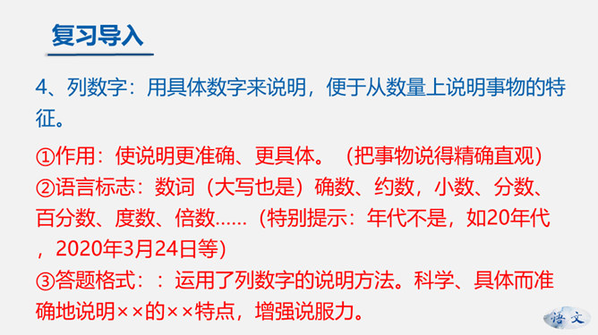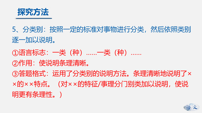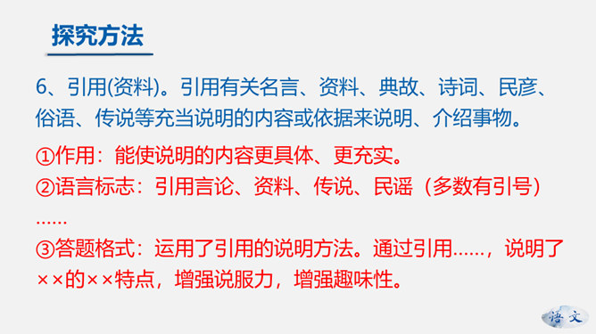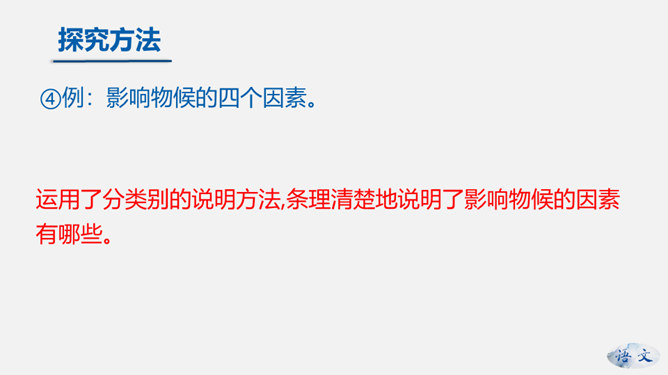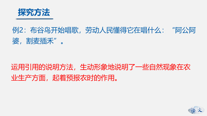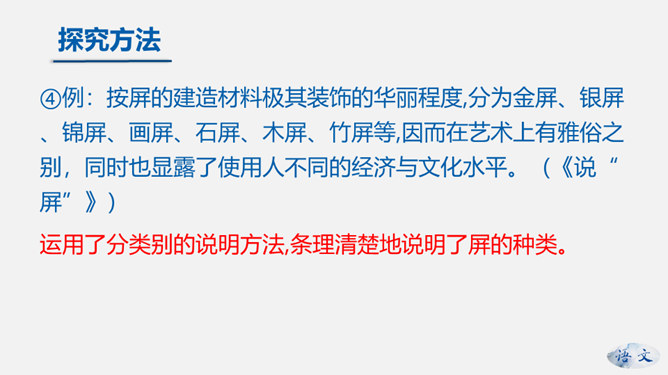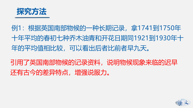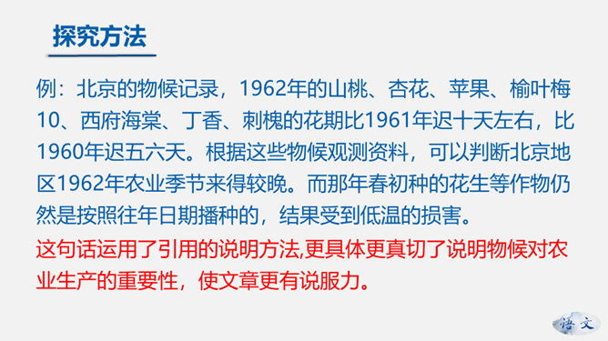 下定义、作诠释的区别。定义要求完整,即定义的对象与所下定义的外延要相等,并且要从一个方面完整地揭示概念的全部内涵;诠释并不要求完整,只要揭示概念的一部分内涵就可以了,并且解释的对象与做出的解释外延也可以不相等。①如“词是能独立运用的最小的语言单位”这个定义,可以颠倒,即说“能独立运用的最小的语言单位是词”也行;②如而“铀,是银白色的金属”则是作诠释,不能颠倒,说成“银白色的金属是铀”。运用了作诠释、举例子的说明方法。运用作诠释的说明方法,说明了逆温层的特点。所属专题:大自然的语言ppt。