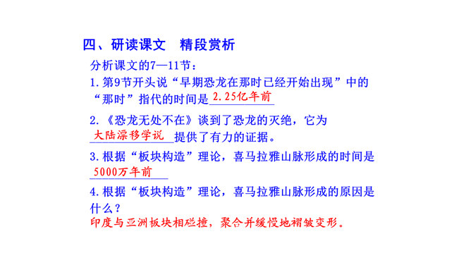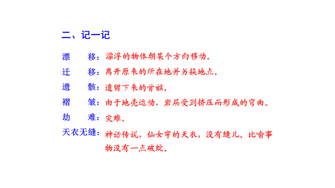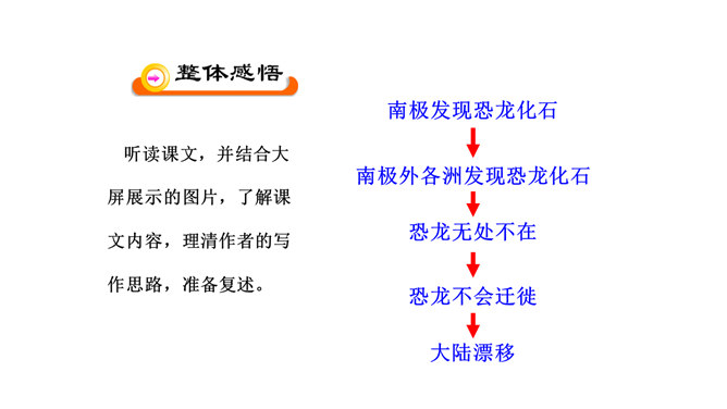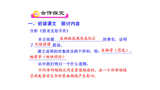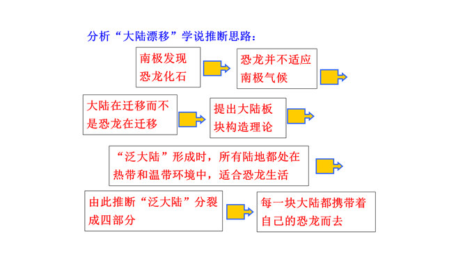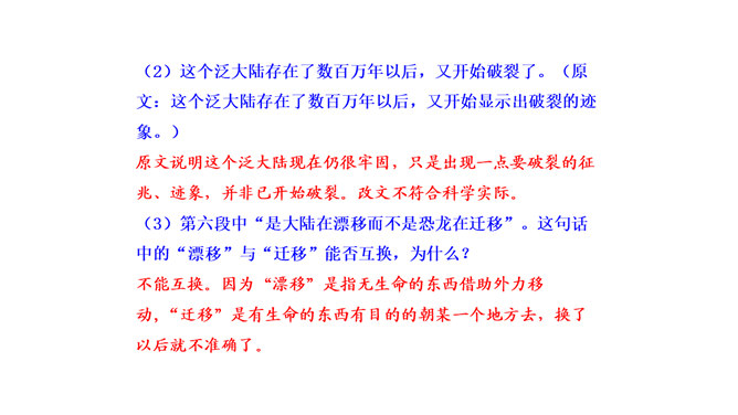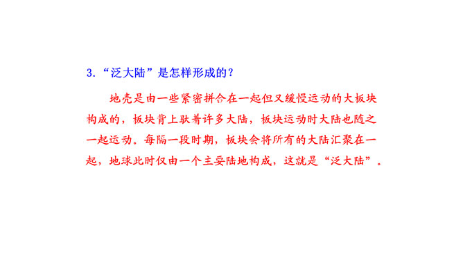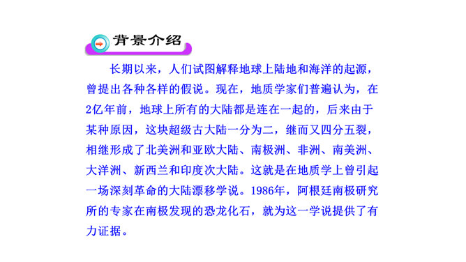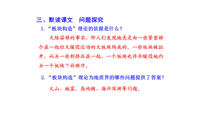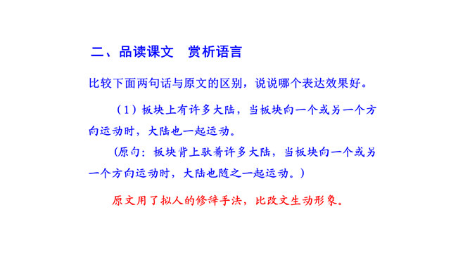 比较下面两句话与原文的区别,说说哪个表达效果好。原文用了拟人的修辞手法,比改文生动形象。原文说明这个泛大陆现在仍很牢固,只是出现一点要破裂的征兆、迹象,并非已开始破裂。改文不符合科学实际。不能互换。因为“漂移”是指无生命的东西借助外力移动,“迁移”是有生命的东西有目的的朝某一个地方去,换了以后就不准确了。“板块构造”理论的依据是什么?大陆漂移的事实,即人们发现地壳是由一些紧密拼合在一起但又缓慢运动的大板块构成的。一些板块被拉开,而另一些则挤压在一起,一个板块也许会缓慢地向另一个板块下面俯冲。所属专题:阿西莫夫短文两篇ppt。