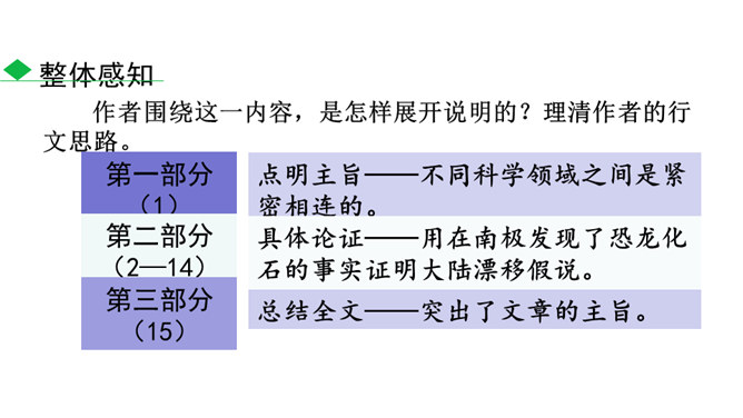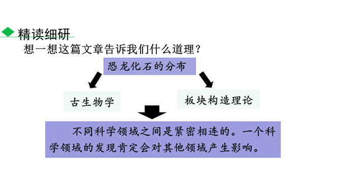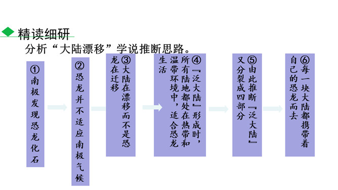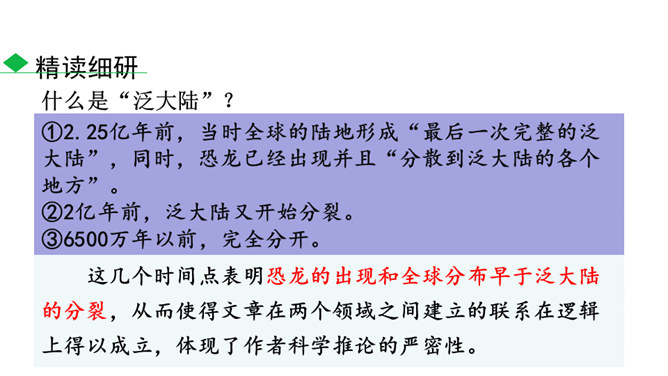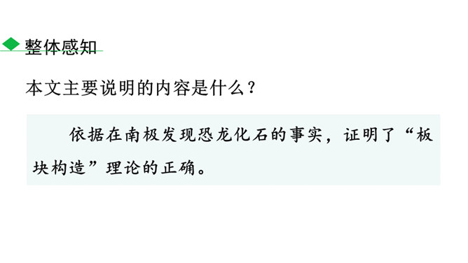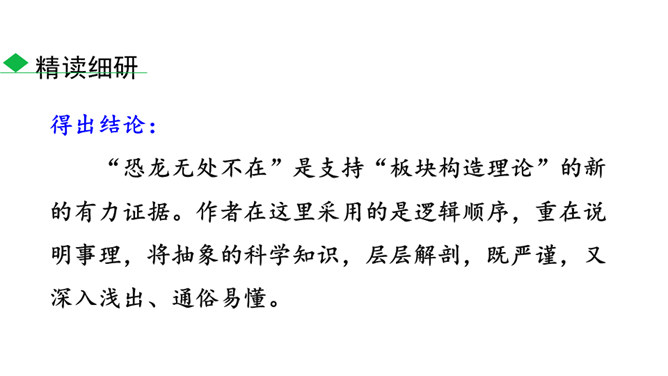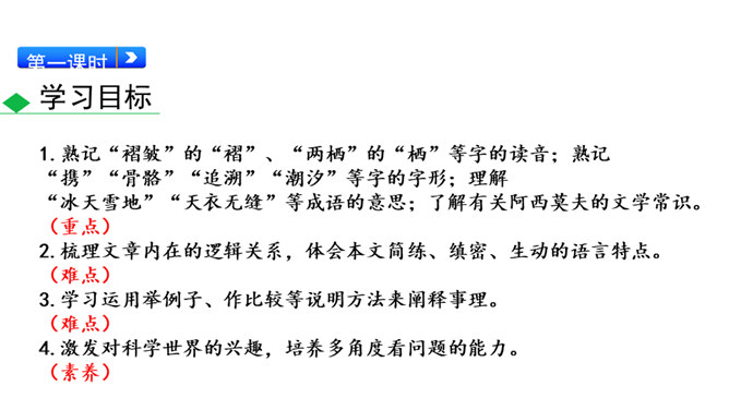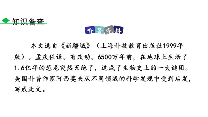 学习目标:1.熟记“褶皱”的“褶”、“两栖”的“栖”等字的读音;熟记“携”“骨骼”“追溯”“潮汐”等字的字形;理解“冰天雪地”“天衣无缝”等成语的意思;了解有关阿西莫夫的文学常识。(重点)2.梳理文章内在的逻辑关系,体会本文简练、缜密、生动的语言特点。(难点)3.学习运用举例子、作比较等说明方法来阐释事理。(难点)4.激发对科学世界的兴趣,培养多角度看问题的能力。(素养)同学们知道恐龙吗?这种我们只在影视资料里见过的生物真的存在过吗?今天,让我们跟随阿西莫夫的脚步一探究竟。所属专题:阿西莫夫短文两篇ppt。