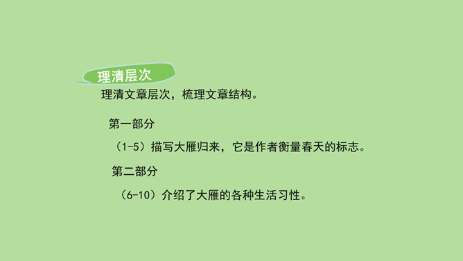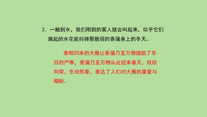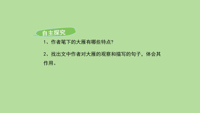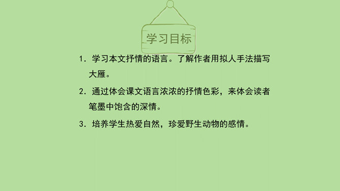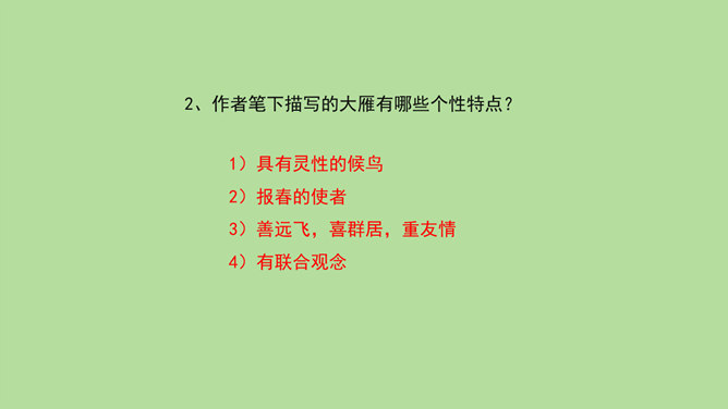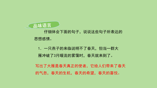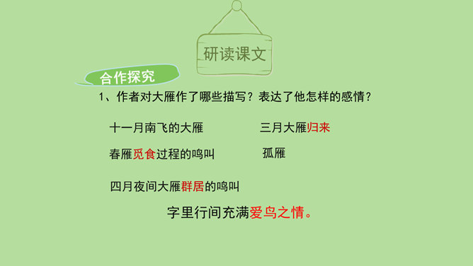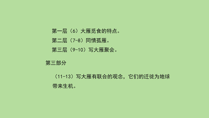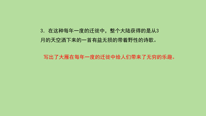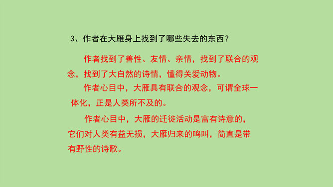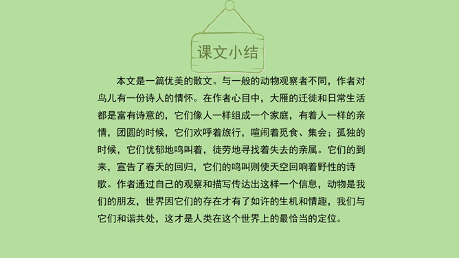 本文是一篇优美的散文。与一般的动物观察者不同,作者对鸟儿有一份诗人的情怀。在作者心目中,大雁的迁徙和日常生活都是富有诗意的,它们像人一样组成一个家庭,有着人一样的亲情,团圆的时候,它们欢呼着旅行,喧闹着觅食、集会;孤独的时候,它们忧郁地鸣叫着,徒劳地寻找着失去的亲属。它们的到来,宣告了春天的回归,它们的鸣叫则使天空回响着野性的诗歌。作者通过自己的观察和描写传达出这样一个信息,动物是我们的朋友,世界因它们的存在才有了如许的生机和情趣,我们与它们和谐共处,这才是人类在这个世界上的最恰当的定位。所属专题:大雁归来ppt。