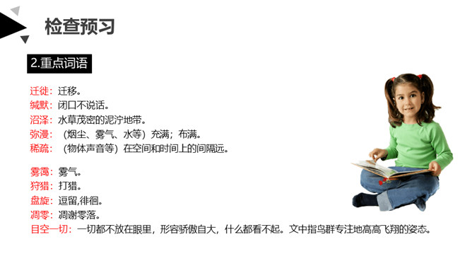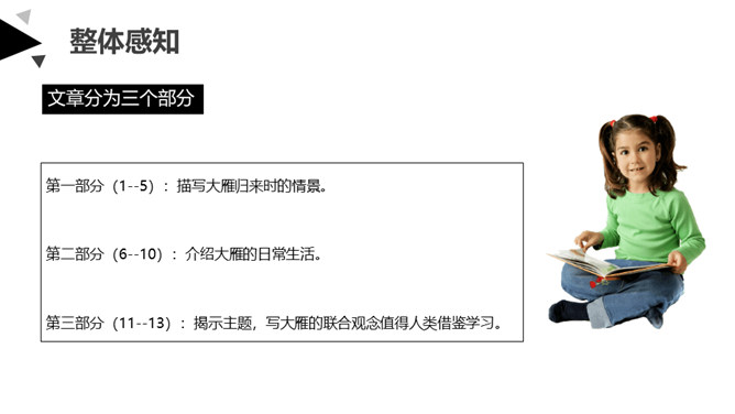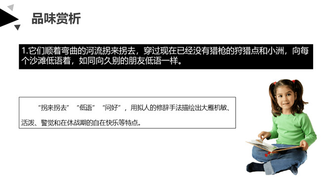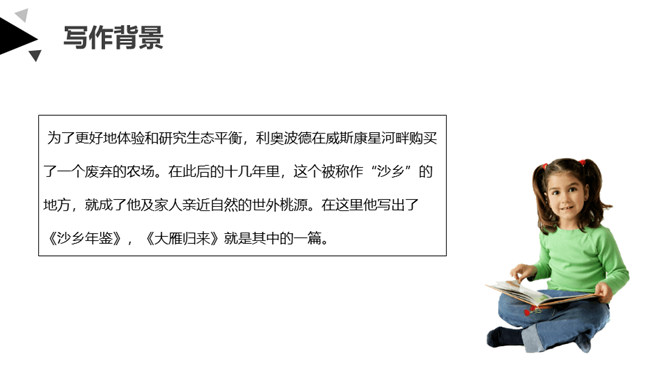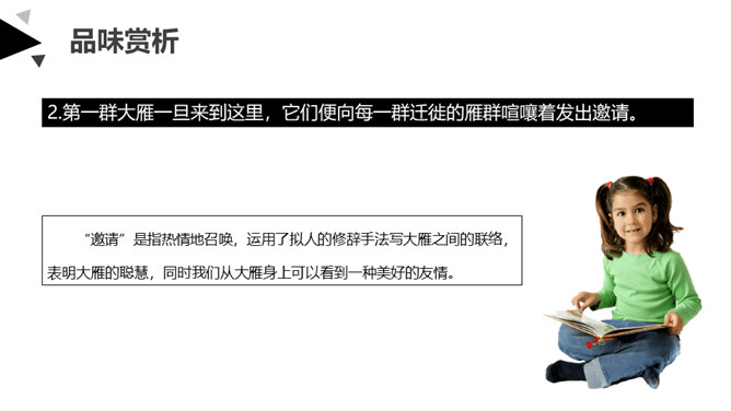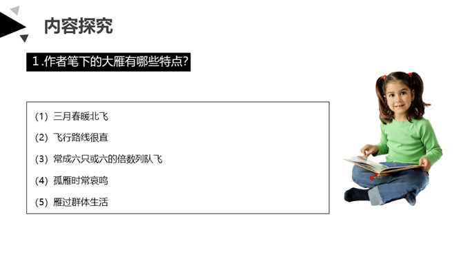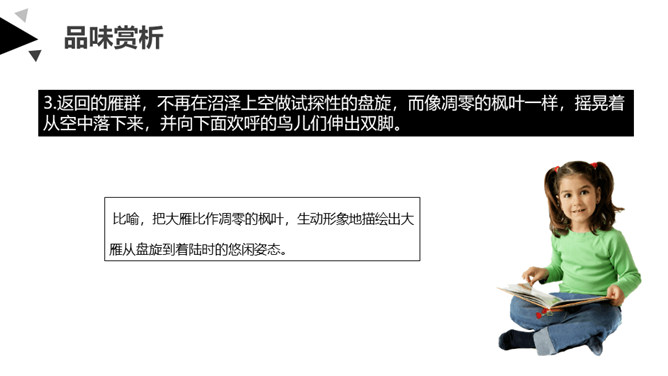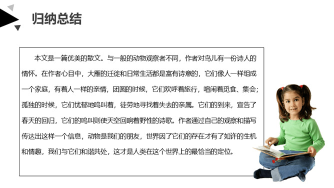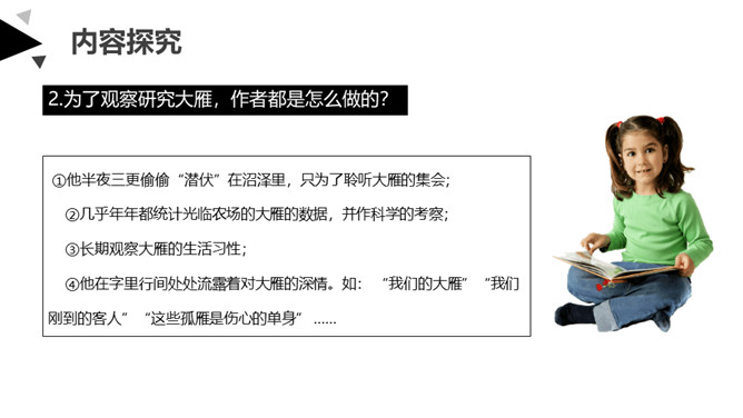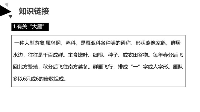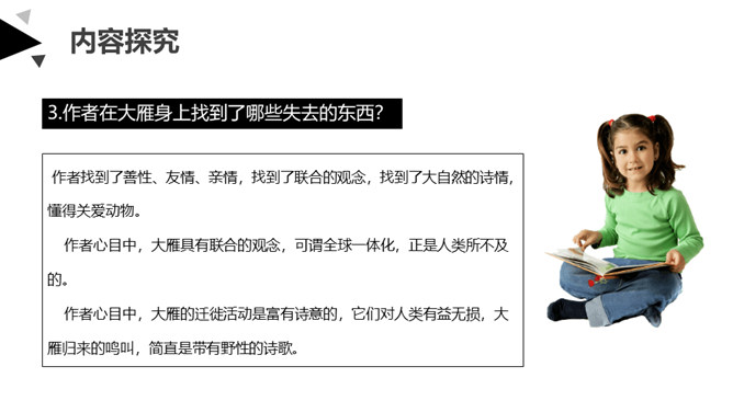 作者在大雁身上找到了哪些失去的东西?作者找到了善性、友情、亲情,找到了联合的观念,找到了大自然的诗情,懂得关爱动物。作者心目中,大雁具有联合的观念,可谓全球一体化,正是人类所不及的。作者心目中,大雁的迁徙活动是富有诗意的,它们对人类有益无损,大雁归来的鸣叫,简直是带有野性的诗歌。“拐来拐去”“低语”“问好”,用拟人的修辞手法描绘出大雁机敏、活泼、警觉和在休战期的自在快乐等特点。“邀请”是指热情地召唤,运用了拟人的修辞手法写大雁之间的联络,表明大雁的聪慧,同时我们从大雁身上可以看到一种美好的友情。所属专题:大雁归来ppt。
