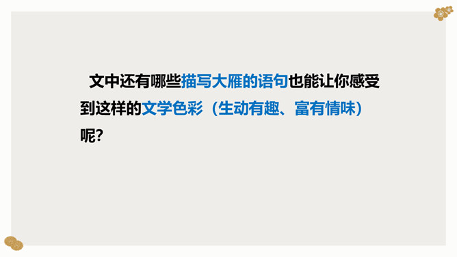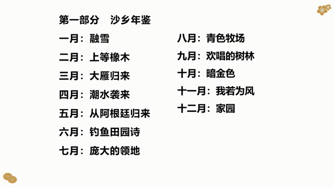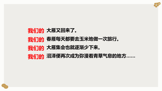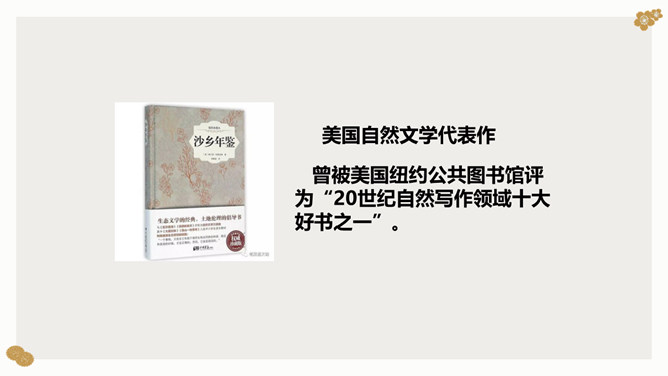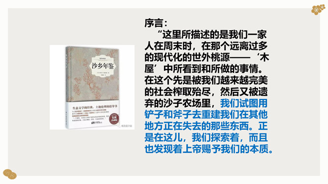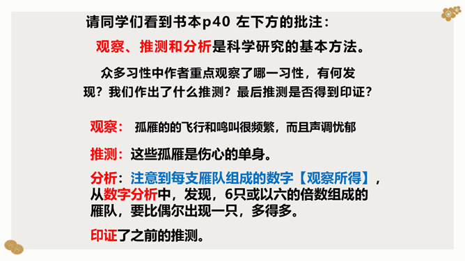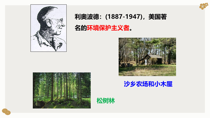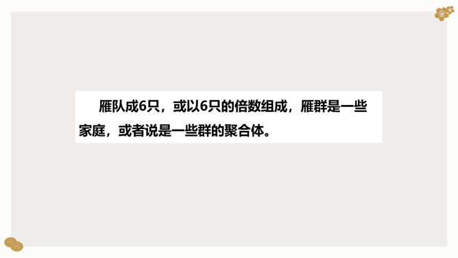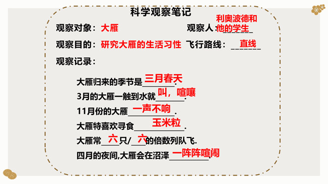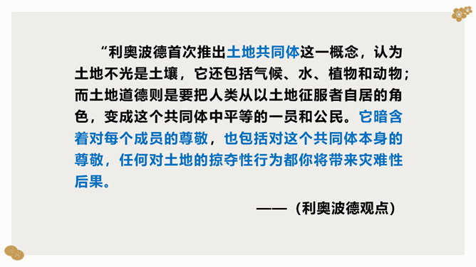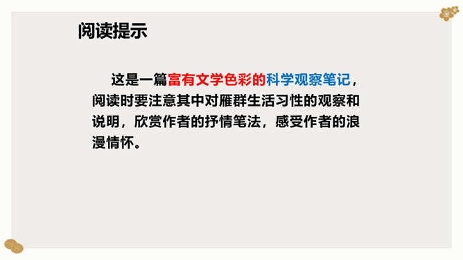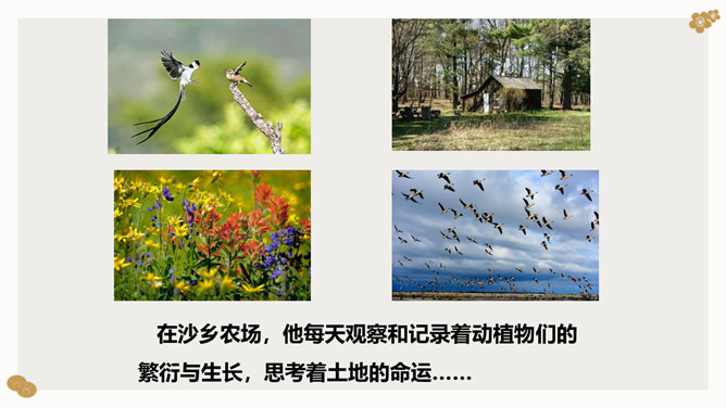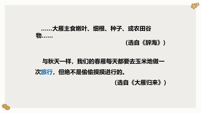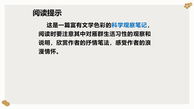 这是一篇富有文学色彩的科学观察笔记,阅读时要注意其中对雁群生活习性的观察和说明,欣赏作者的抒情笔法,感受作者的浪漫情怀。众多习性中作者重点观察了哪一习性,有何发现?我们作出了什么推测?最后推测是否得到印证?文中还有哪些描写大雁的语句也能让你感受到这样的文学色彩(生动有趣、富有情味)呢?利奥波德首次推出土地共同体这一概念,认为土地不光是土壤,它还包括气候、水、植物和动物;而土地道德则是要把人类从以土地征服者自居的角色,变成这个共同体中平等的一员和公民。所属专题:大雁归来ppt。