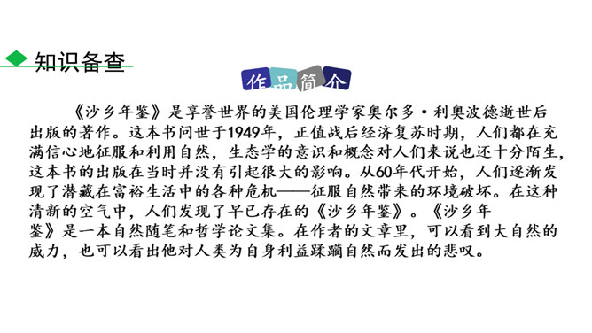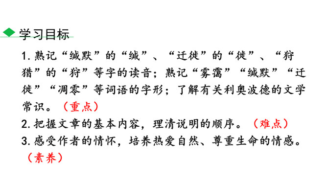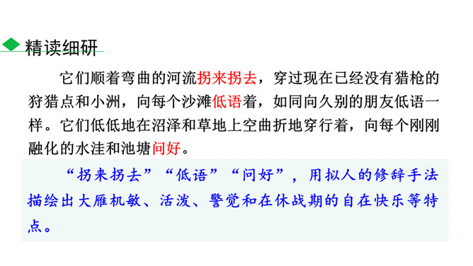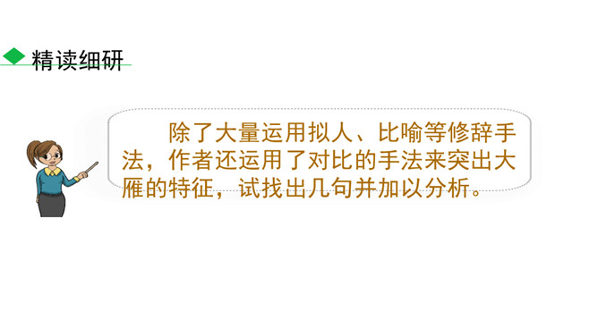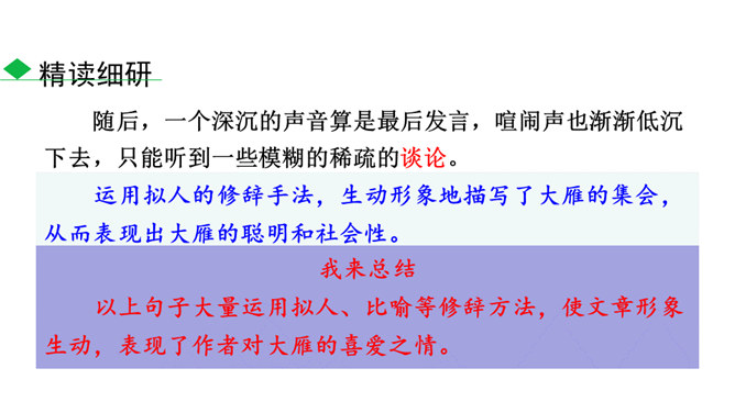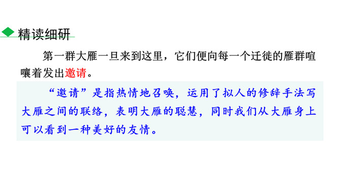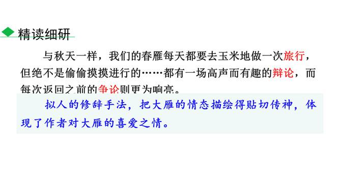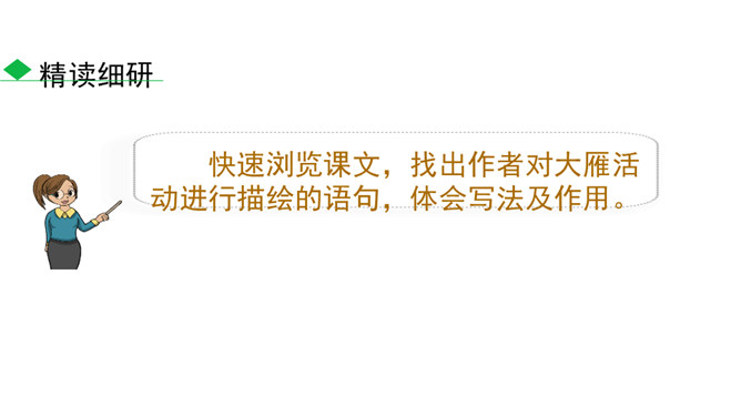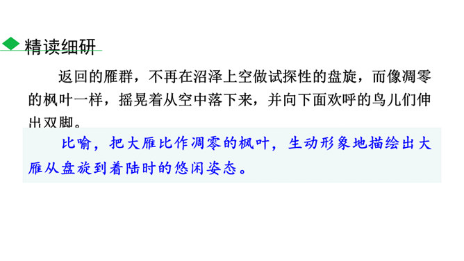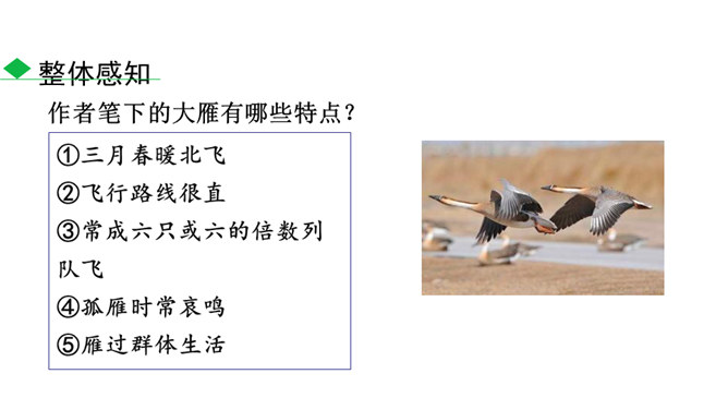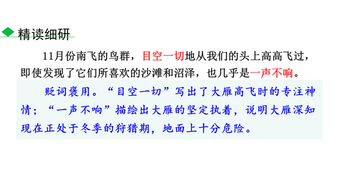 通读全文,说一说:作者是从哪些方面对大雁进行观察的,饱含了作者怎样的感情?1.对大雁的报春感到欣喜,把春雁的数目看作农场春天富足的标准。2.对大雁的迁徙飞翔表示由衷的钦敬。3.喜欢倾听大雁集会时的各种鸣叫,认为那是它们乐此不疲的辩论。4.对孤单的大雁感到哀怜,表示对枪杀者的反感和痛恨。5.赞叹大雁具有人类所不及的联合观念。以上各个方面都表现了作者的爱鸟之心,其爱鸟之情贯穿全文。为了观察研究大雁,作者都是怎么做的?他半夜三更偷偷“潜伏”在沼泽里,只为了聆听大雁的集会。所属专题:大雁归来ppt。
