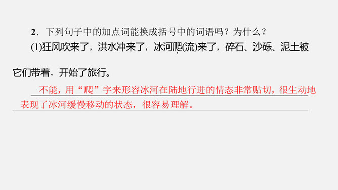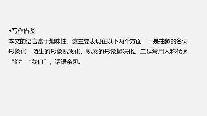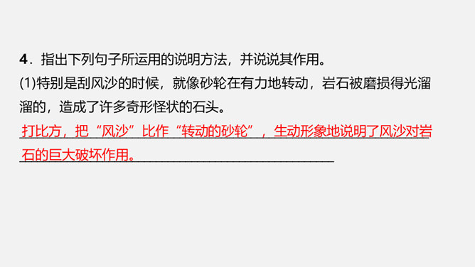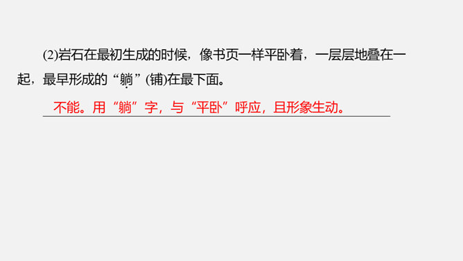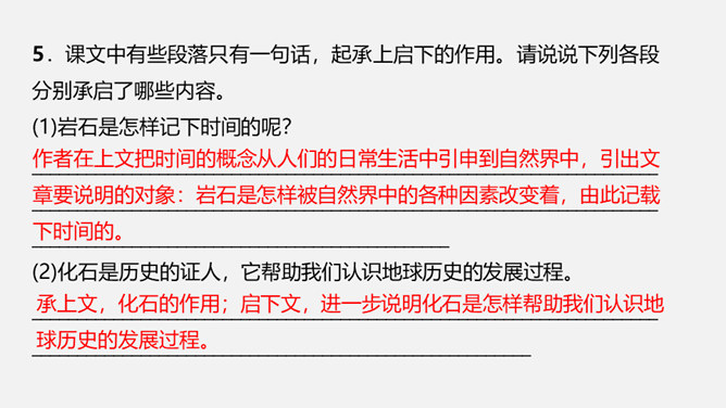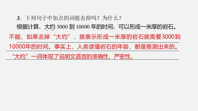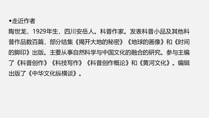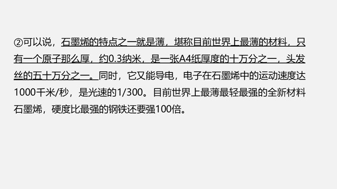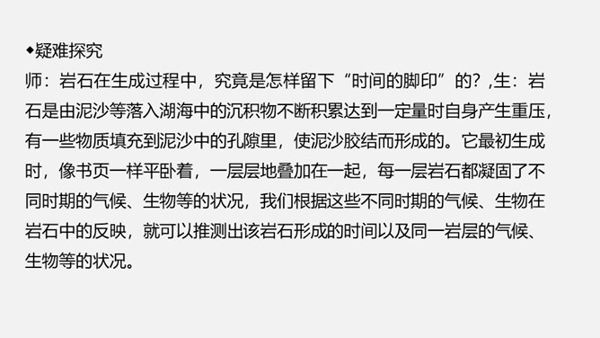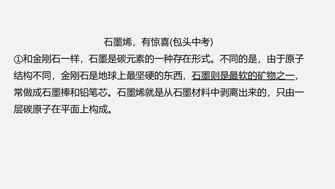 本文是一篇科普作品,主要介绍岩石记录时间的奇异功能,目的是说明认识岩石这一奇异功能所具有的重要意义,激发青少年探索自然奥秘的热情。 本文的语言富于趣味性,这主要表现在以下两个方面:一是抽象的名词形象化,陌生的形象熟悉化,熟悉的形象趣味化。二是常用人称代词“你”“我们”,话语亲切。简述本文的说明思路。首先对石墨烯的特性进行说明,之后又对石墨烯的应用前景进行了介绍。第①段画线句子中加点的“之一”能否去掉,为什么?不能去掉。“之一”意思是说世界上最软的矿物不止石墨一种。所属专题:时间的脚印ppt。
