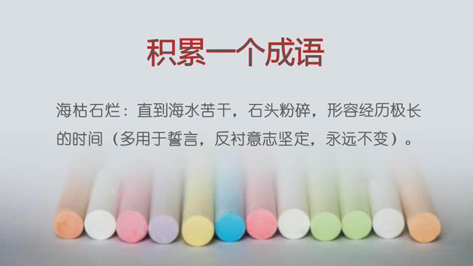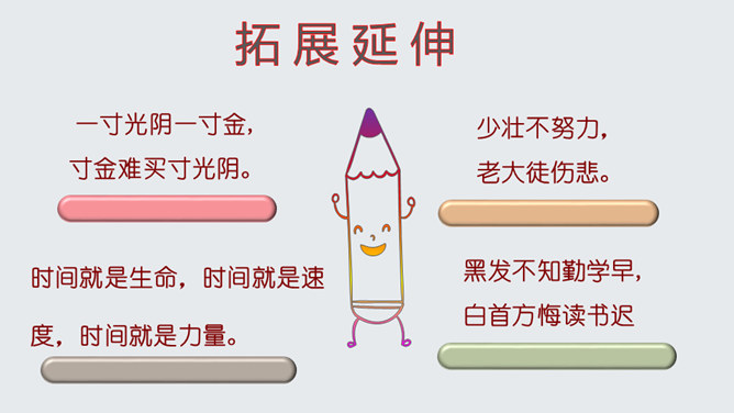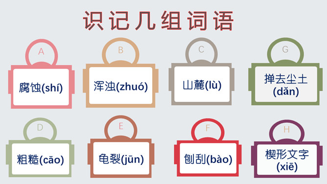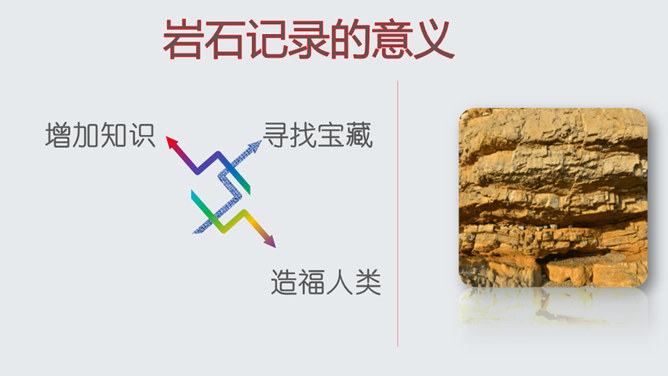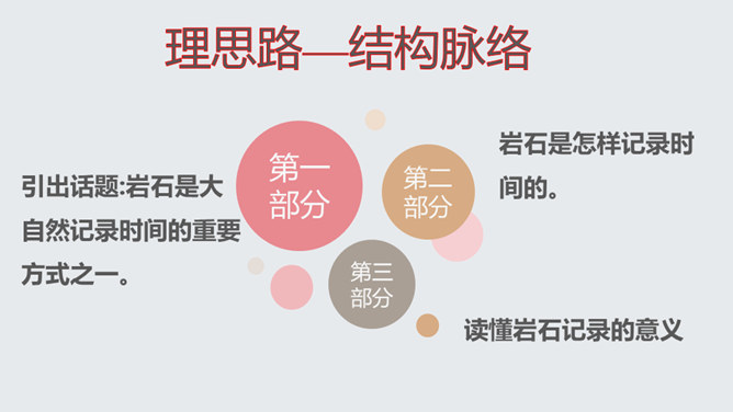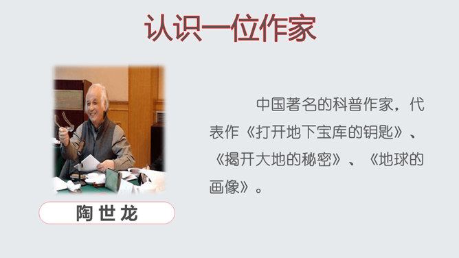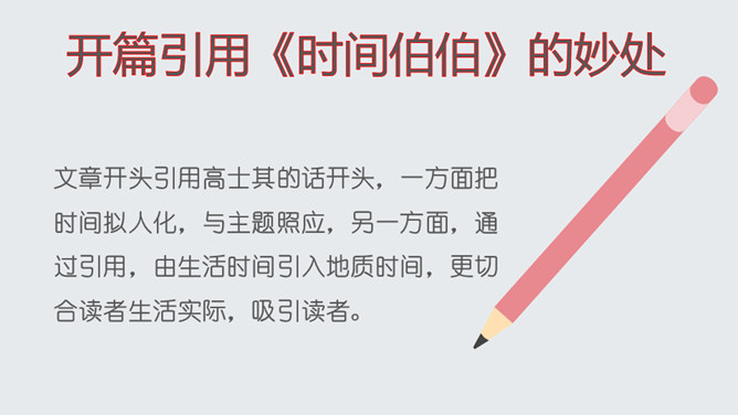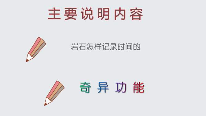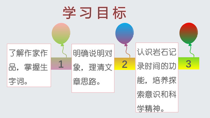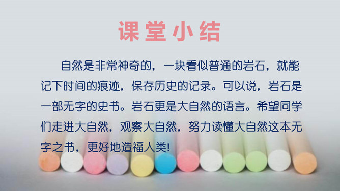 了解作家作品,掌握生字词。明确说明对象,理清文章思路。认识岩石记录时间的功能,培养探索意识和科学精神。文章开头引用高士其的话开头,一方面把时间拟人化,与主题照应,另一方面,通过引用,由生活时间引入地质时间,更切合读者生活实际,吸引读者。 自然是非常神奇的,一块看似普通的岩石,就能记下时间的痕迹,保存历史的记录。可以说,岩石是一部无字的史书。岩石更是大自然的语言。希望同学们走进大自然,观察大自然,努力读懂大自然这本无字之书,更好地造福人类!所属专题:时间的脚印ppt。