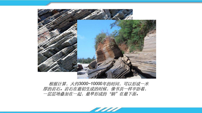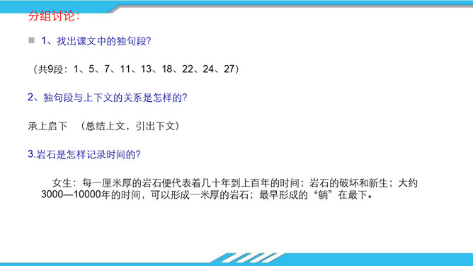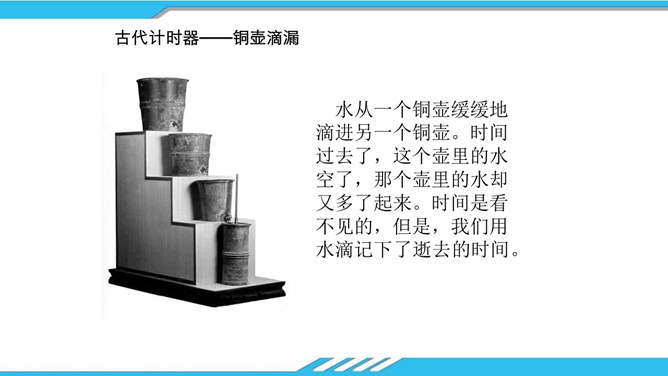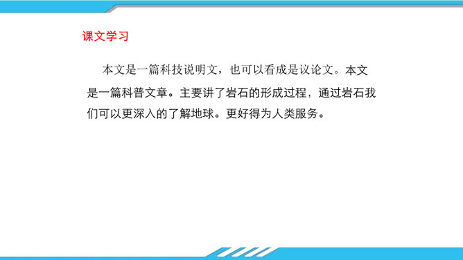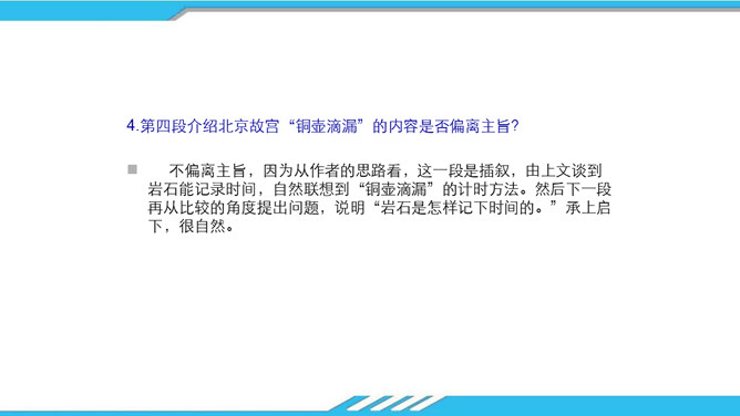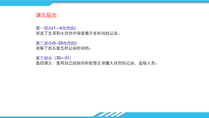 本文是一篇科技说明文,也可以看成是议论文。本文是一篇科普文章。主要讲了岩石的形成过程,通过岩石我们可以更深入的了解地球。更好得为人类服务。1、现在的人们是怎样记录时间的? 手表和日历。2、中国古代用什么来记录时间?铜壶滴漏。3、大自然是怎样记录时间的?大自然用岩石记录时间。4、除了岩石、还有哪些可以记录大自然的时间?各种生物化石、各种矿产资源。第四段介绍北京故宫“铜壶滴漏”的内容是否偏离主旨?偏离主旨,因为从作者的思路看,这一段是插叙,由上文谈到岩石能记录时间,自然联想到“铜壶滴漏”的计时方法。所属专题:时间的脚印ppt。