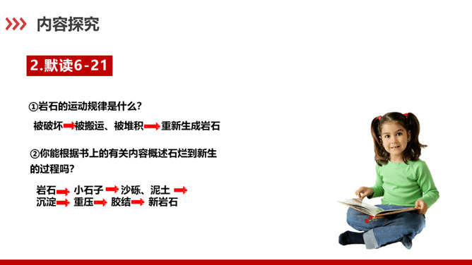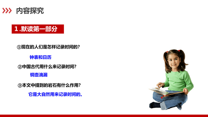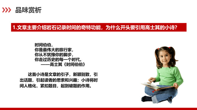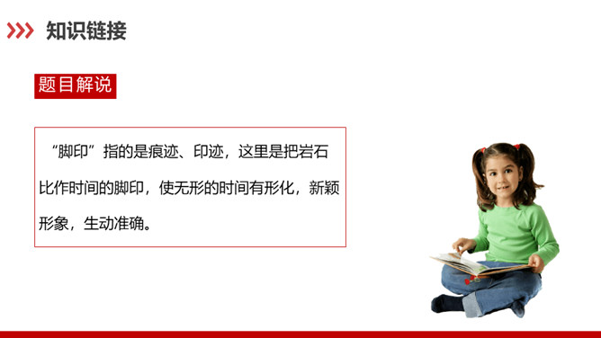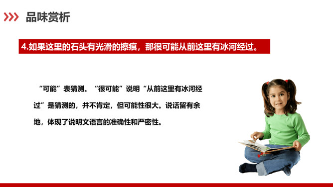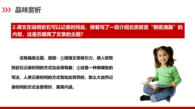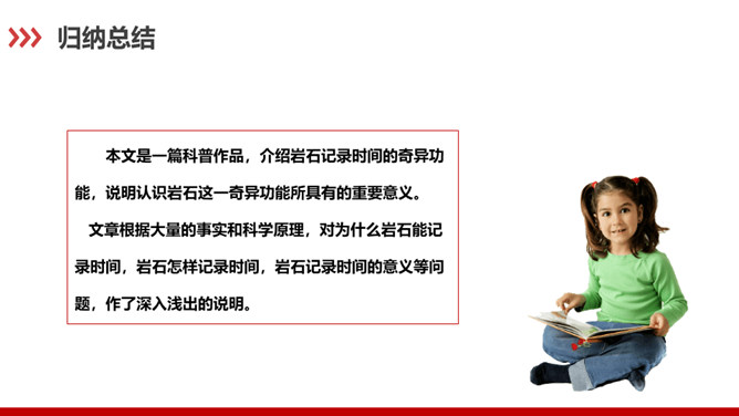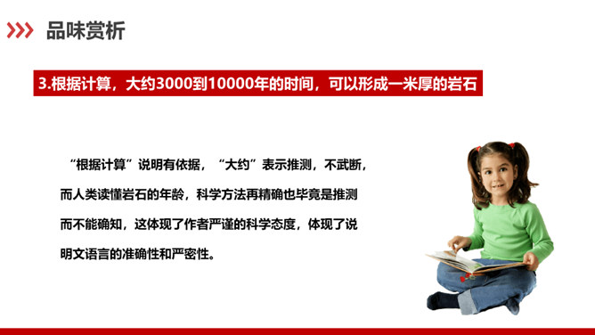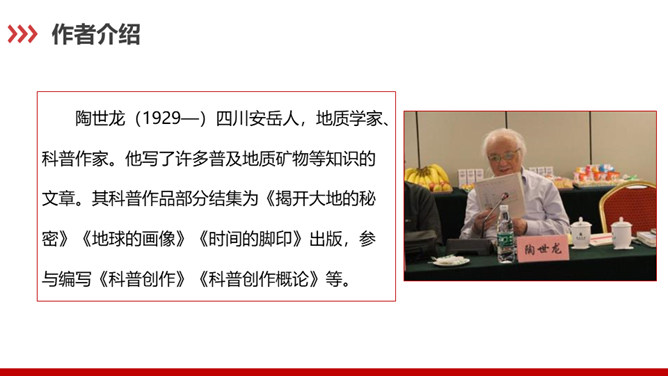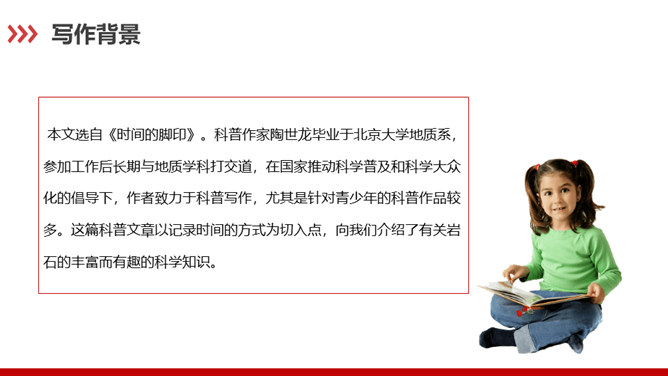 科普作家陶世龙毕业于北京大学地质系,参加工作后长期与地质学科打交道,在国家推动科学普及和科学大众化的倡导下,作者致力于科普写作,尤其是针对青少年的科普作品较多。这篇科普文章以记录时间的方式为切入点,向我们介绍了有关岩石的丰富而有趣的科学知识。“根据计算”说明有依据,“大约”表示推测,不武断,而人类读懂岩石的年龄,科学方法再精确也毕竟是推测而不能确知,这体现了作者严谨的科学态度,体现了说明文语言的准确性和严密性。“可能”表猜测。“很可能”说明“从前这里有冰河经过”是猜测的,并不肯定,但可能性很大。所属专题:时间的脚印ppt。