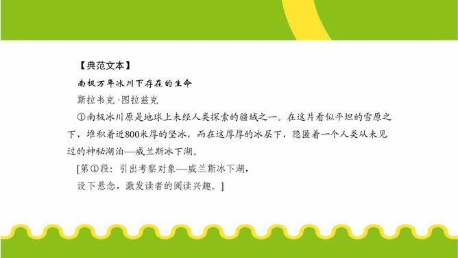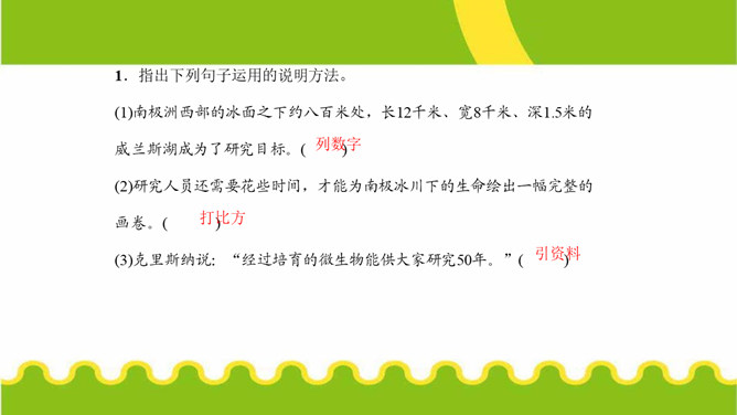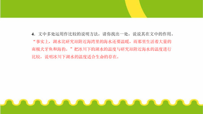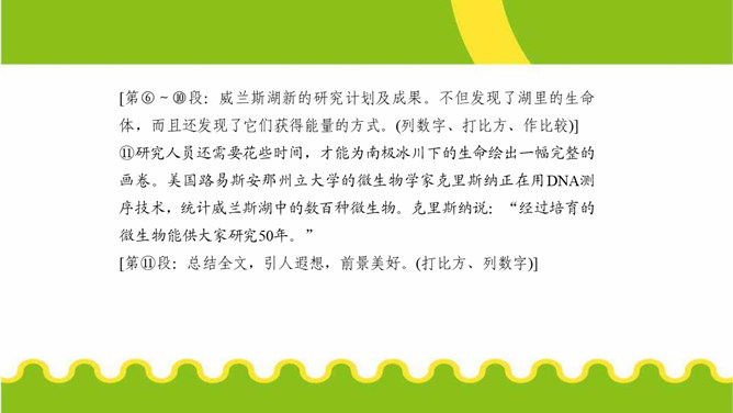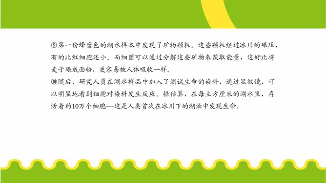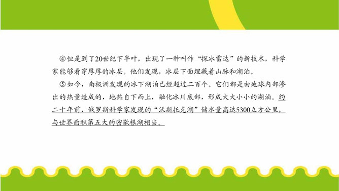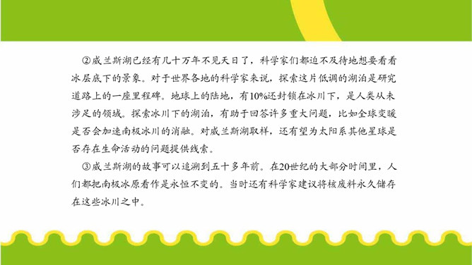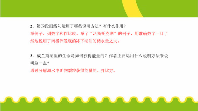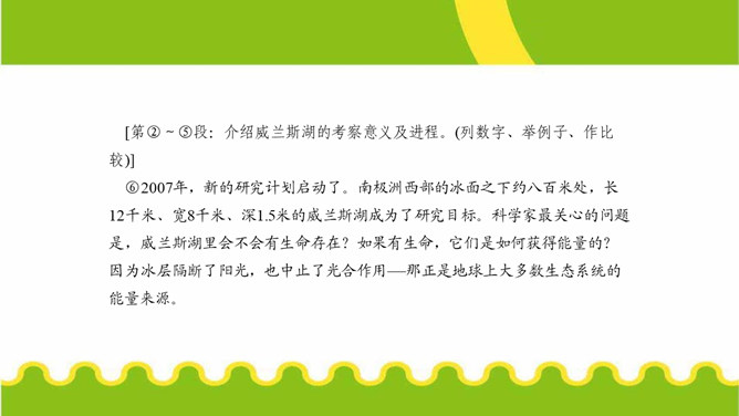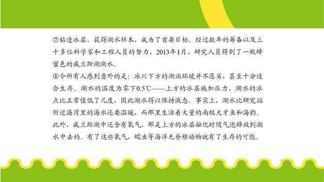 第⑤段画线句运用了哪些说明方法?有什么作用?举例子、列数字和作比较。举了“沃斯托克湖”的例子,用准确数字一目了然地说明了南极洲发现的冰下湖泊的储水量之大。威兰斯湖里的生命是如何获得能量的?作者主要运用什么说明方法来说明这一点?通过分解湖水中矿物颗粒获得能量的。文中多处运用作比较的说明方法,请你找出一处,说说其在文中的作用。“事实上,湖水比研究站附近海湾里的海水还要温暖,而那里生活着大量的南极犬牙鱼和海豹。”把冰川下的湖水的温度与研究站附近海水的温度进行比较,说明冰川下湖水的温度适合生命的存在。所属专题:说明的顺序ppt。