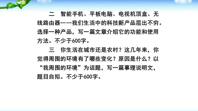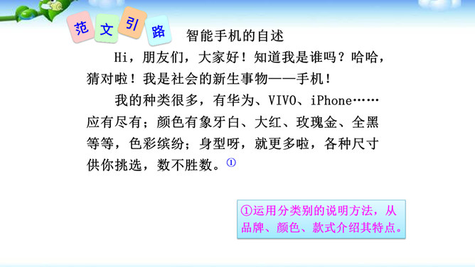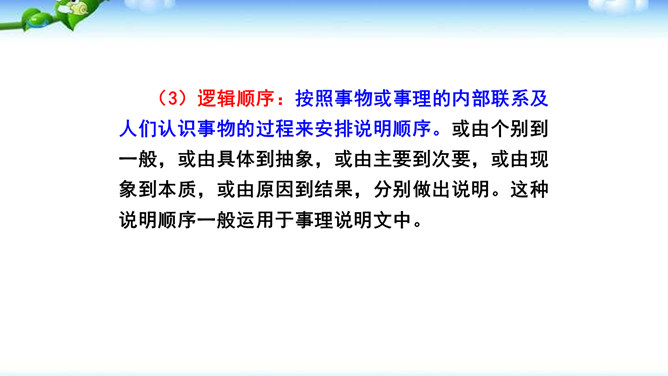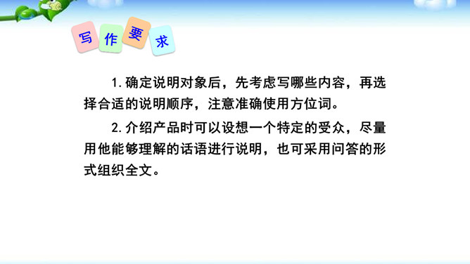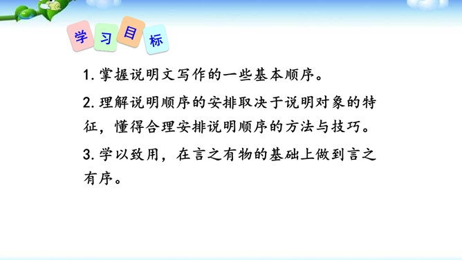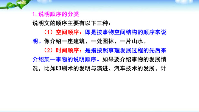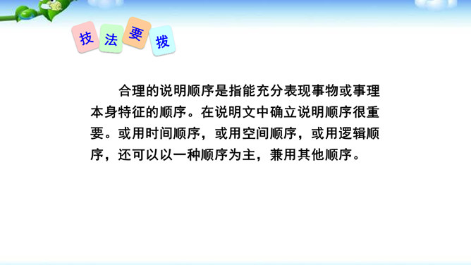 1.确定说明对象后,先考虑写哪些内容,再选择合适的说明顺序,注意准确使用方位词。2.介绍产品时可以设想一个特定的受众,尽量用他能够理解的话语进行说明,也可采用问答的形式组织全文。3.写事理说明文,要明确说明对象,写出它的变化。查资料,说明变化的原因。并注意安排好说明的顺序。合理的说明顺序是指能充分表现事物或事理本身特征的顺序。在说明文中确立说明顺序很重要。或用时间顺序,或用空间顺序,或用逻辑顺序,还可以以一种顺序为主,兼用其他顺序。说明文的顺序主要有以下三种。所属专题:说明的顺序ppt。