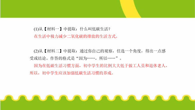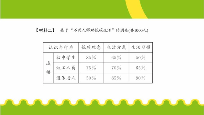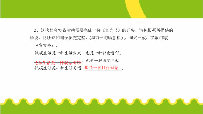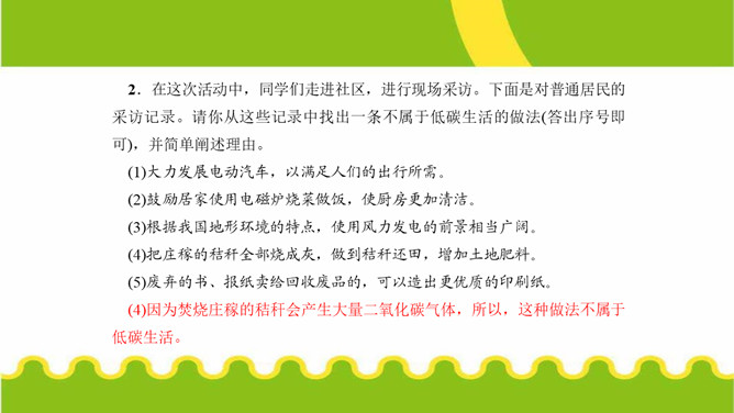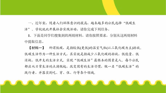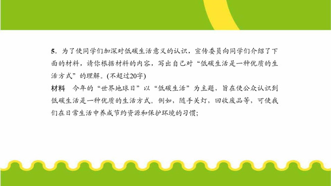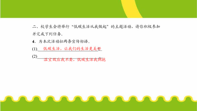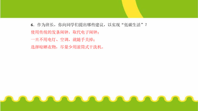 低碳生活作为一种生活方式,其实就是指减少二氧化碳的排放,低能量、低消耗、低开支的生活方式。实现“低碳生活”最根本的因素是人。每个公民都应从日常生活的点滴做起,改变固有的生活习惯,做一名“低碳生活”的践行者,并落实到吃、穿、住、行等各个领域。作为班长,你向同学们提出哪些建议,以实现“低碳生活”?使用传统的发条闹钟,取代电子闹钟;一旦不用电灯、空调,就随手关掉;选择晾晒衣物,尽量少用滚筒式干洗机。