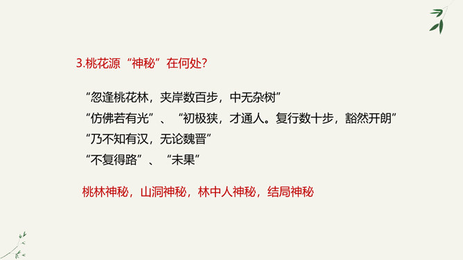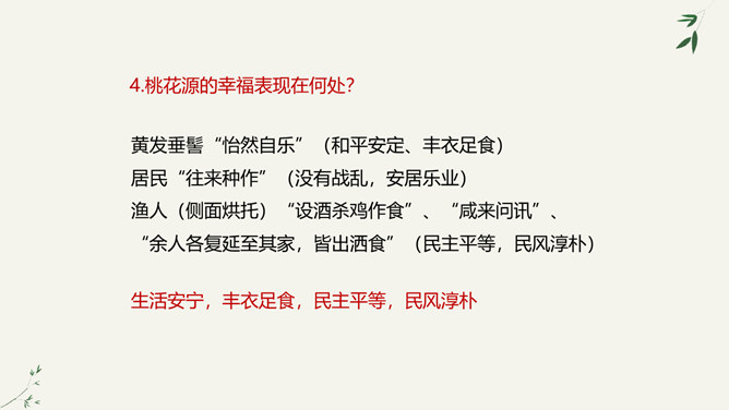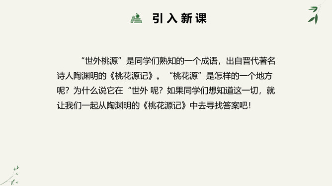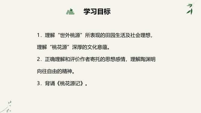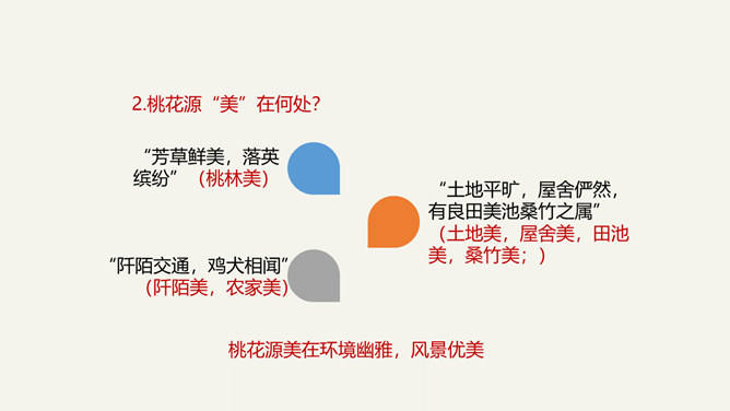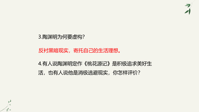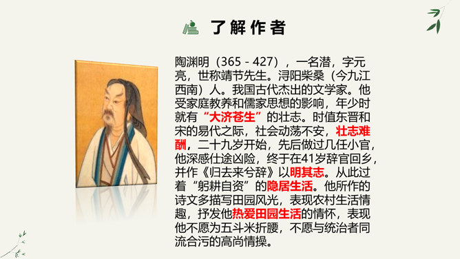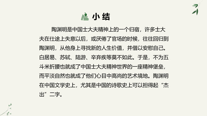 陶渊明是中国士大夫精神上的一个归宿,许多士大夫在仕途上失意以后,或厌倦了官场的时候,往往回归到陶渊明,从他身上寻找新的人生价值,并借以安慰自己。白居易、苏轼、陆游、辛弃疾等莫不如此。于是,不为五斗米折腰也就成了中国士大夫精神世界的一座精神堡垒,而平淡自然也就成了他们心目中高尚的艺术境地。陶渊明在中国文学史上,尤其是中国的诗歌史上可以担得起“杰出”二字。陶渊明因生活在战乱频仍的时代,壮志难酬,归隐田园,因而构想了他心目中的理想社会桃花源,这是对当时黑暗社会的批判。所属专题:桃花源记ppt。