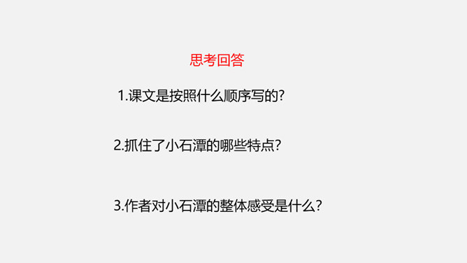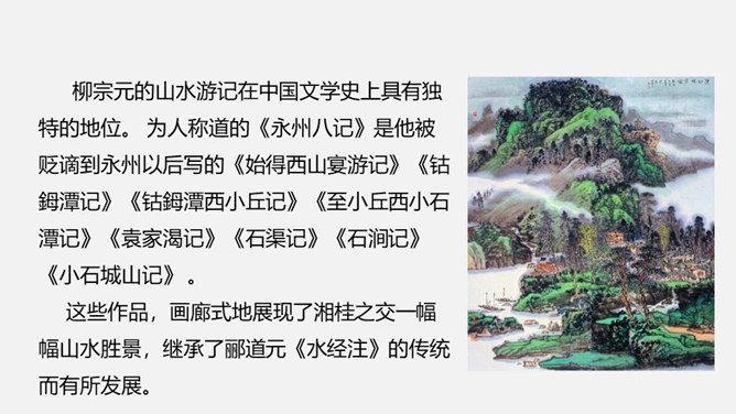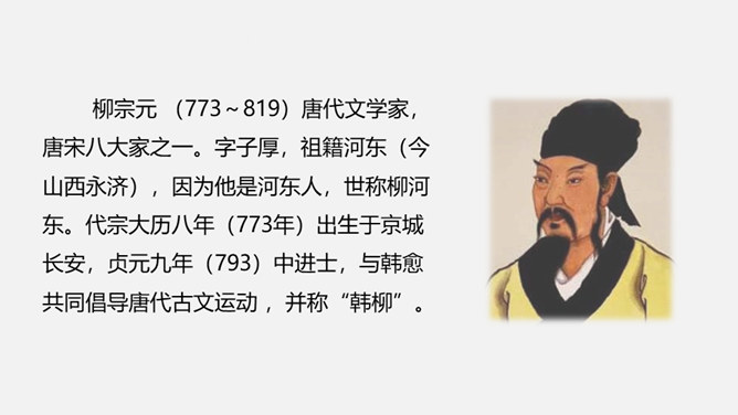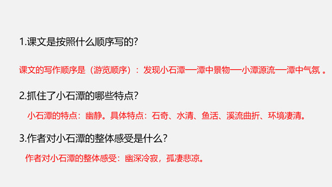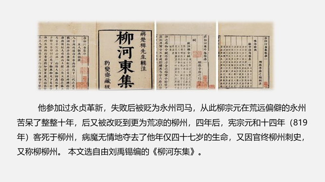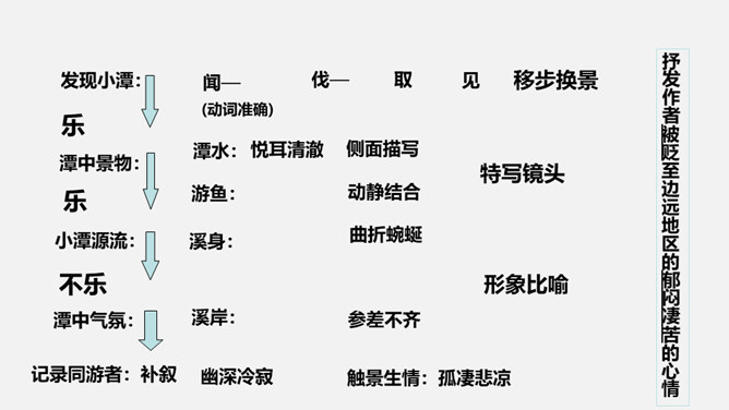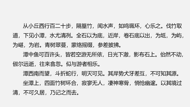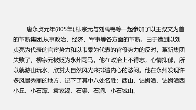 课文是按照什么顺序写的?抓住了小石潭的哪些特点?作者对小石潭的整体感受是什么?唐永贞元年(805年),柳宗元与刘禹锡等一起参加了以王叔文为首的革新集团,从事政治、经济、军事等各方面的革新。由于遭到以刘贞亮为代表的官宦势力和以韦皋为代表的官僚势力的反对,革新集团失败了,柳宗元被贬为永州司马。他在政治上不得志,心情抑郁,所以就游山玩水,欣赏大自然风光来排遣内心的愁闷。他在永州发现许多风景秀丽的地方,记下了其中八处名胜:西山、钴姆潭、钴姆潭西小丘、小石潭、袁家渴、石渠、石涧、小石城山。所属专题:小石潭记ppt。