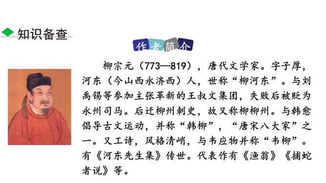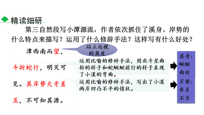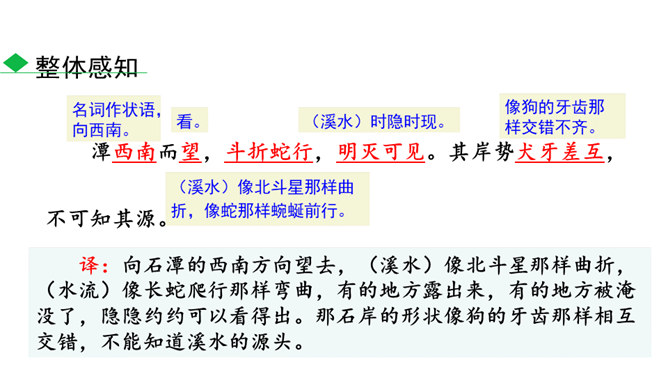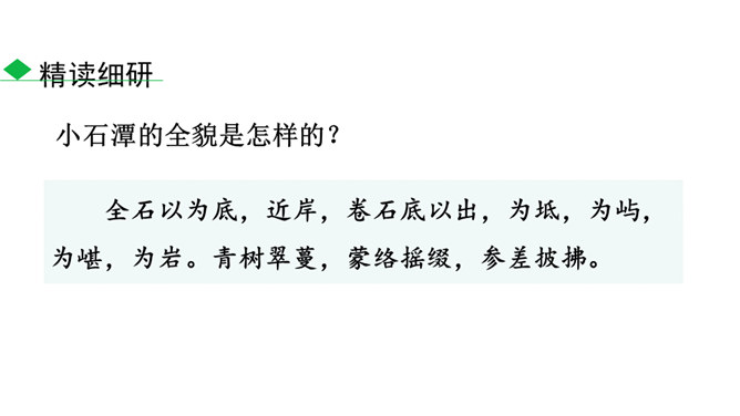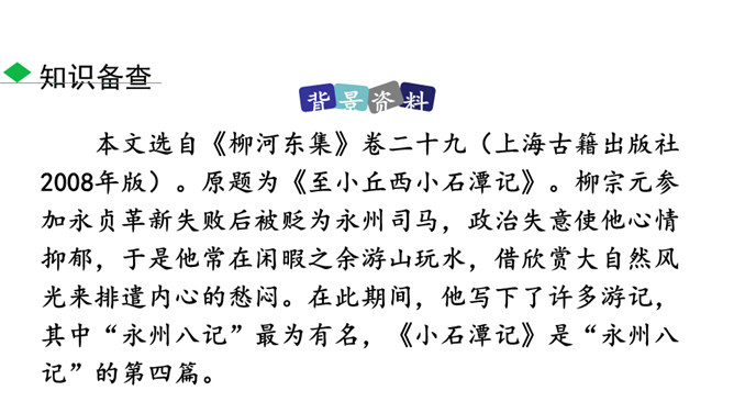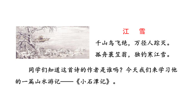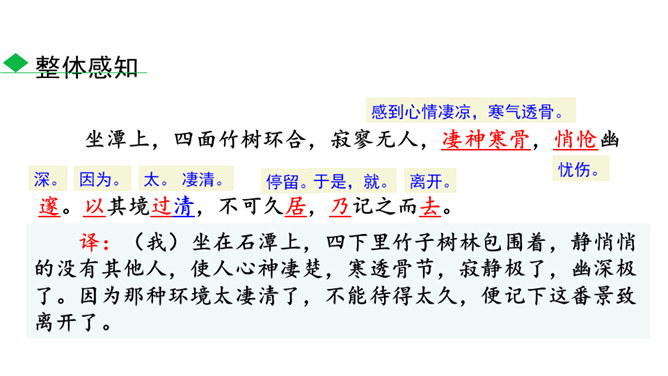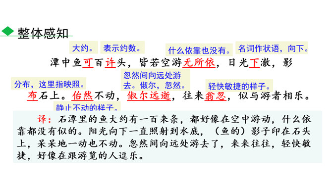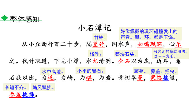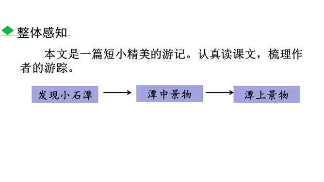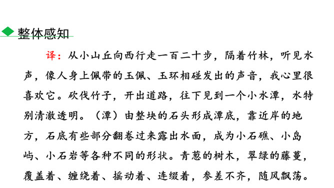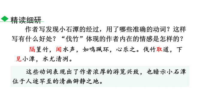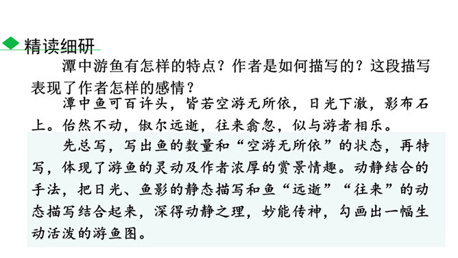 潭中游鱼有怎样的特点?作者是如何描写的?这段描写表现了作者怎样的感情?先总写,写出鱼的数量和“空游无所依”的状态,再特写,体现了游鱼的灵动及作者浓厚的赏景情趣。动静结合的手法,把日光、鱼影的静态描写和鱼“远逝”“往来”的动态描写结合起来,深得动静之理,妙能传神,勾画出一幅生动活泼的游鱼图。作者写发现小石潭的经过,用了哪些准确的动词?这样写有什么好处?“伐竹”体现的作者内在的情感是怎样的?这些动词表现出了作者浓厚的游览兴致,也暗示小石潭位于人迹罕至的清幽僻静之地。所属专题:小石潭记ppt。