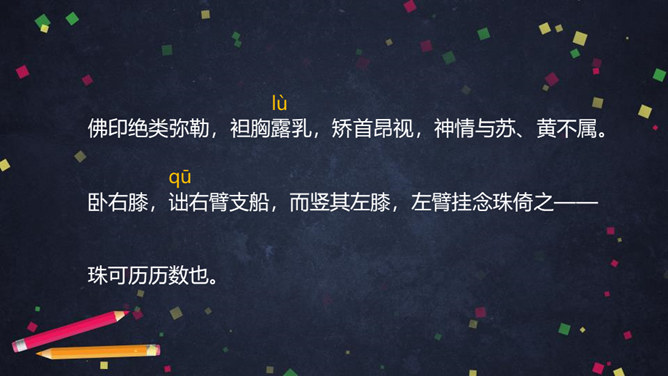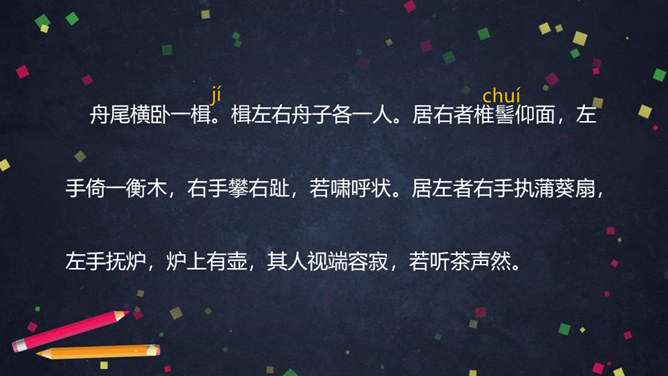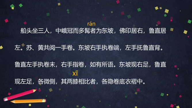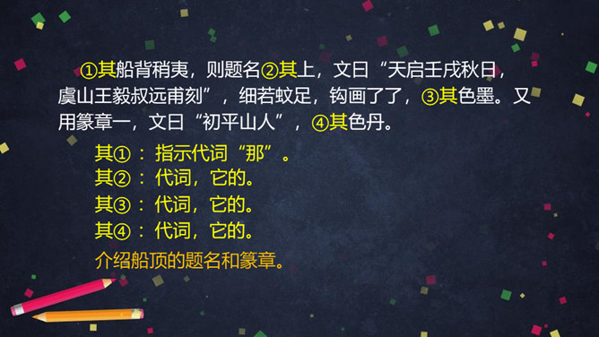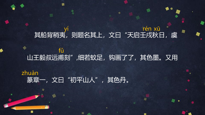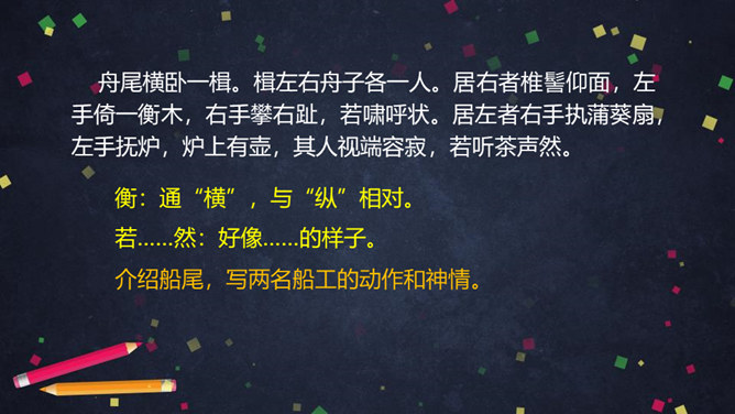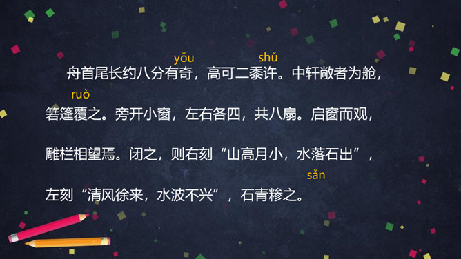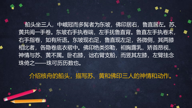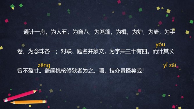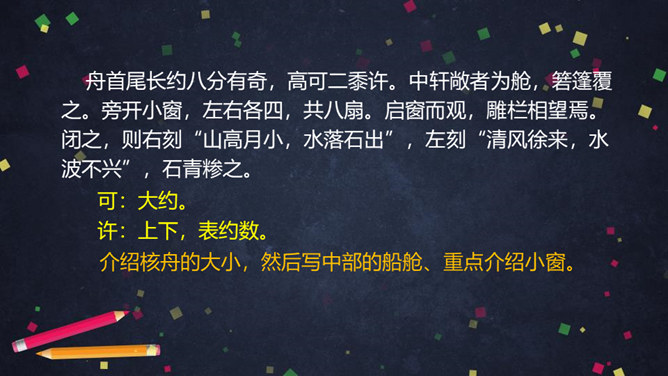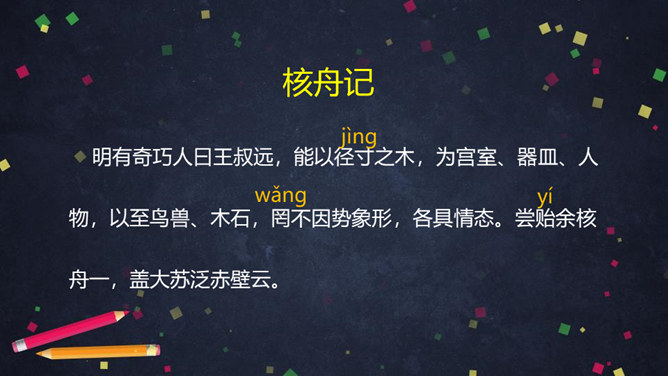 精湛的技艺、巧妙的构思以及雕刻艺人独特的审美情趣和思想追求,成就了核雕史上一颗精美绝伦的核舟。从这枚小小的核舟身上,我们看到了中国古代劳动人民的勤劳智慧,看到了中国古代工艺美术的杰出成就。见识民族工艺瑰宝,坚定中华文化信心,同学们,让我们为我们伟大的祖国能拥有如此优秀的传统文化,拥有如此优秀的劳动人民而自豪而骄傲!从文中哪些地方能感受到王叔远雕刻技艺的“奇巧”?所属专题:核舟记ppt。