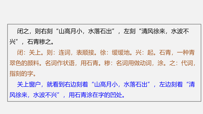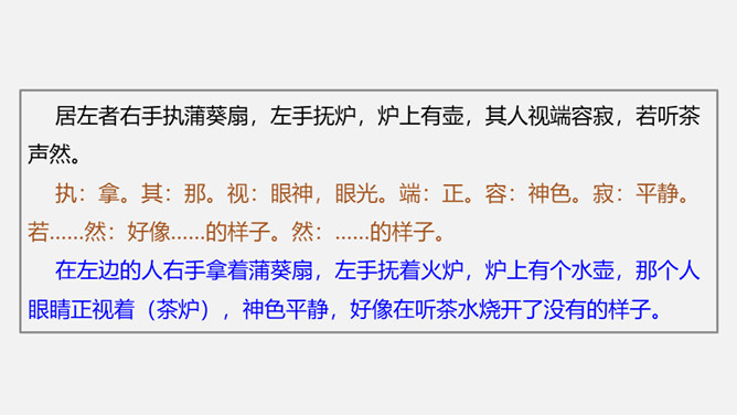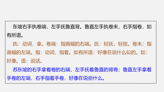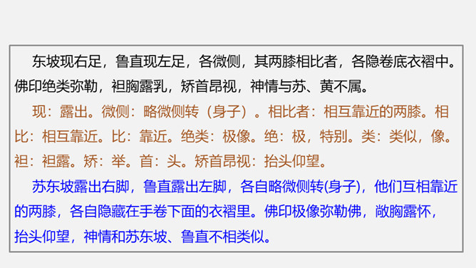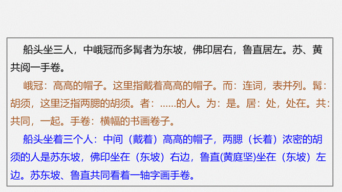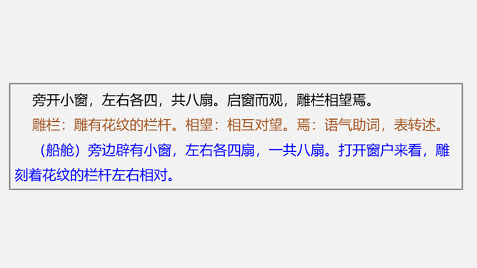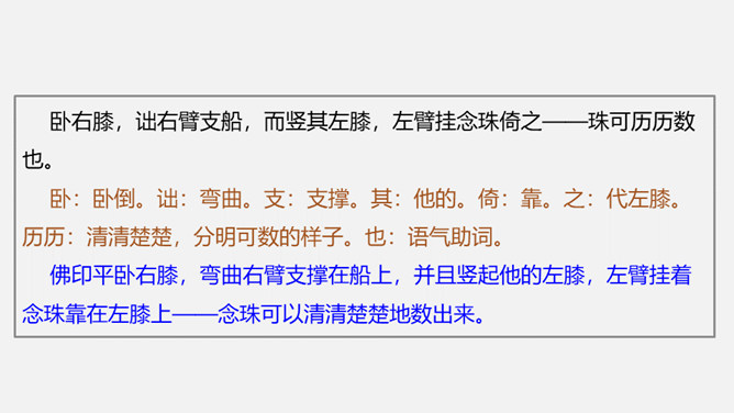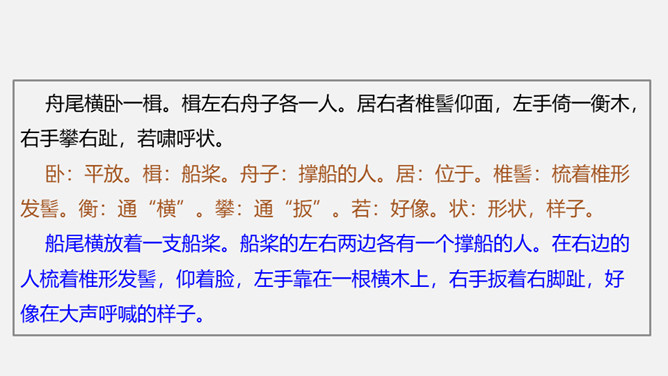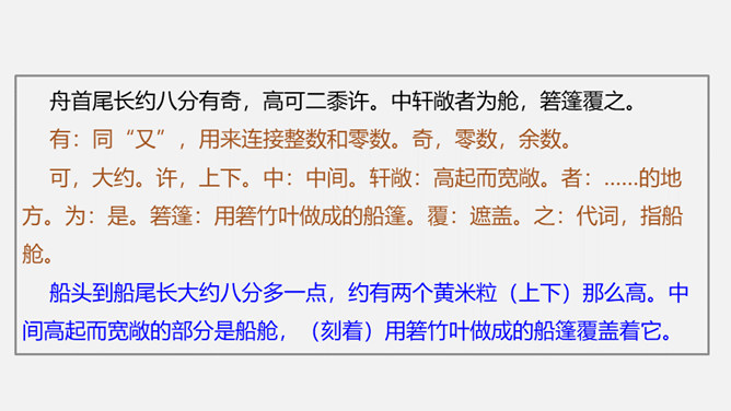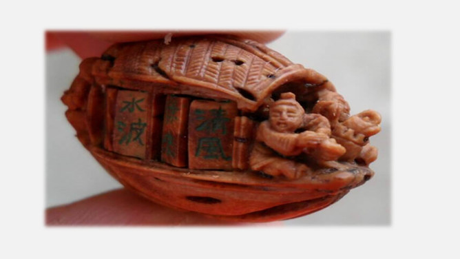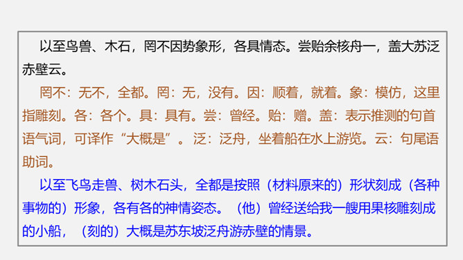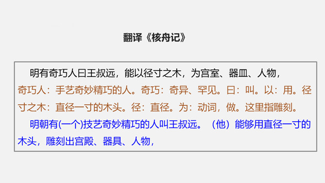 研读思考:(1)这枚核舟是用什么雕刻而成的?(2)核舟雕刻的主题是什么?(3)魏学洢是如何评价这枚核舟和核舟雕刻者的?思考探究:(1)请在本上画出核舟示意图,尽量用原文准确标出作者提供的各项信息。(2)谈谈这段描述从哪些方面表现了雕刻技艺的灵怪和雕刻者的奇巧。 读第三、四段。(1)小组模拟作者描写内容摆出人物位置关系和大体姿态,体会作者的描述顺序。(2)谈谈这两段又是怎样表现雕刻技艺的灵怪和雕刻的奇巧的。(尽量引用原文加以说明)练习用空间顺序描述一件工艺品并能突出其特点。所属专题:核舟记ppt。