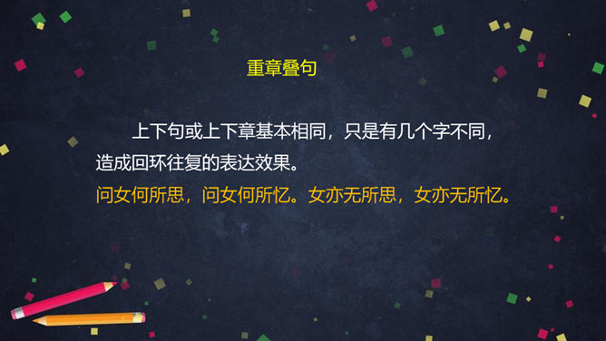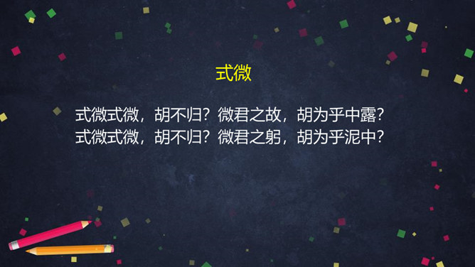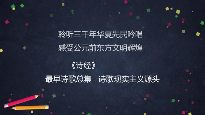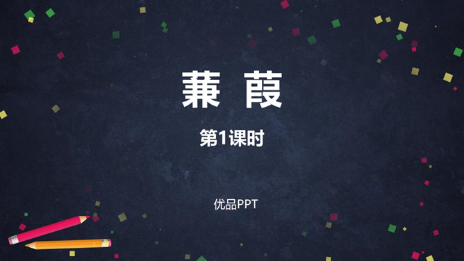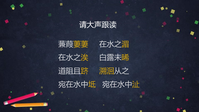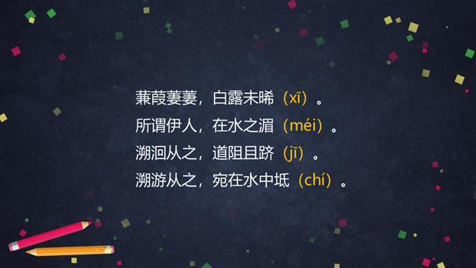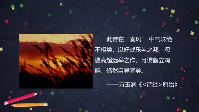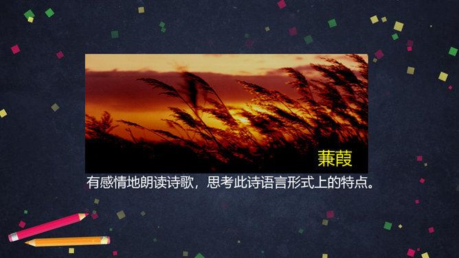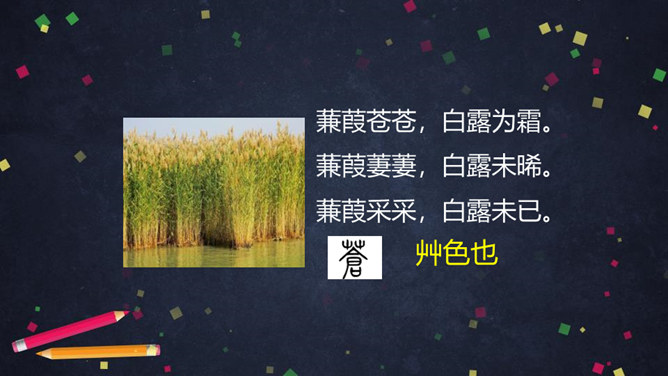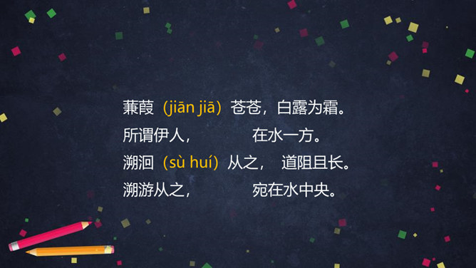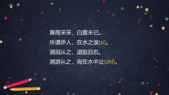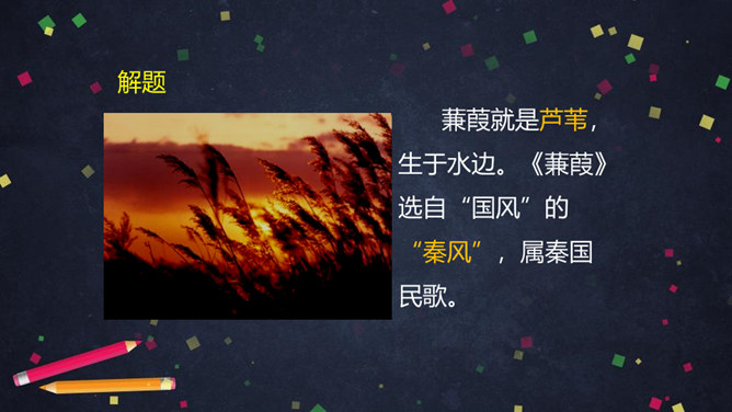 聆听三千年华夏先民吟唱,感受公元前东方文明辉煌。《诗经》是最早诗歌总集,诗歌现实主义源头。蒹葭就是芦苇,生于水边。《蒹葭》选自“国风”的“秦风”,属秦国民歌。此诗在“秦风” 中气味绝不相类,以好战乐斗之邦,忽遇高超远举之作,可谓鹤立鸡群,翛然自异者矣。跟读,思考此诗节奏、韵律的特点。感情地朗读诗歌,思考此诗语言形式上的特点。上下句或上下章基本相同,只是有几个字不同,造成回环往复的表达效果。所属专题:蒹葭ppt。