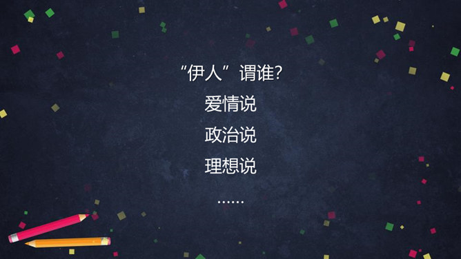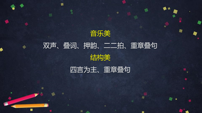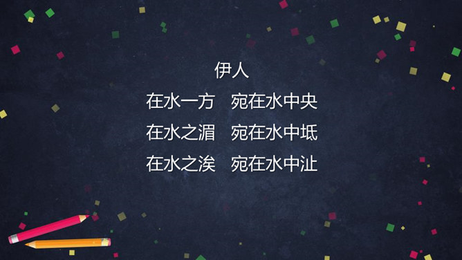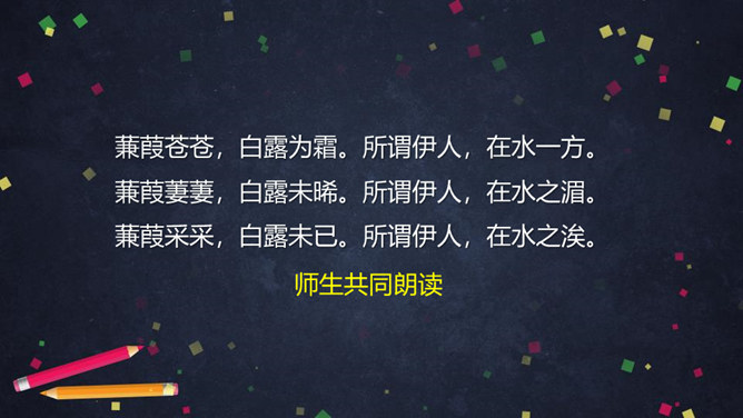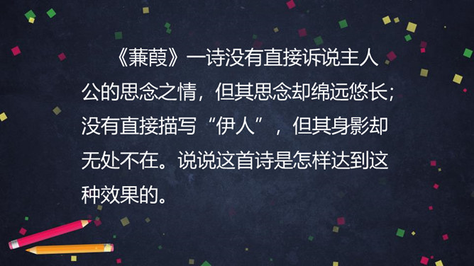 音乐美:双声、叠词、押韵、二二拍、重章叠句。结构美:四言为主、重章叠句。《蒹葭》一诗没有直接诉说主人公的思念之情,但其思念却绵远悠长;没有直接描写“伊人”,但其身影却无处不在。说说这首诗是怎样达到这种效果的。《关雎》《蒹葭》在内容情感和表现形式上有什么异同?有感情地朗读。所属专题:蒹葭ppt。