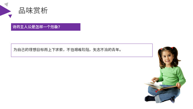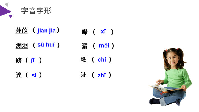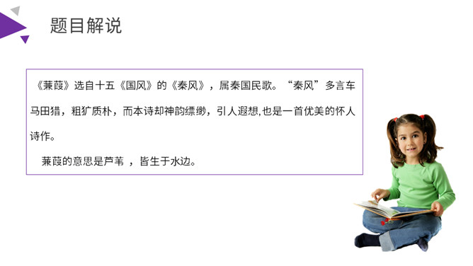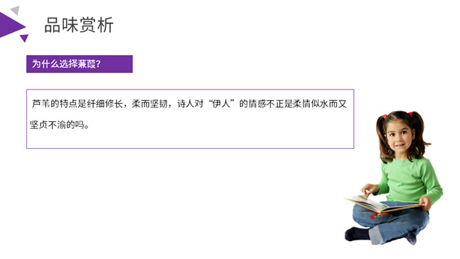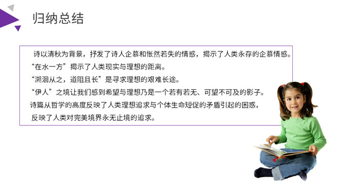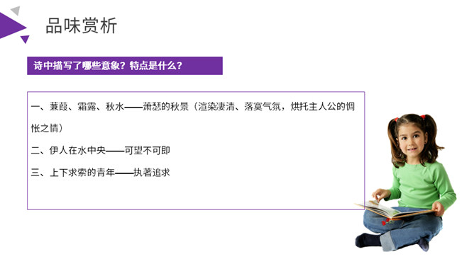 诗中描写了哪些意象?特点是什么?一、蒹葭、霜露、秋水——萧瑟的秋景(渲染凄清、落寞气氛,烘托主人公的惆怅之情)。二、伊人在水中央——可望不可即。三、上下求索的青年——执著追求。芦苇的特点是纤细修长,柔而坚韧,诗人对“伊人”的情感不正是柔情似水而又坚贞不渝的吗。 诗的主人公是怎样一个形象?为自己的理想目标而上下求索,不怕艰难险阻,矢志不渝的青年。诗以清秋为背景,抒发了诗人企慕和怅然若失的情感,揭示了人类永存的企慕情感。“在水一方”揭示了人类现实与理想的距离。所属专题:蒹葭ppt。