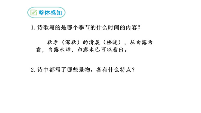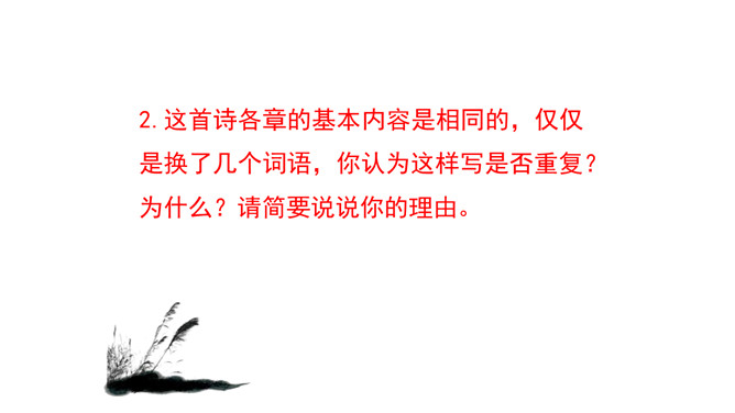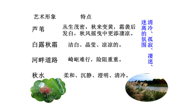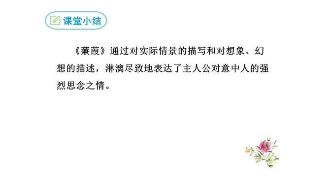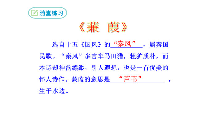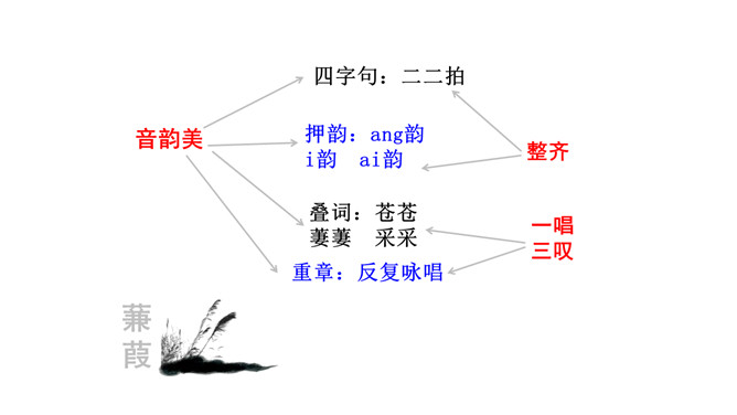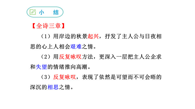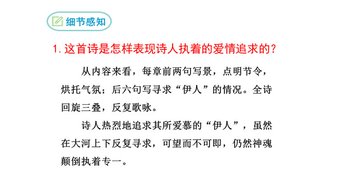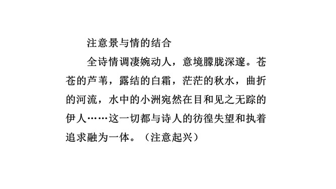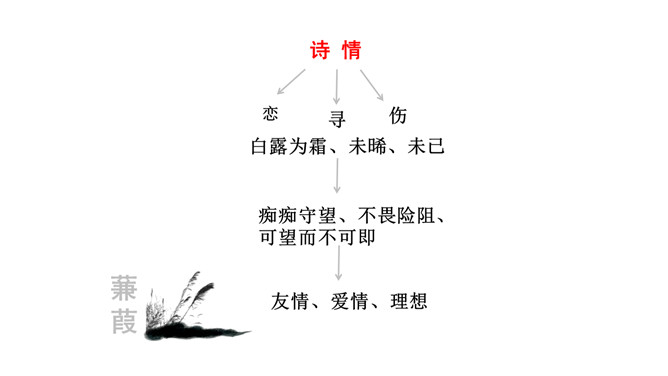 1.诗歌写的是哪个季节的什么时间的内容?2.诗中都写了哪些景物,各有什么特点?这首诗是怎样表现诗人执着的爱情追求的?从内容来看,每章前两句写景,点明节令,烘托气氛;后六句写寻求“伊人”的情况。全诗回旋三叠,反复歌咏。诗人热烈地追求其所爱慕的“伊人”,虽然在大河上下反复寻求,可望而不可即,仍然神魂颠倒执着专一。这首诗各章的基本内容是相同的,仅仅是换了几个词语,你认为这样写是否重复?为什么?请简要说说你的理由。全诗情调凄婉动人,意境朦胧深邃。所属专题:蒹葭ppt。