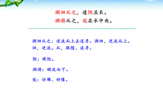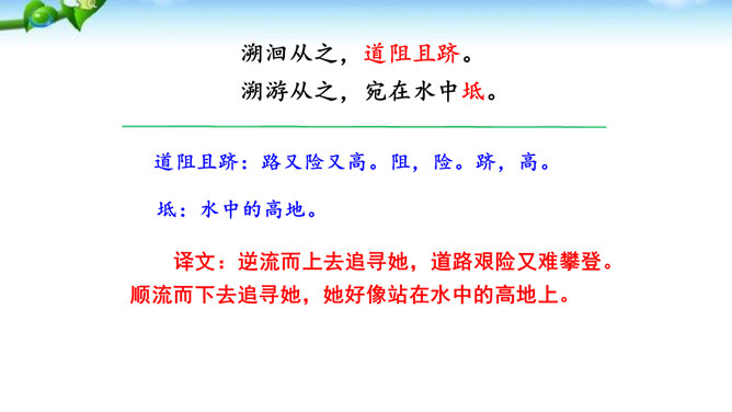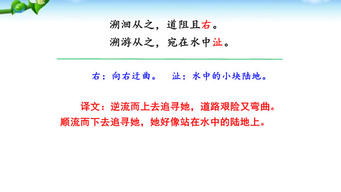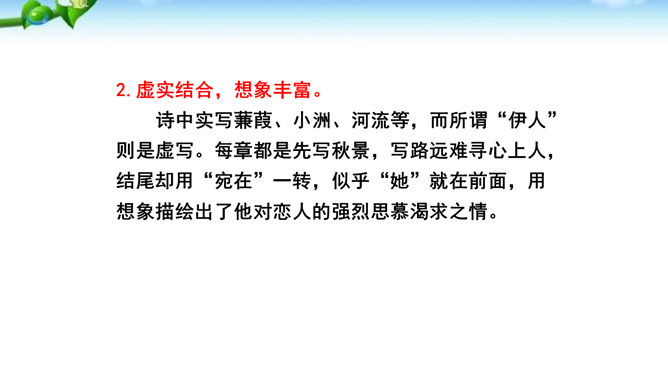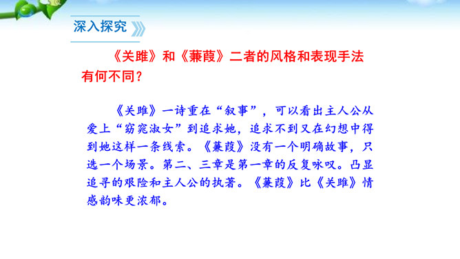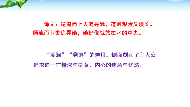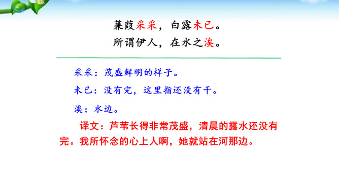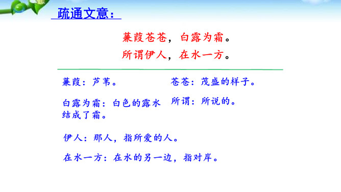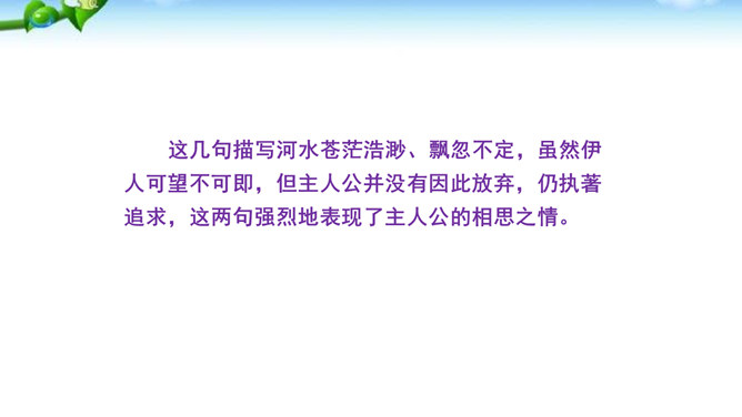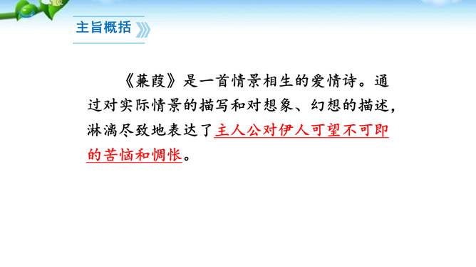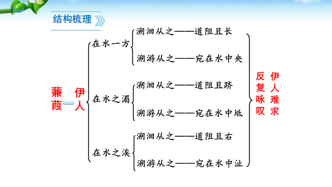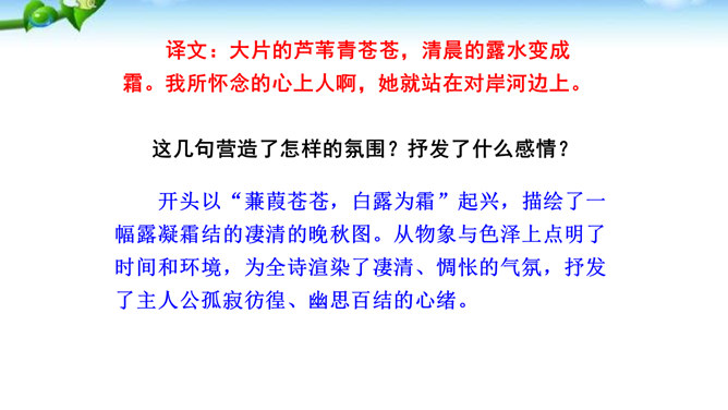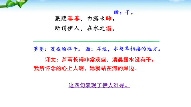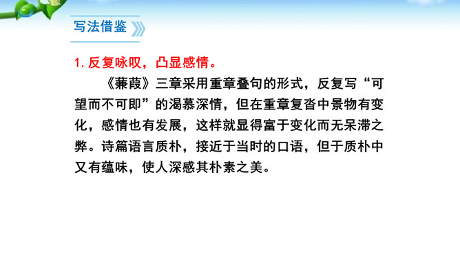 《诗经》多采用重章叠句的形式,即上下句或上下章基本相同,只是更换其中的几个字,造成回环往复的表达效果。选择本课中的一首诗,做具体分析。《诗经》章法形式的重要特征就是重章叠句、反复咏唱,也就是一首诗由若干章构成,章与章之间字句基本相同,只对应的变换少数字词,反复咏唱,重章复唱的形式,又称为叠咏体,是民歌中常用的样式。这一方面因为民歌所要表达的情感是单纯而深挚的,只有重要的反复咏唱才能充分抒情达意;另一方面是因为民歌是口头传唱的,这种形式便于记忆和传诵。所属专题:蒹葭ppt。