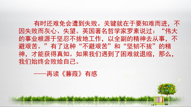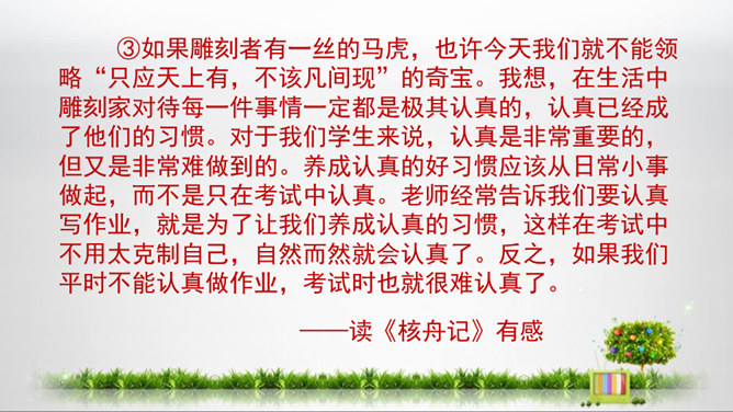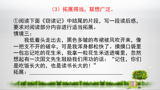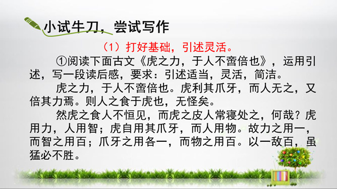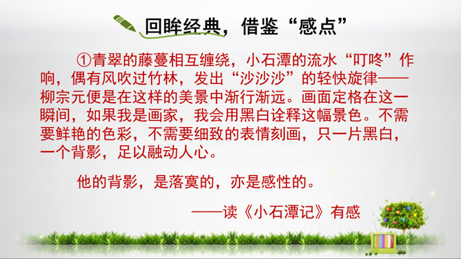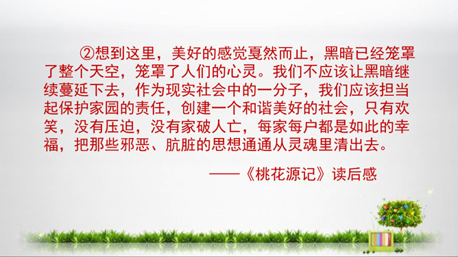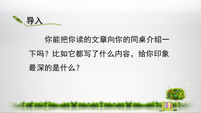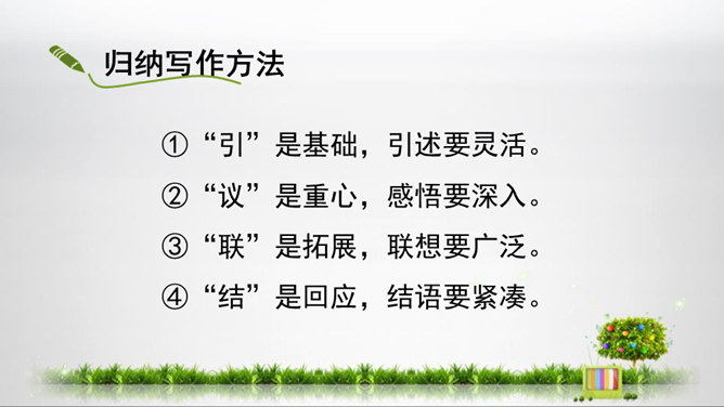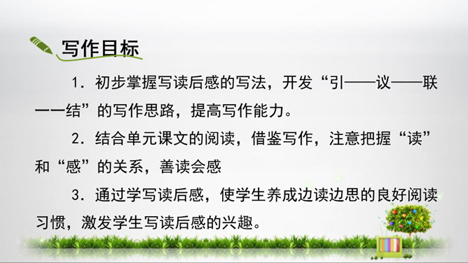 1.初步掌握写读后感的写法,开发“引——议——联一一结”的写作思路,提高写作能力。2.结合单元课文的阅读,借鉴写作,注意把握“读”和“感”的关系,善读会感3.通过学写读后感,使学生养成边读边思的良好阅读习惯,激发学生写读后感的兴趣。你能把你读的文章向你的同桌介绍一下吗?比如它都写了什么内容,给你印象最深的是什么?要求:概括材料内容,但不要照抄原文;要写出自己独特的感受,力求新颖,但不能脱离原文任意发挥;联系个人的生活体验来写。所属专题:学写读后感ppt。