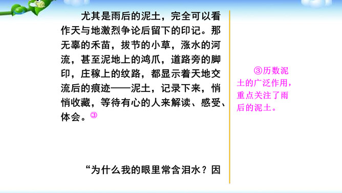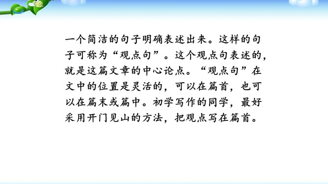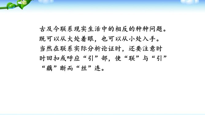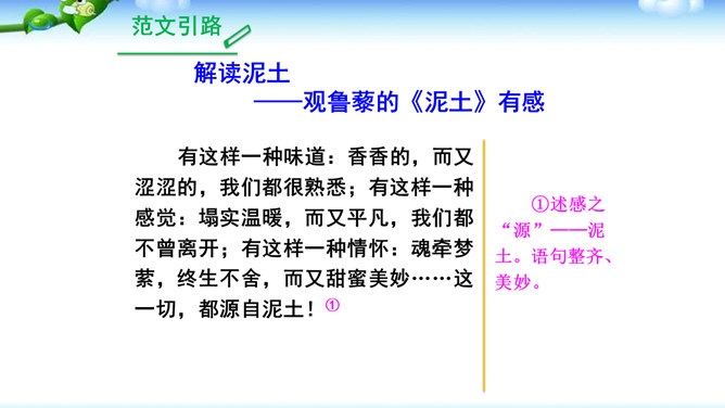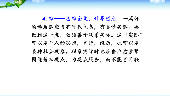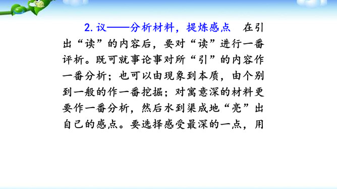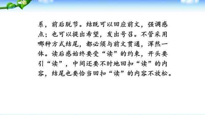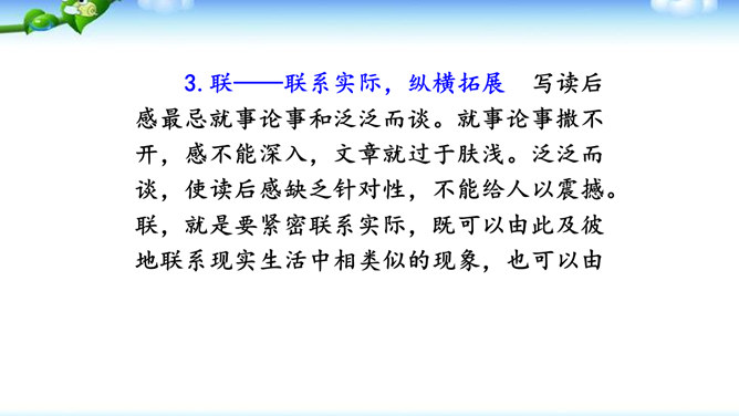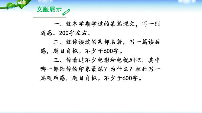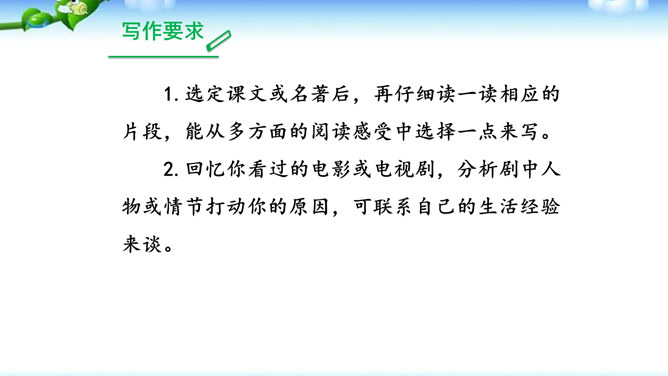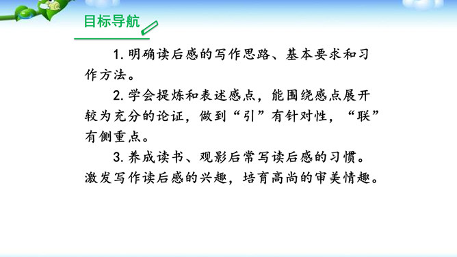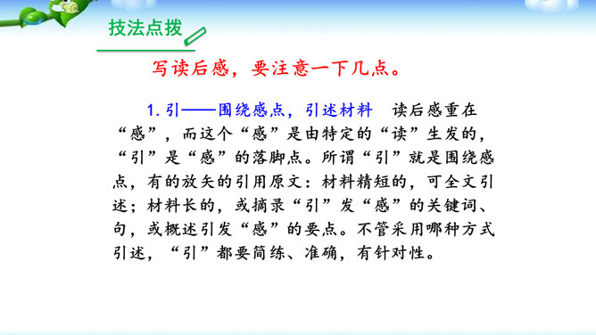 1.明确读后感的写作思路、基本要求和习作方法。2.学会提炼和表述感点,能围绕感点展开较为充分的论证,做到“引”有针对性,“联”有侧重点。3.养成读书、观影后常写读后感的习惯。激发写作读后感的兴趣,培育高尚的审美情趣。1.选定课文或名著后,再仔细读一读相应的片段,能从多方面的阅读感受中选择一点来写。2.回忆你看过的电影或电视剧,分析剧中人物或情节打动你的原因,可联系自己的生活经验来谈。在引出“读”的内容后,要对“读”进行一番评析。既可就事论事对所“引”的内容作一番分析;也可以由现象到本质,由个别到一般的作一番挖掘。所属专题:学写读后感ppt。