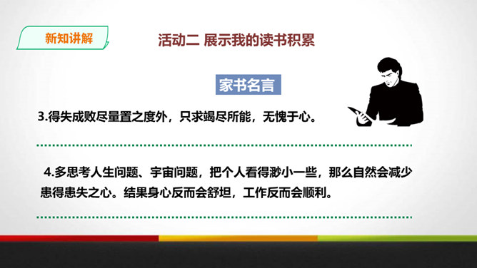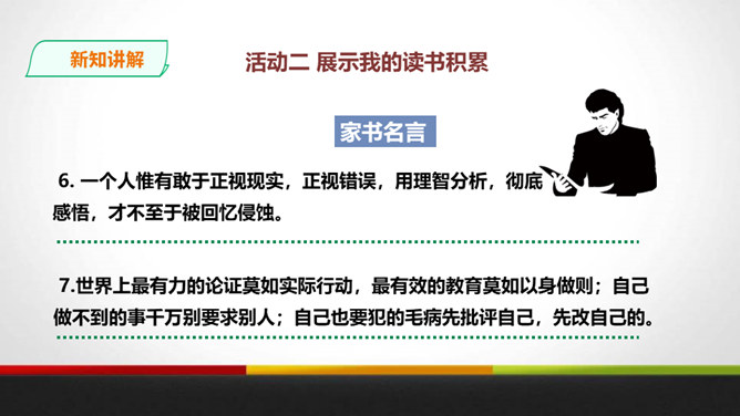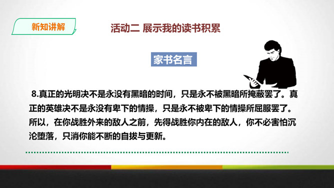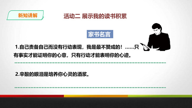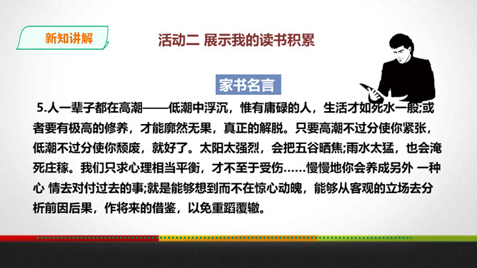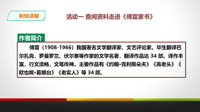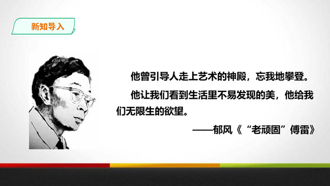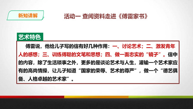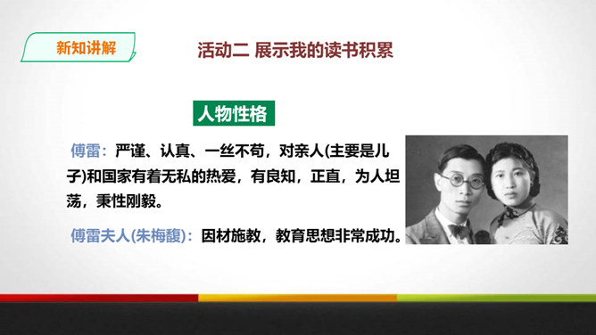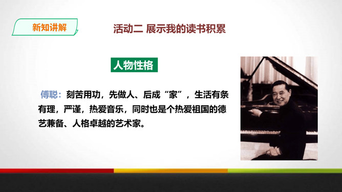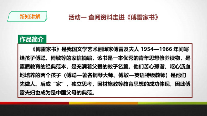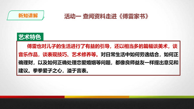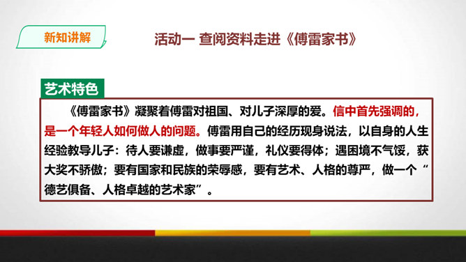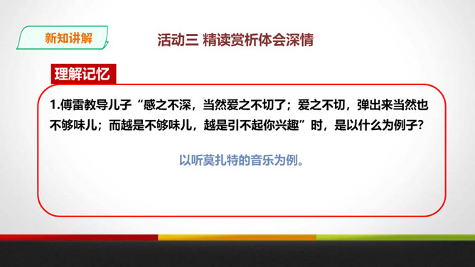 傅雷教导儿子“感之不深,当然爱之不切了;爱之不切,弹出来当然也不够味儿;而越是不够味儿,越是引不起你兴趣”时,是以什么为例子?傅聪虽然在外地演出,但傅雷始终关注儿子在音乐道路上的成长,他使用什么方法提高儿子的艺术修养?通过书信把真情传递给远方的孩子,对儿子的生活和艺术进行真诚地指导,而且还暗暗透露了对儿子的牵挂和爱。对于唐宋人吟诗唱词,中间常加“泛音”,傅雷有怎样的看法?傅雷认为加泛音的唱才有音乐可言。后人把泛音填上实字,反而是音乐的大阻碍。所属专题:傅雷家书ppt。