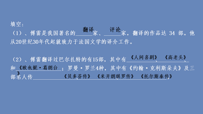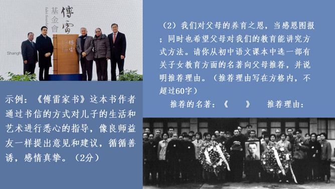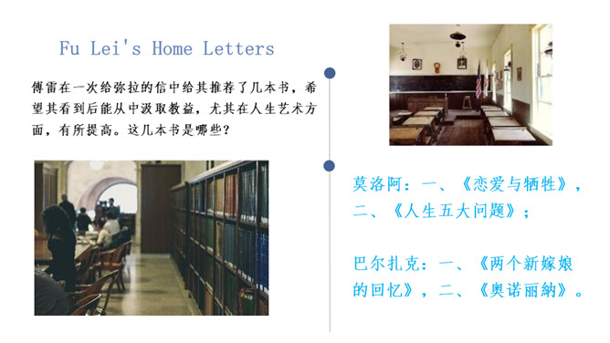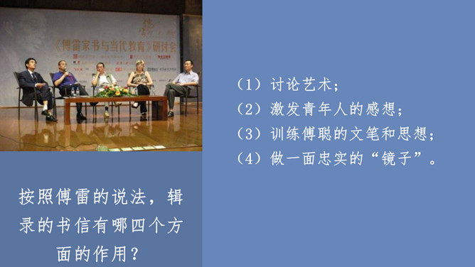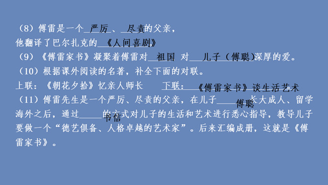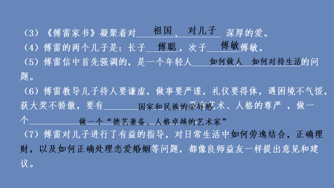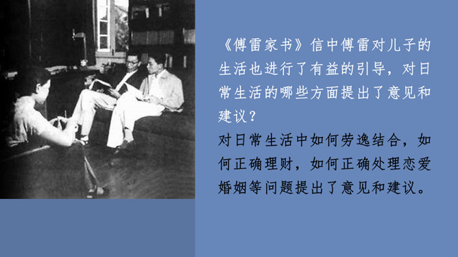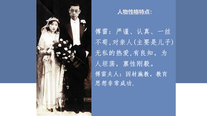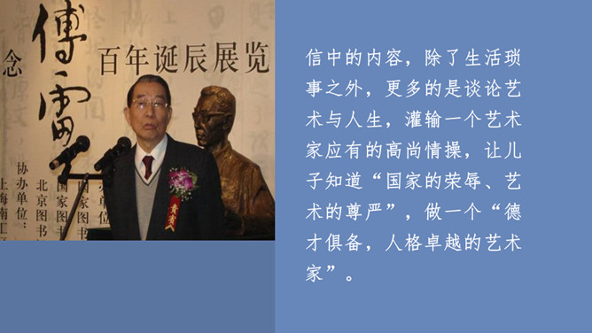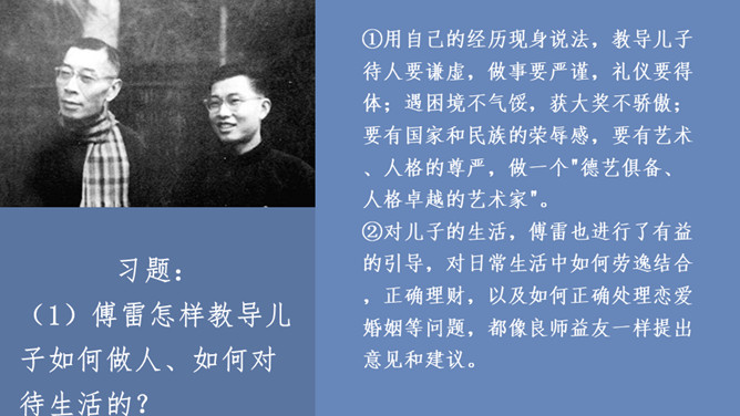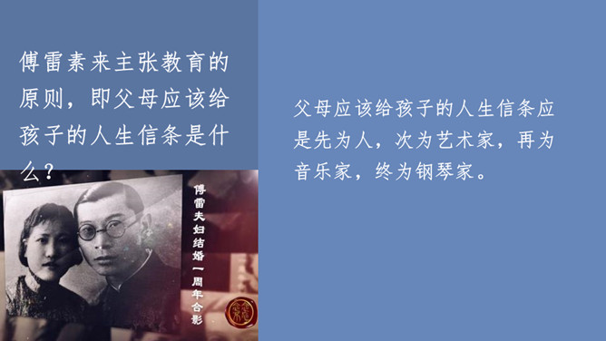 傅雷怎样教导儿子如何做人、如何对待生活的?用自己的经历现身说法,教导儿子待人要谦虚,做事要严谨,礼仪要得体;遇困境不气馁,获大奖不骄傲;要有国家和民族的荣辱感,要有艺术、人格的尊严,做一个"德艺俱备、人格卓越的艺术家"。对儿子的生活,傅雷也进行了有益的引导,对日常生活中如何劳逸结合,正确理财,以及如何正确处理恋爱婚姻等问题,都像良师益友一样提出意见和建议。傅雷素来主张教育的原则,即父母应该给孩子的人生信条是什么?父母应该给孩子的人生信条应是先为人,次为艺术家,再为音乐家,终为钢琴家。所属专题:傅雷家书ppt。