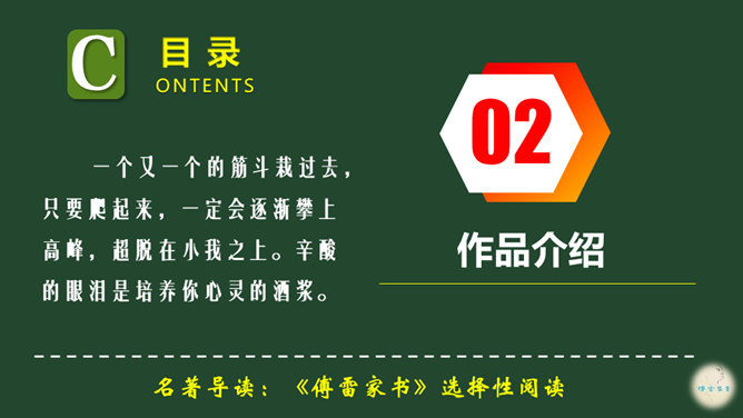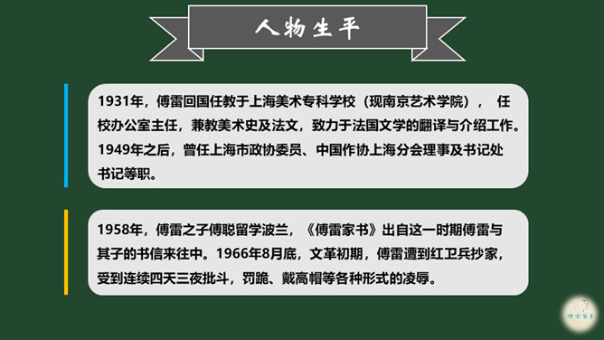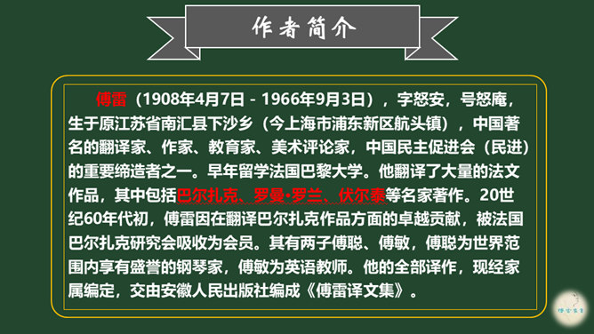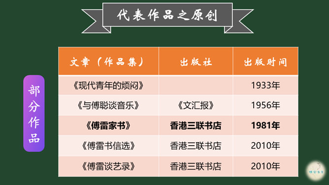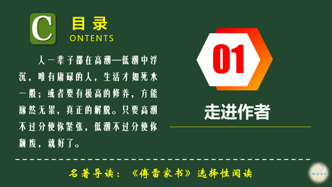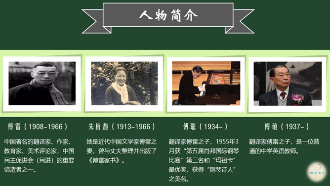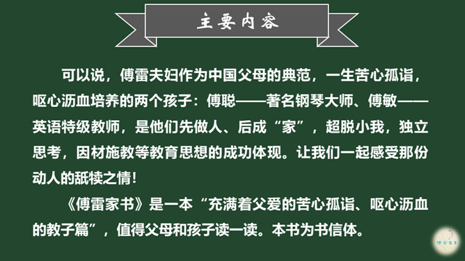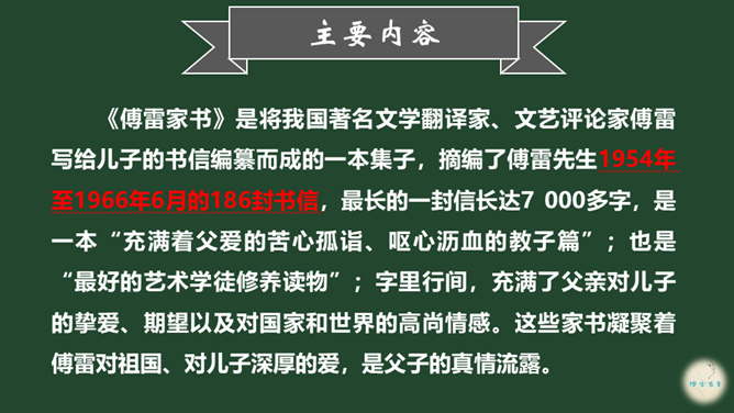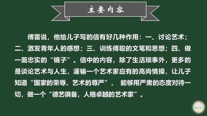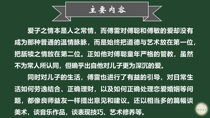 爱子之情本是人之常情,而傅雷对傅聪和傅敏的爱却没有成为那种普通的温情脉脉,而是始终把道德与艺术放在第一位,把舐犊之情放在第二位。正如他对傅聪童年严格的管教,虽然不为常人所认同,但确乎出自他对儿子更为深沉的爱。 同时对儿子的生活,傅雷也进行了有益的引导,对日常生活如何劳逸结合、正确理财,以及如何正确处理恋爱婚姻等问题,都像良师益友一样提出意见和建议。还以相当多的篇幅谈美术,谈音乐作品,谈表现技巧、艺术修养等。信中首先强调的,是一个年轻人如何做人、如何对待生活的问题。所属专题:傅雷家书ppt。