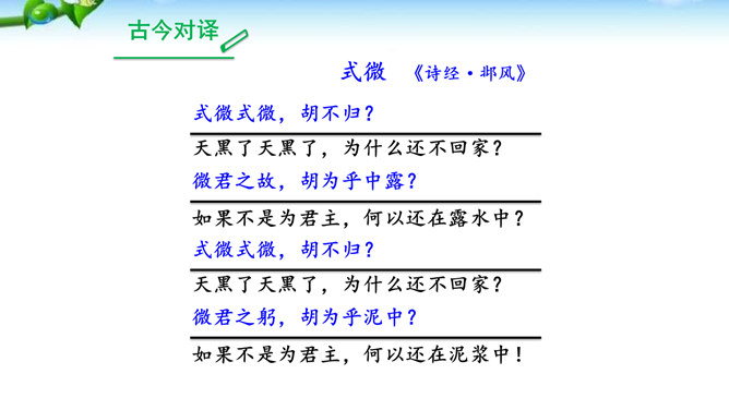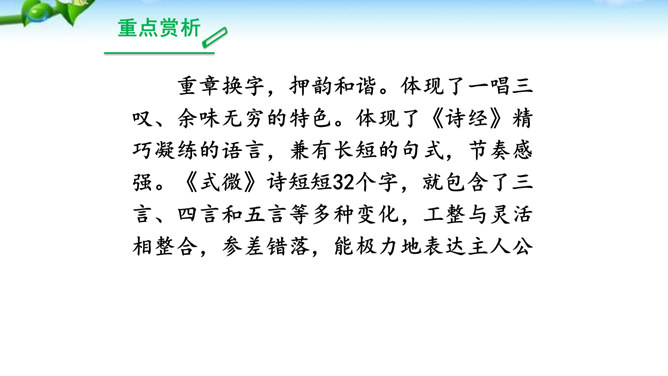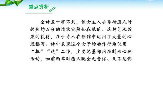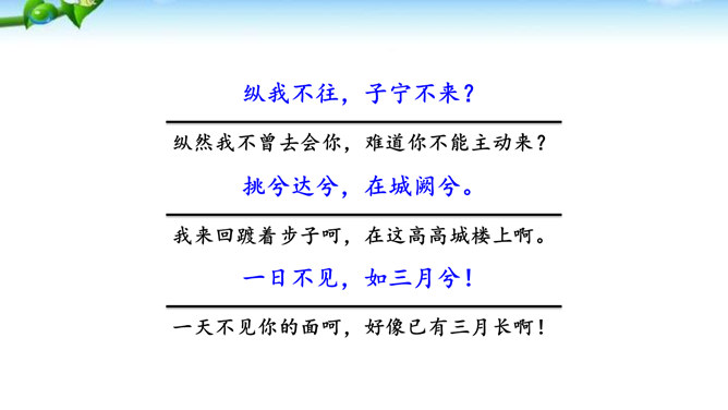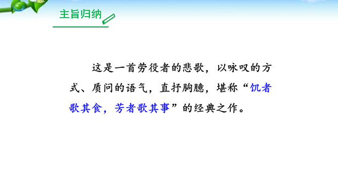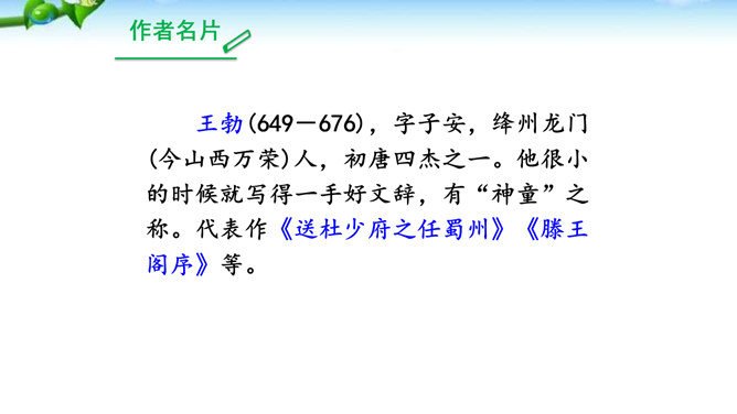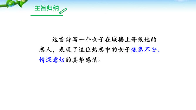 这是一首劳役者的悲歌,以咏叹的方式、质问的语气,直抒胸臆,堪称“饥者歌其食,芳者歌其事”的经典之作。这首诗写一个女子在城楼上等候她的恋人,表现了这位热恋中的女子焦急不安、情深意切的真挚感情。全诗五十字不到,但女主人公等待恋人时的焦灼万分的情状宛然如在眼前。这首诗是送别的名作。诗意慰勉友人勿在离别之时悲哀。起句严整对仗,三、四句以散调承之,以实转虚,文情跌宕。第三联“海内存知己,天涯若比邻”,奇峰突起,高度地概括了“友情深厚,江山难阻”的情景,伟词自铸,传之千古,有口皆碑。