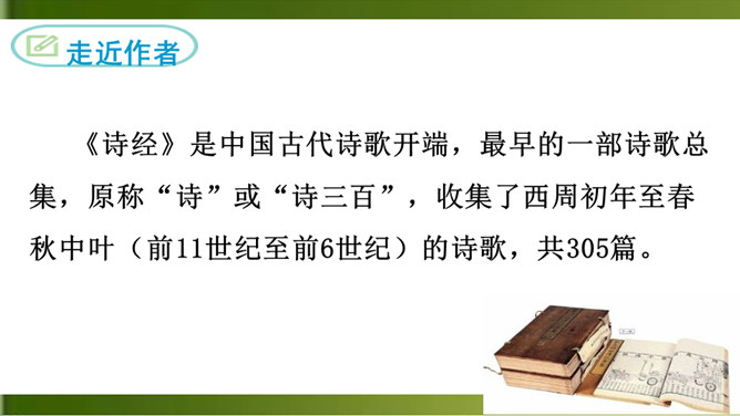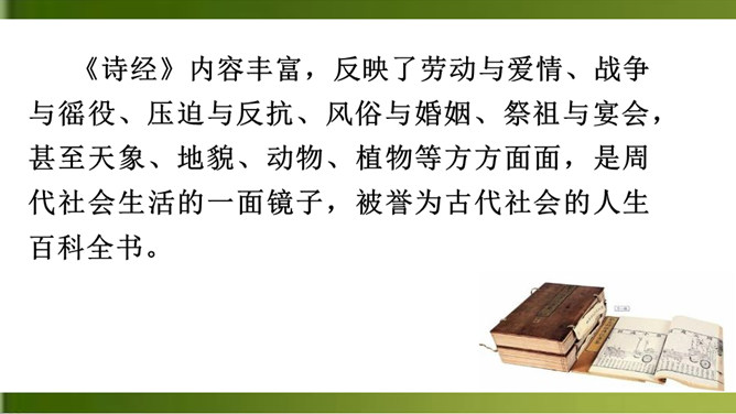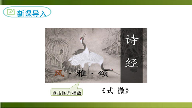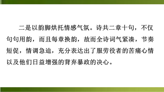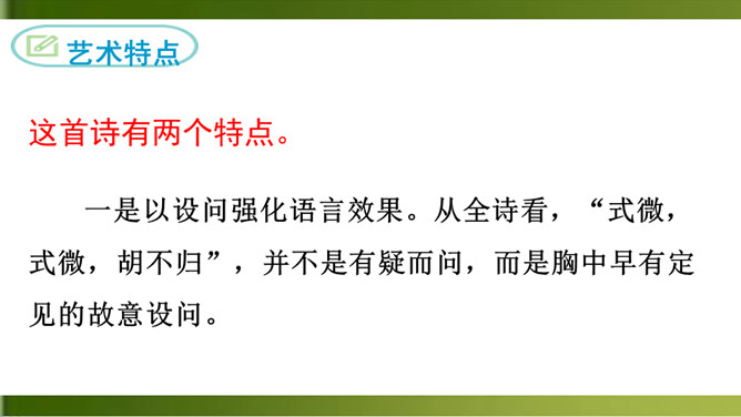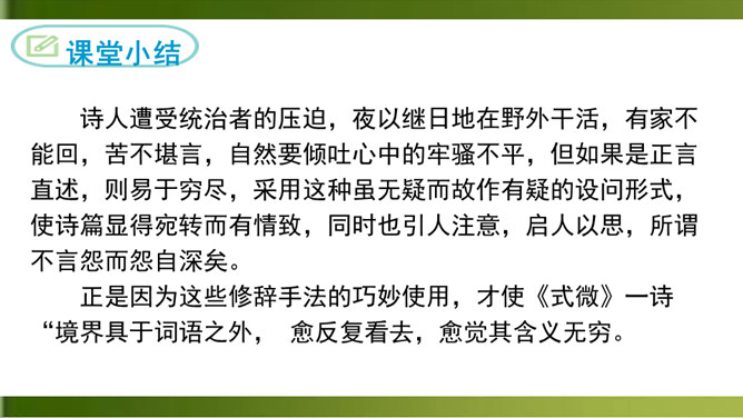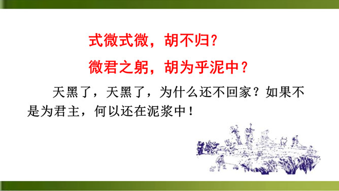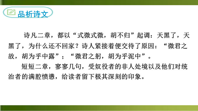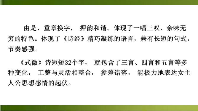 诗凡二章,都以“式微式微,胡不归”起调:天黑了,天黑了,为什么还不回家?诗人紧接着便交待了原因:“微君之故,胡为乎中露”;“微君之躬,胡为乎泥中”。短短二章,寥寥几句,受奴役者的非人处境以及他们对统治者的满腔愤懑,给读者留下极其深刻的印象。 由是,重章换字, 押韵和谐。体现了一唱三叹、余味无穷的特色。体现了《诗经》精巧凝练的语言,兼有长短的句式, 节奏感强。《式微》诗短短32个字, 就包含了三言、四言和五言等多种变化, 工整与灵活相整合, 参差错落, 能极力地表达女主人公思想感情的起伏。所属专题:式微ppt。