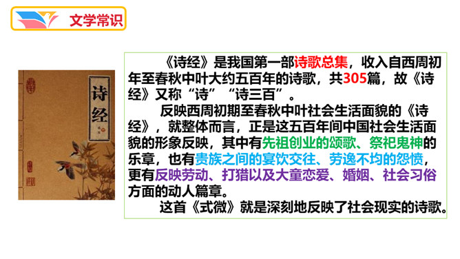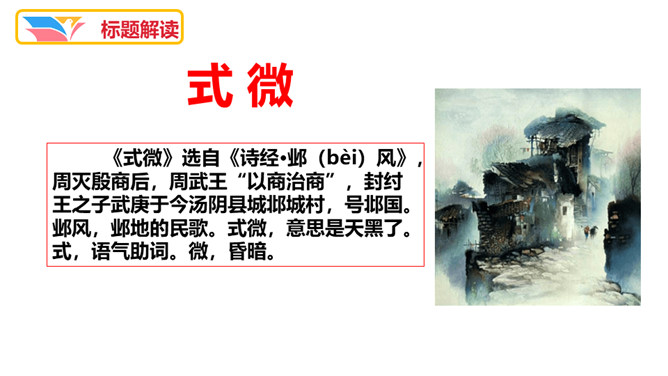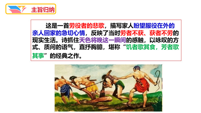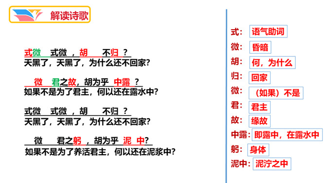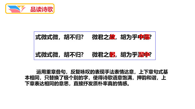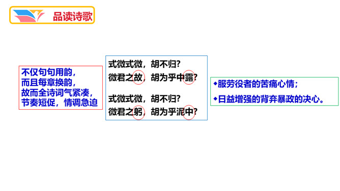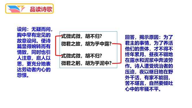 设问:无疑而问,胸中早有定见的故意设问。使诗篇显得婉转而有情致,同时也引人注意,启人以思,更充分地表达劳动者内心的怨恨。回答,揭示原因:为了君主的事情,为了养活他们的贵体,才不得不终年累月、昼夜不辍地在露水和泥浆中奔波劳作。诗人遭受统治者的压迫,夜以继日地在野外干活,有家不能回,苦不堪言,自然要倾吐心中的牢骚不平。运用重章叠句,反复咏叹的表现手法表情达意,上下章句式基本相同,只替换了极个别的字,使得诗歌语意饱满,押韵和谐,上下章表达相同的意思,直接抒发质朴率真的情感。所属专题:式微ppt。
