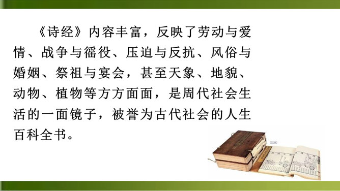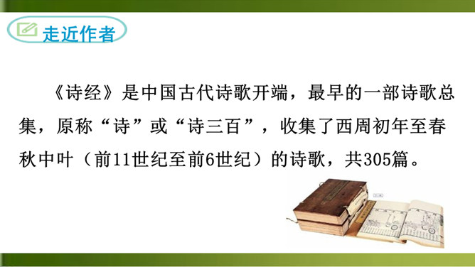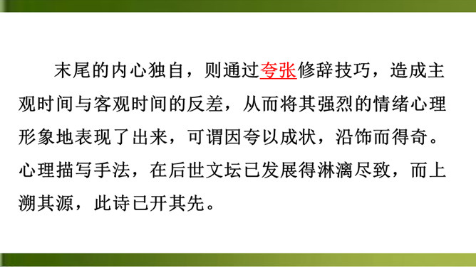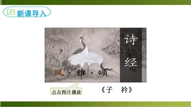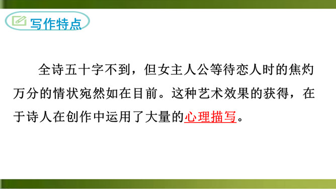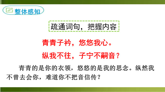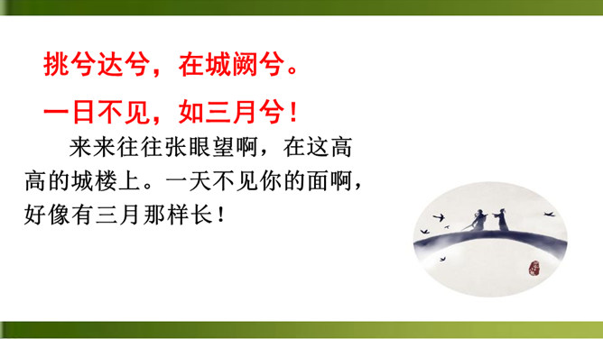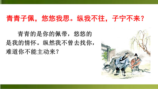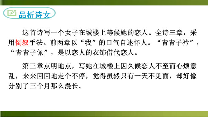 这首诗写一个女子在城楼上等候她的恋人。全诗三章,采用倒叙手法。前两章以“我”的口气自述怀人。“青青子衿”,“青青子佩”,是以恋人的衣饰借代恋人。第三章点明地点,写她在城楼上因久候恋人不至而心烦意乱,来来回回地走个不停,觉得虽然只有一天不见面,却好像分别了三个月那么漫长。全诗五十字不到,但女主人公等待恋人时的焦灼万分的情状宛然如在目前。这种艺术效果的获得,在于诗人在创作中运用了大量的心理描写。末尾的内心独自,则通过夸张修辞技巧,造成主观时间与客观时间的反差,从而将其强烈的情绪心理形象地表现了出来。所属专题:子衿ppt。