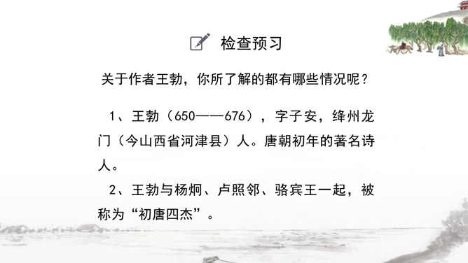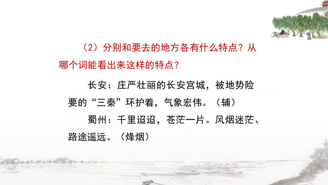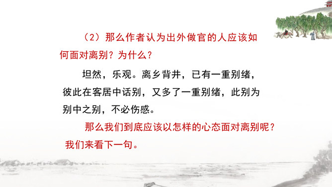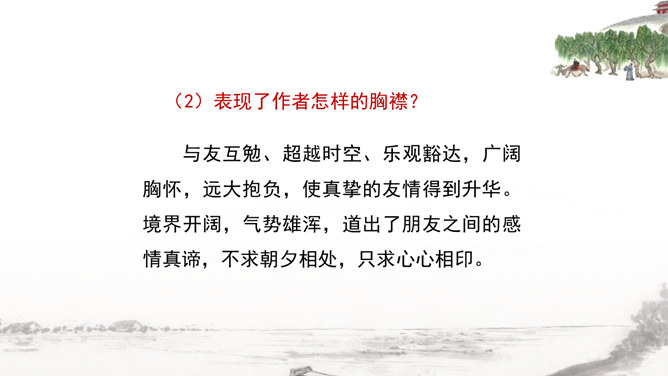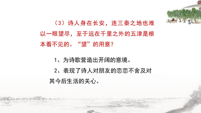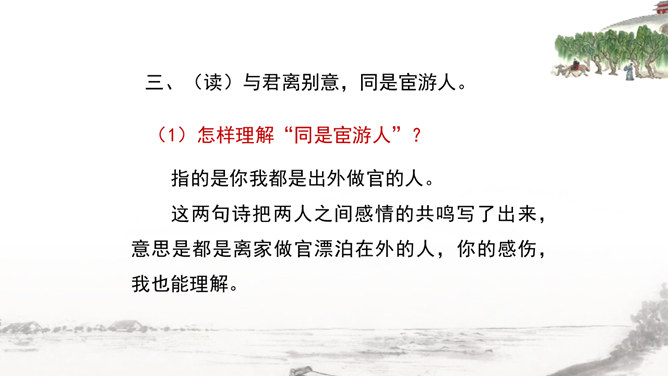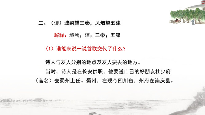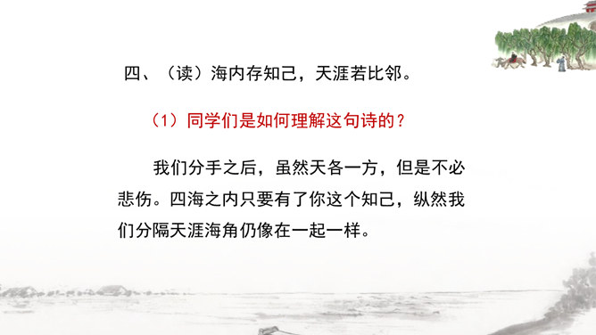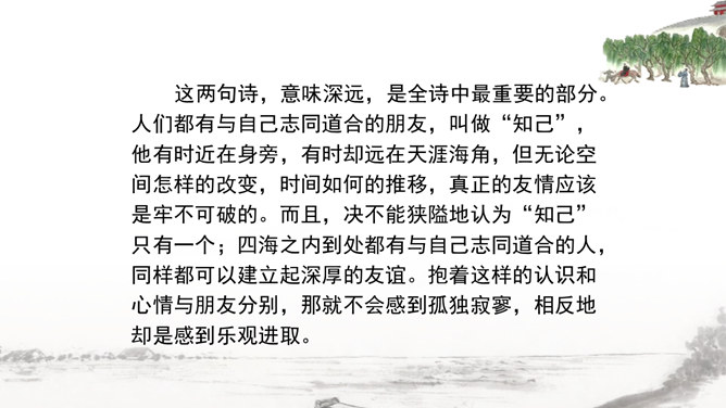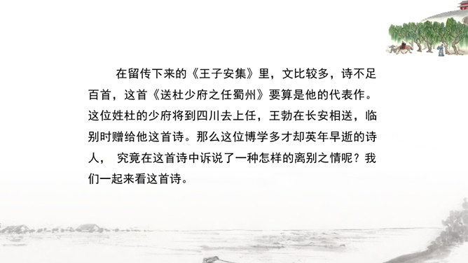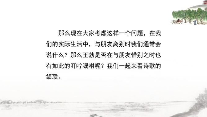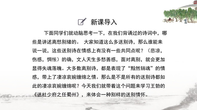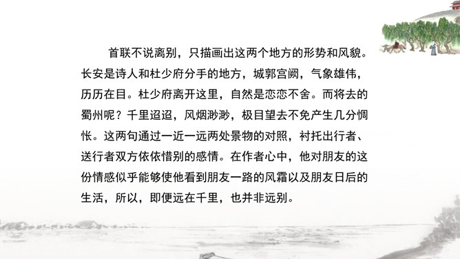 下面同学们就动脑思考一下,在我们背诵过的诗词中,哪些是讲述离愁别绪的。 大家知道这么多送别诗,那么谁能来说一说,这些送别诗在情感上有没有一些共同点呢?(悲凉,伤感,惆怅)的确,文人天生多愁善感,面对离别,就会更加显得失魂落魄。大多数离别诗,都是表现了“黯然销魂”的情感,带上了凄凉哀婉缠绵之情。那么是不是所有的送别诗都如此的凄凉哀婉缠绵呢?今天我们就带着这个问题来学习王勃的诗,来体会一种别样的送别情怀。尾联由前三联层层逼出,既非远别,又同为宦游,虽别而如比邻。所属专题:送杜少府之任蜀州ppt。