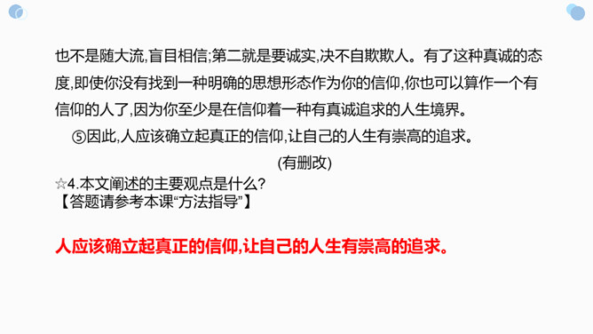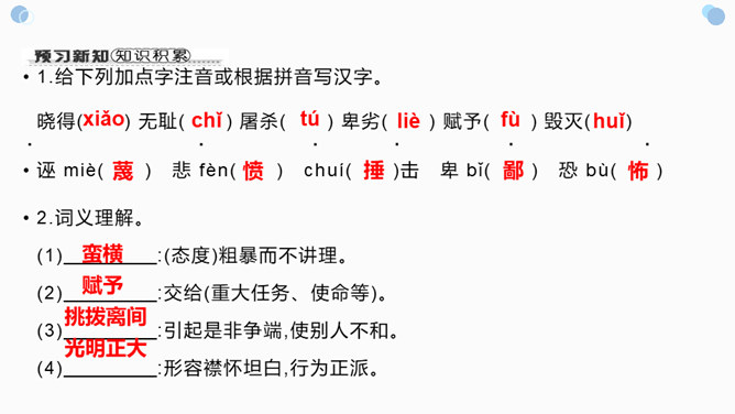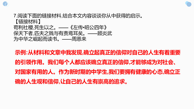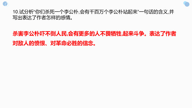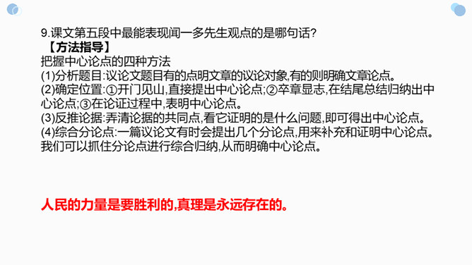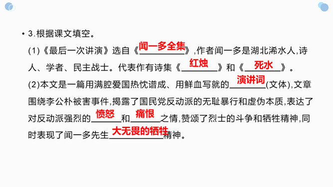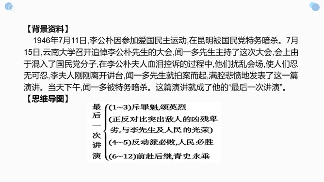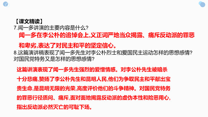 闻一多讲演的主要内容是什么?闻一多在李公朴的追悼会上,义正词严地当众揭露、痛斥反动派的罪恶和卑劣?表达了对民主和平的坚定信心。这篇演讲稿表现了闻一多先生对李公朴烈士和爱国民主运动怎样的思想感情?对国民党特务又是怎样的思想感情?这篇讲演表现了闻一多先生强烈的爱憎情感。对李公朴先生被暗杀十分悲痛,赞扬了李公朴先生和昆明人民,他们为争取民主和平献出宝贵生命,是昆明无限的光荣,高度评价他们的斗争精神。对国民党特务的罪恶行径质问、痛斥,面对面地揭露反动派的虚伪本性和险恶用心,指出反动派必然灭亡的可耻下场。所属专题:最后一次讲演ppt。