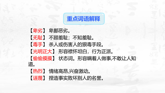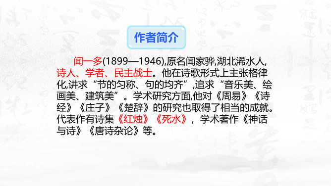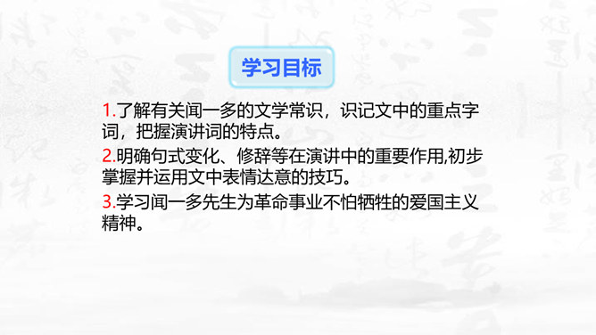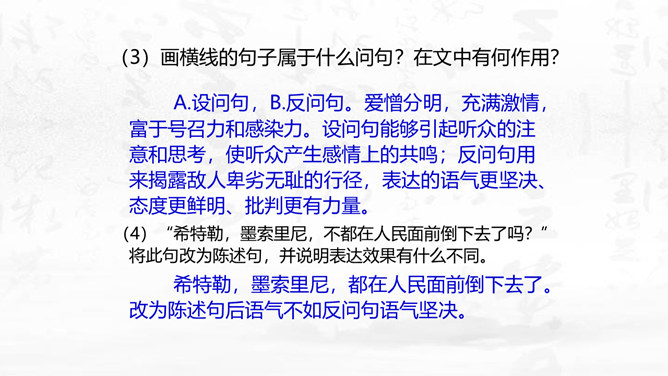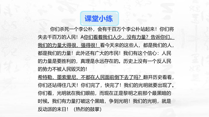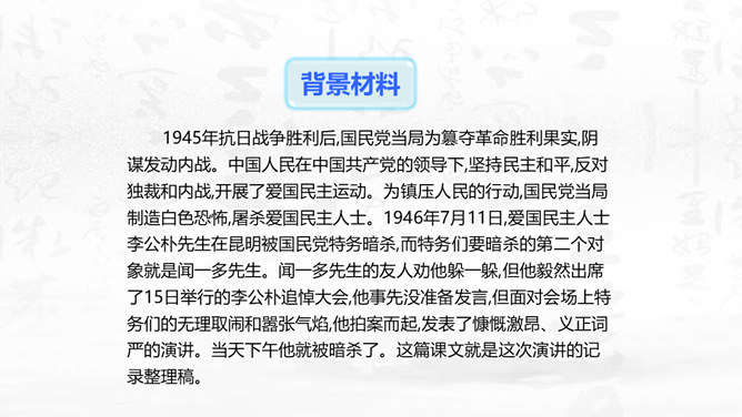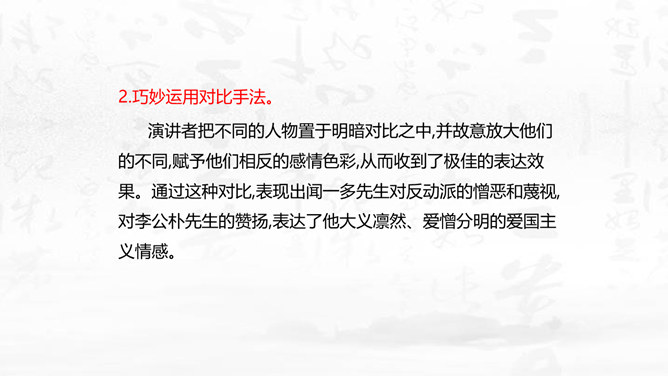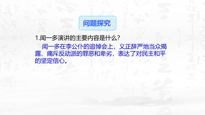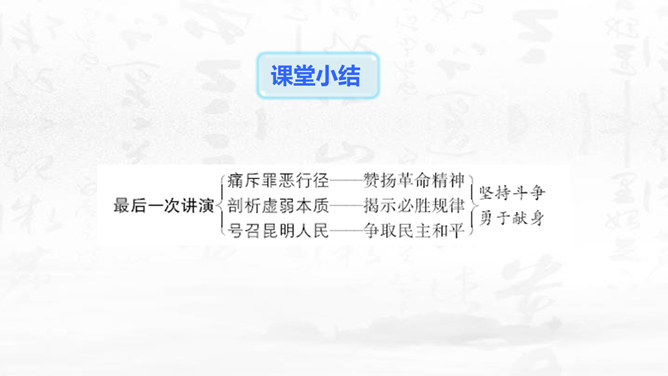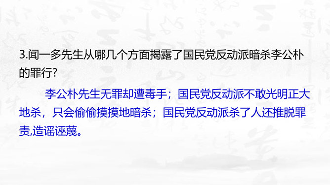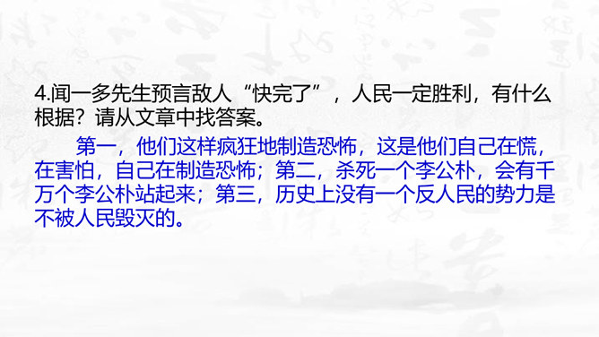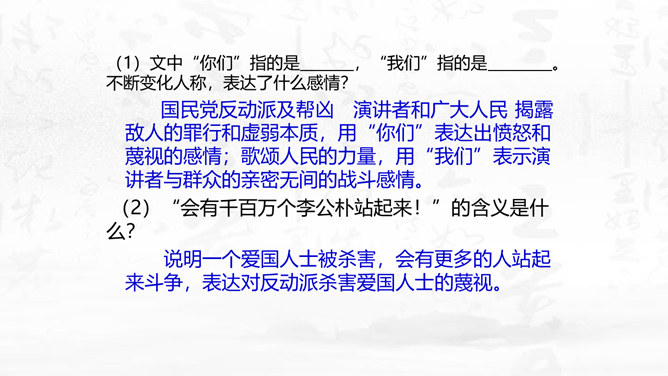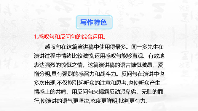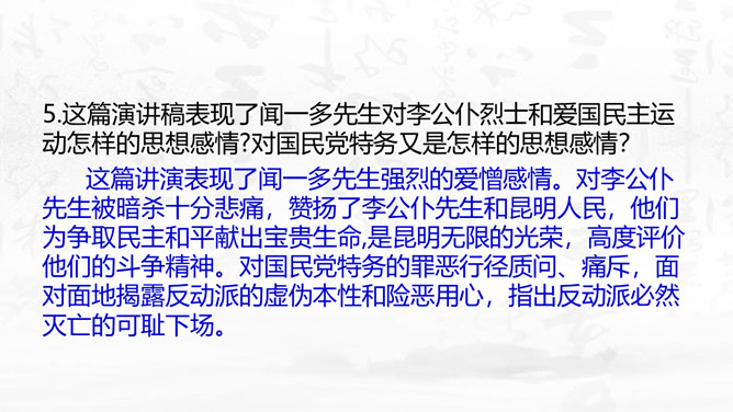 这篇演讲稿表现了闻一多先生对李公仆烈士和爱国民主运动怎样的思想感情?对国民党特务又是怎样的思想感情? 这篇讲演表现了闻一多先生强烈的爱憎感情。对李公仆先生被暗杀十分悲痛,赞扬了李公仆先生和昆明人民,他们为争取民主和平献出宝贵生命,是昆明无限的光荣,高度评价他们的斗争精神。对国民党特务的罪恶行径质问、痛斥,面对面地揭露反动派的虚伪本性和险恶用心,指出反动派必然灭亡的可耻下场。感叹句在这篇演讲稿中使用得最多。闻一多先生在演讲过程中情绪比较激愤,运用感叹句能够直观、有效地表达强烈的愤慨之情。所属专题:最后一次讲演ppt。
