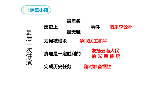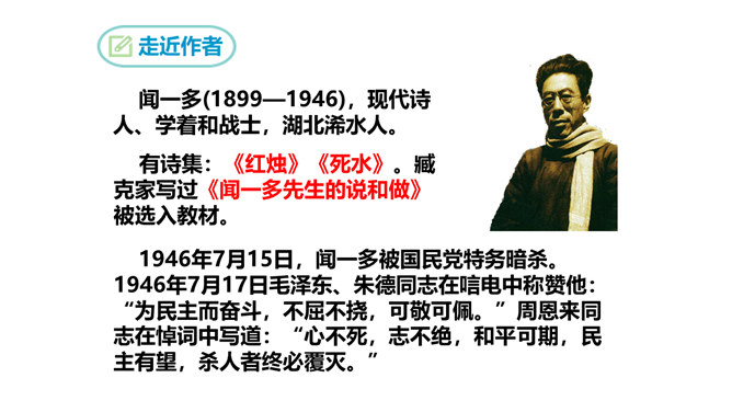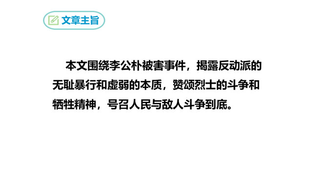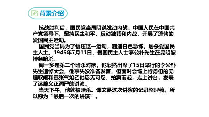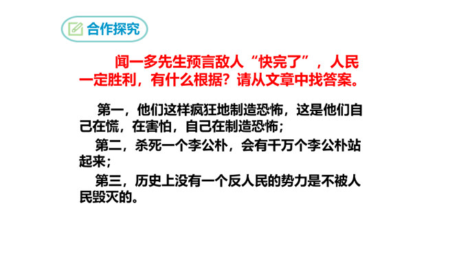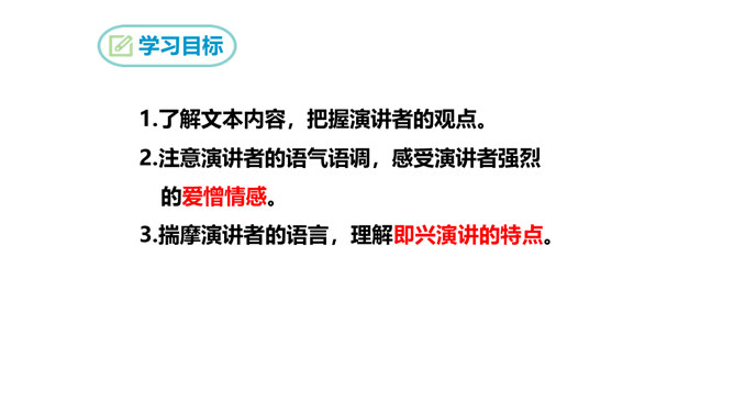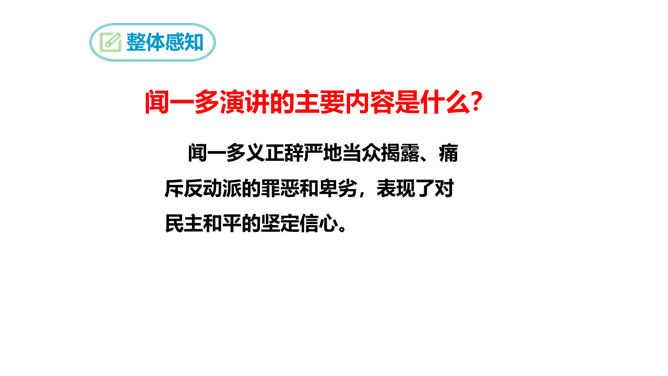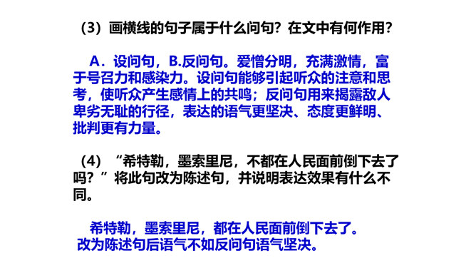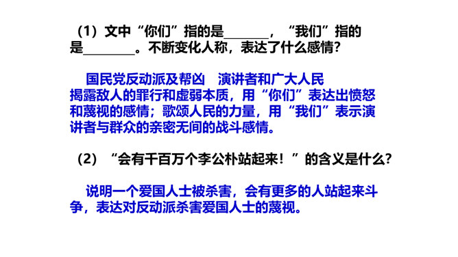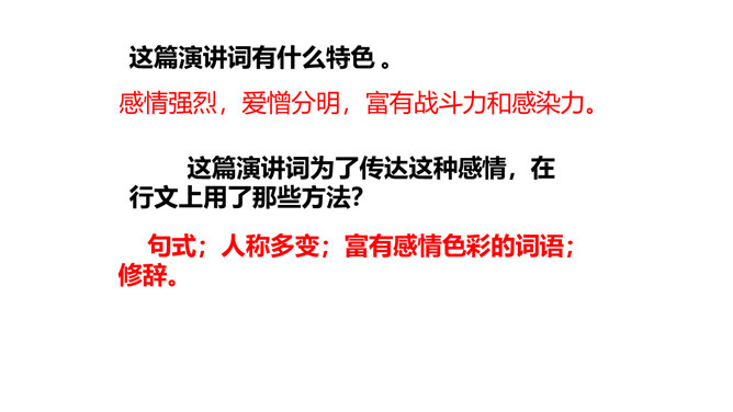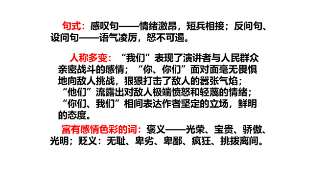 这篇演讲词为了传达这种感情,在行文上用了那些方法?句式;人称多变;富有感情色彩的词语;修辞。句式:感叹句——情绪激昂,短兵相接;反问句、设问句——语气凌厉,怒不可遏。人称多变:“我们”表现了演讲者与人民群众亲密战斗的感情;“你、你们”面对面毫无畏惧地向敌人挑战,狠狠打击了敌人的嚣张气焰;“他们”流露出对敌人极端愤怒和轻蔑的情绪;“你们、我们”相间表达作者坚定的立场,鲜明的态度。富有感情色彩的词:褒义——光荣、宝贵、骄傲、光明;贬义:无耻、卑劣、卑鄙、疯狂、挑拨离间。所属专题:最后一次讲演ppt。