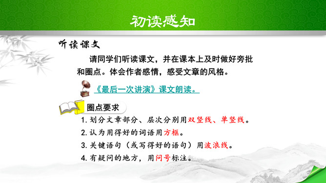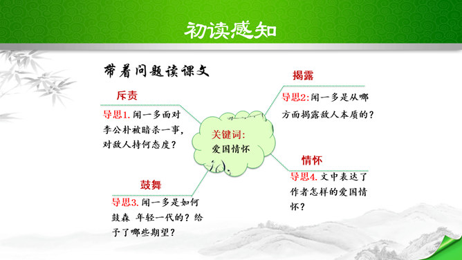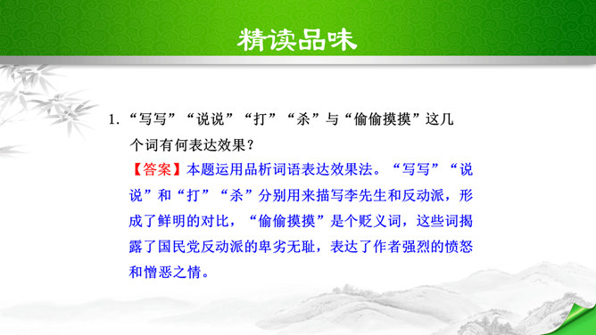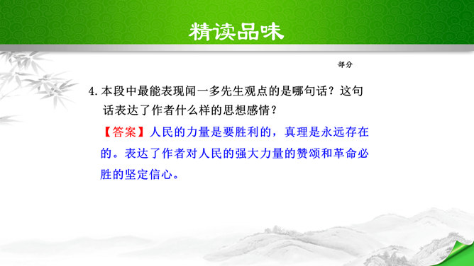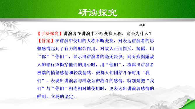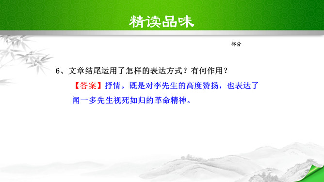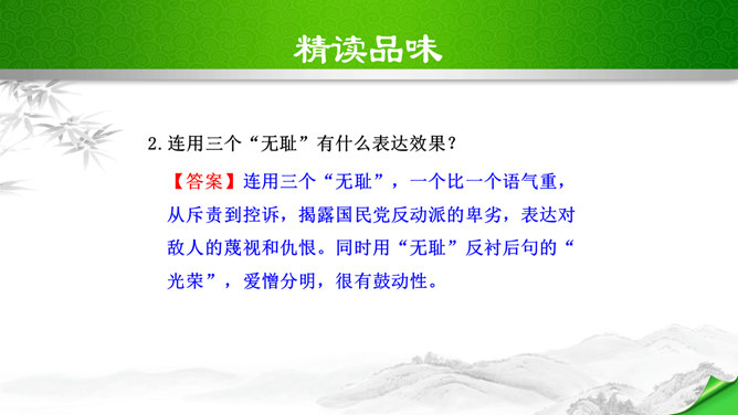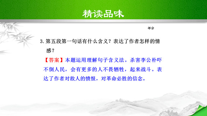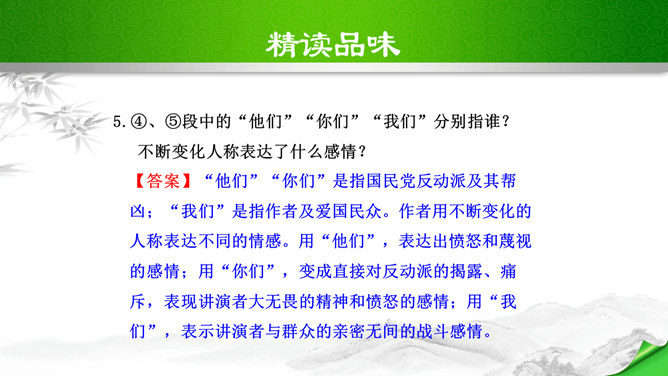 叹句、反问句的使用,给讲演增加了强烈的表达效果,感叹句在文中用得最多,如“这几天,大家晓得,在昆明出现了历史上最卑劣最无耻的事情!”“为什么要打杀,而且又不敢光明正大的来打来打,而偷偷摸摸的来暗杀!(鼓掌)”“无耻啊!无耻啊!”等等,又如第四段“特务们,你们想想,你们还有几天?”运用反问句,指出了特务们将面对的可耻下场,表达了强烈的憎恨感情。感叹句和反问句的使用,表达了作者强烈的感情,控诉的愤怒,讽刺的辛辣,对李先生的赞扬,对人民力量的歌颂,对光明前途的展望,都得到了很好的表达,有强烈的号召力和感染力。所属专题:最后一次讲演ppt。