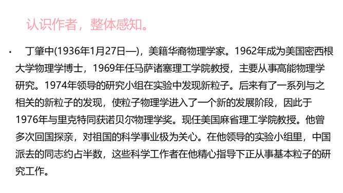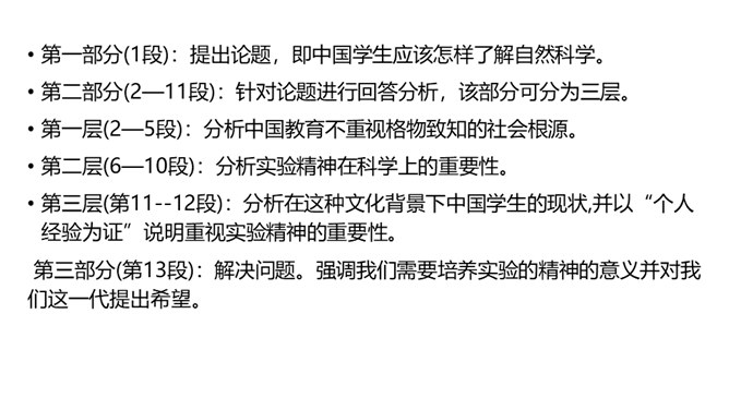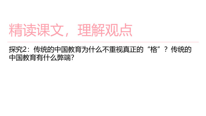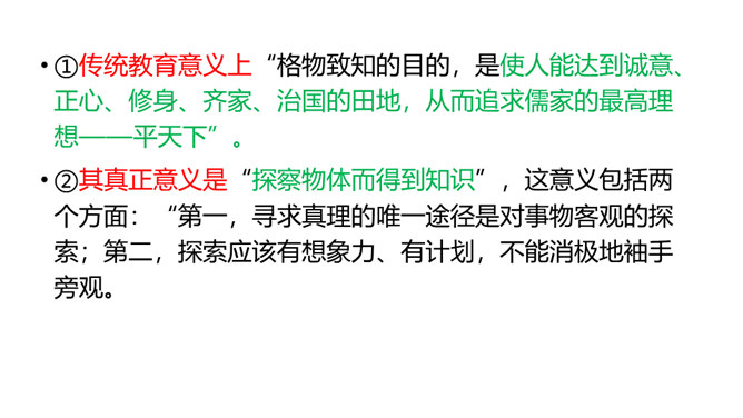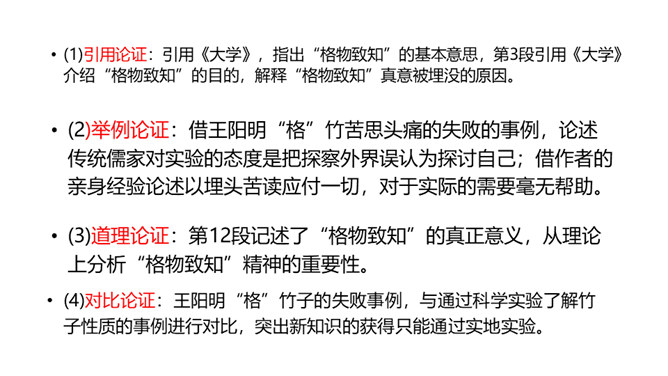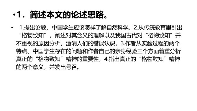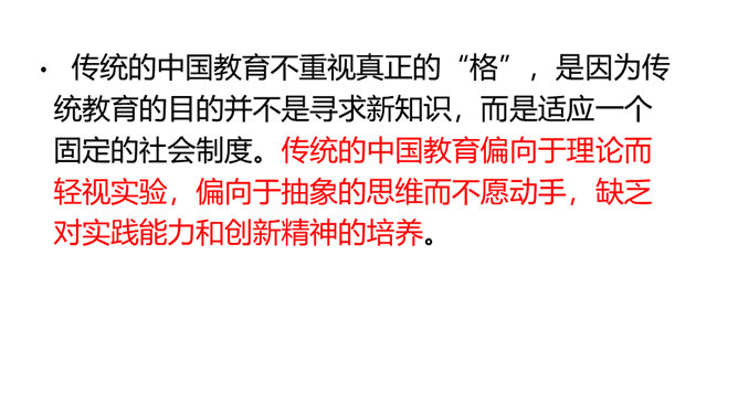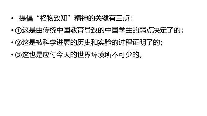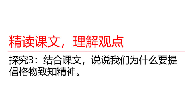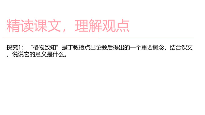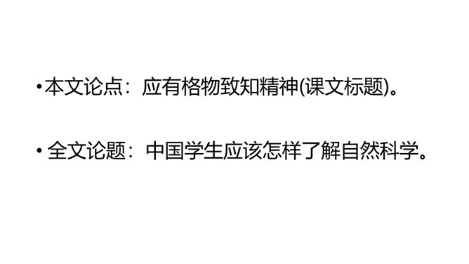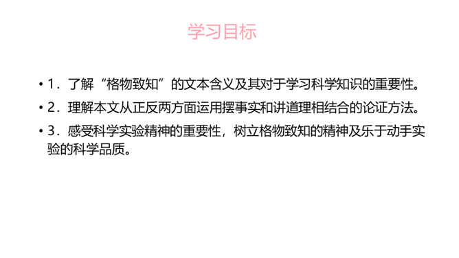 1.了解“格物致知”的文本含义及其对于学习科学知识的重要性。2.理解本文从正反两方面运用摆事实和讲道理相结合的论证方法。3.感受科学实验精神的重要性,树立格物致知的精神及乐于动手实验的科学品质。速读课文,结合课文批注,找出标示论题的语句、表达作者观点的句子。“格物致知”是丁教授点出论题后提出的一个重要概念,结合课文,说说它的意义是什么。传统教育意义上“格物致知的目的,是使人能达到诚意、正心、修身、齐家、治国的田地,从而追求儒家的最高理想——平天下”。所属专题:应有格物致知精神ppt。